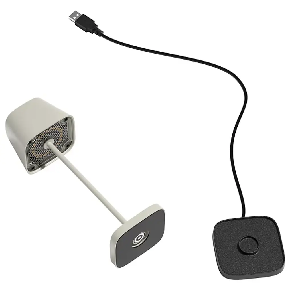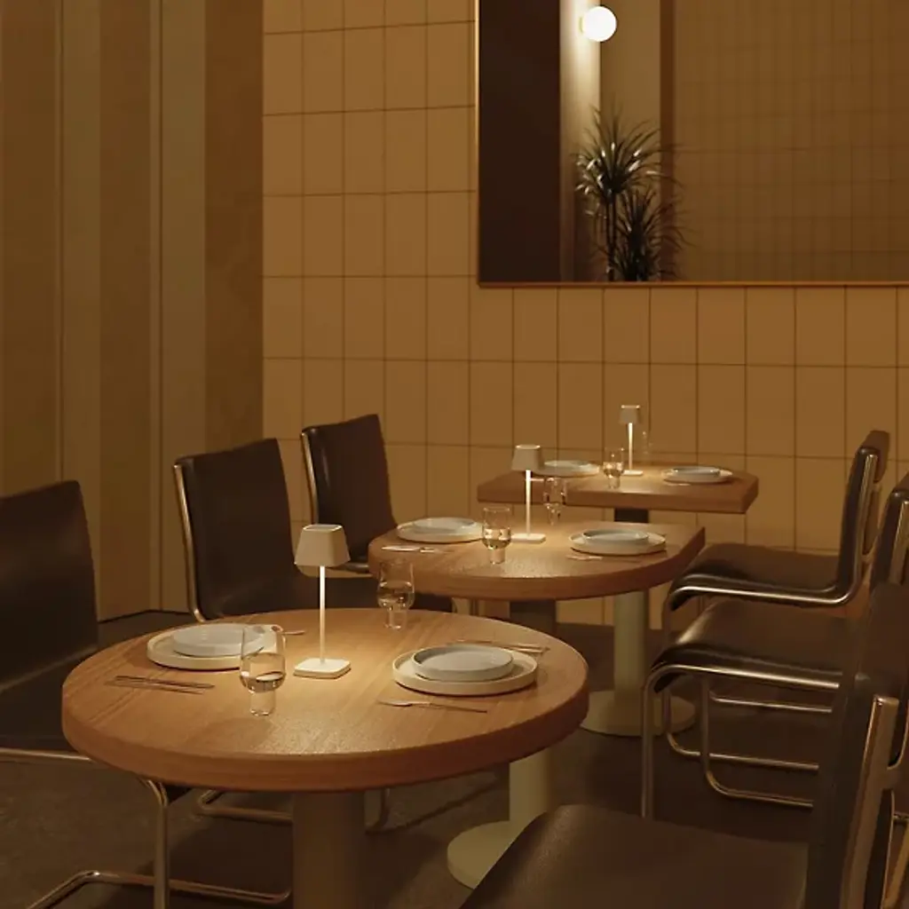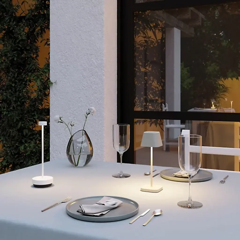 The Kodu LED Mini Table Lamp from Blomus is perfect for adding a focused wash of reflected radiance and downlight to dining tables, sideboards, or desk spaces. A rechargeable minimalist construction that can stand free from cords and cables, it uses a curve-cornered square base to support a slim stem, made of powder-coated aluminum. A flared shade surrounds wet-listed LED lamping at the top, activated via a head switch, and offering hours of ample ambiance while shifting between three warm light settings.