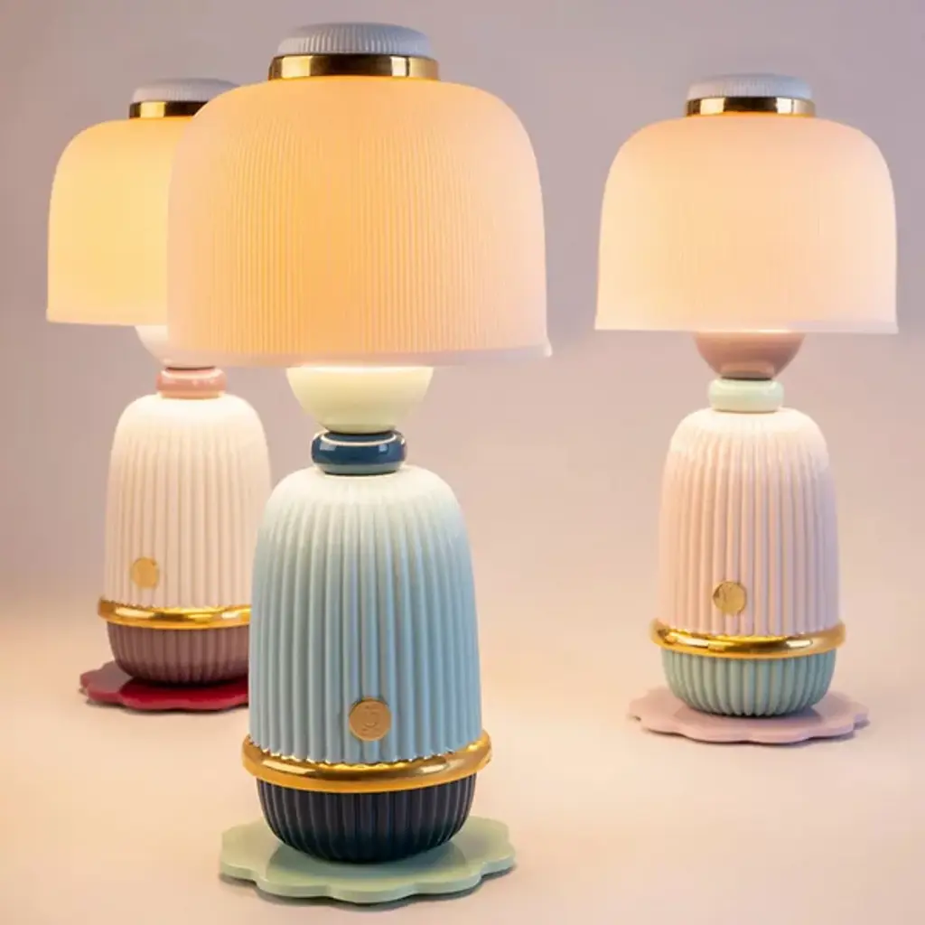 The Kokeshi LED Table Lamp from Lladro is designed by Robert Schnyder. It brings a transitional sense of style to your living space. Kokeshi takes its stylistic inspiration from dolls found in the Tohoku region of Japan. Your table lamp features a rounded motif and boasts a ribbed appearance that draws your eye. This fixture is composed of exquisite porcelain and metal, bringing refinement to your décor. The crowning shade nicely tempers the integrated LED light. Conveniently recharge the table lamp’s battery via micro USB-5V.