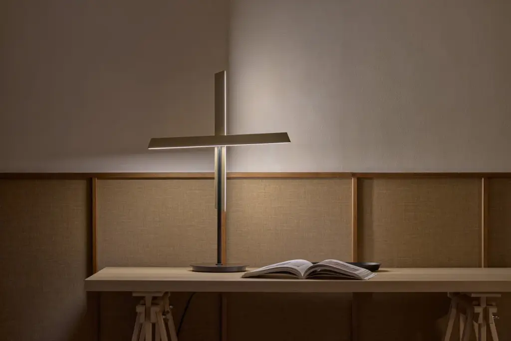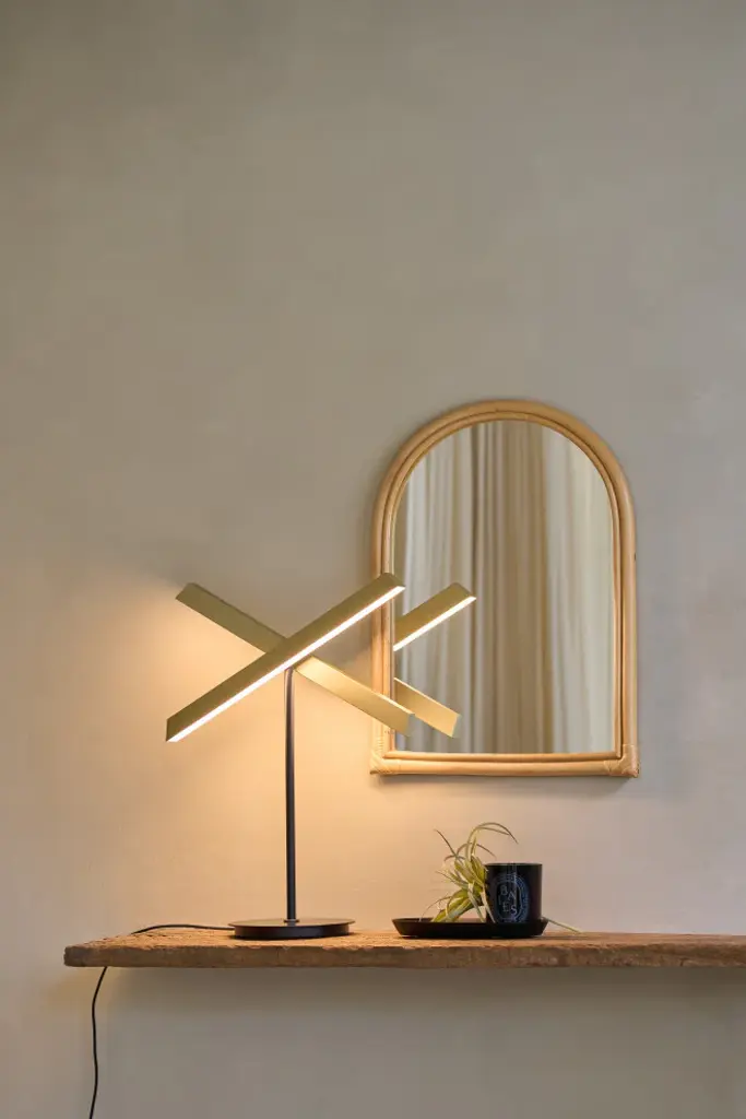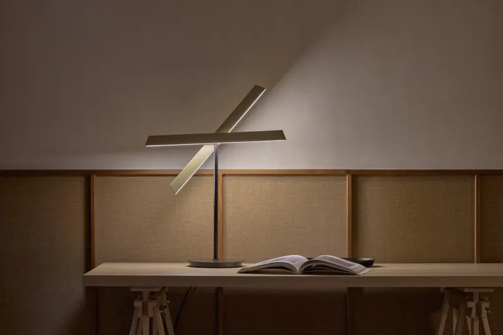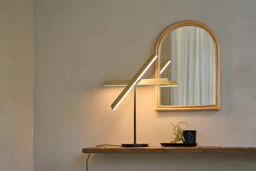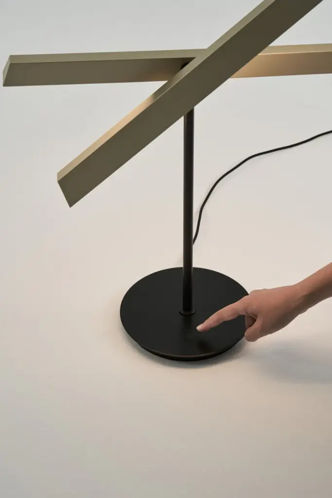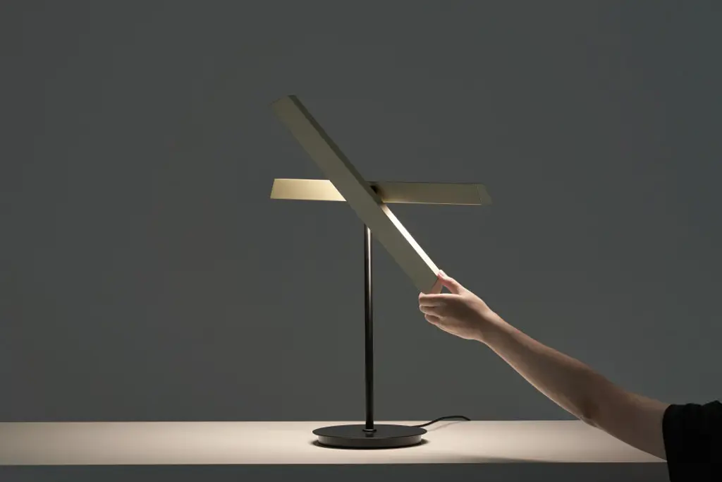 Inspired by modernist architecture, the Konnect table lamp masterfully balances functional illumination with ambient lighting. Its design features two light panels that rotate an impressive 300 degrees each, allowing for versatile light distribution. Additionally, the lamp offers seamless dimming capabilities with just a touch of a button, providing precise control over your lighting needs.