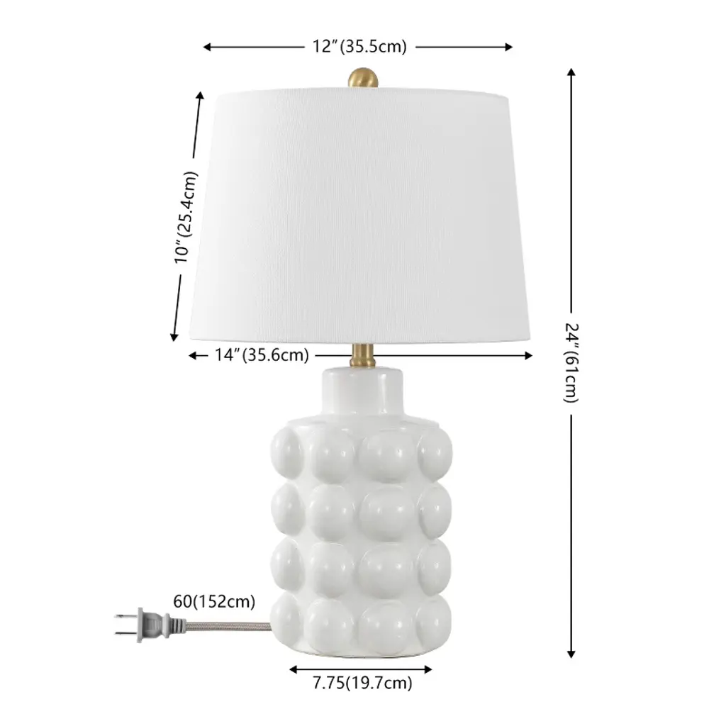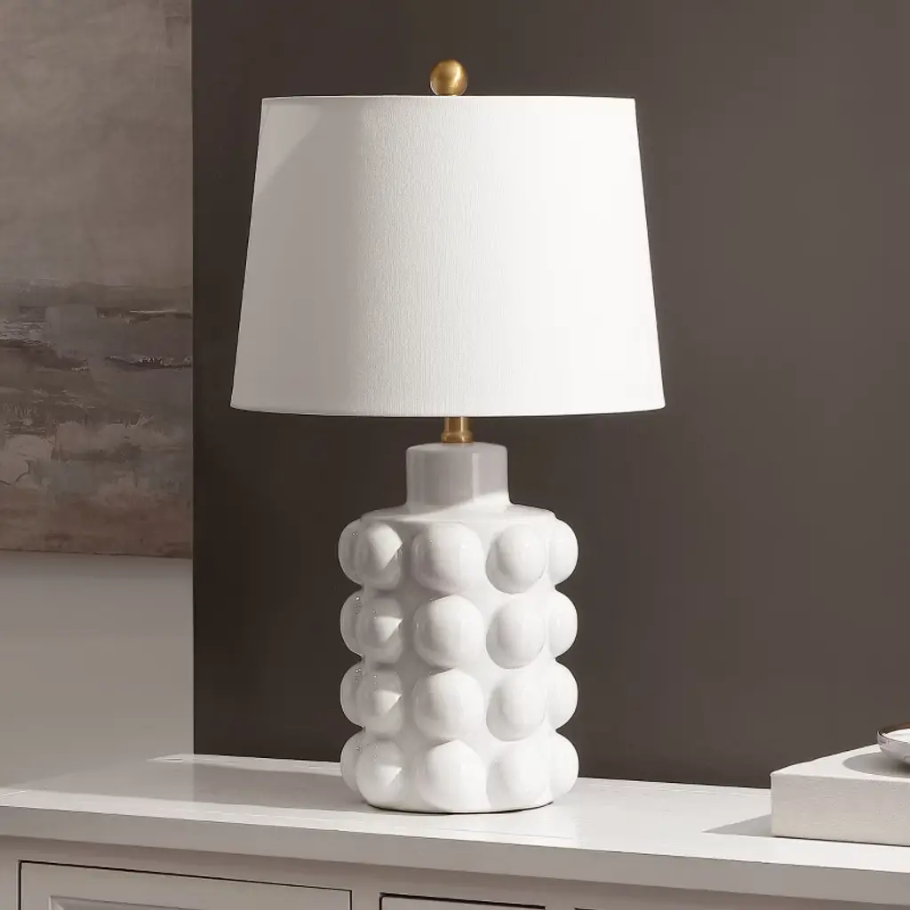 Illuminate your space with the KONNY 24 inch antique white ceramic table lamp. This elegant piece combines a ceramic body with a fabric shade, creating a timeless addition to your decor. The lamp's sophisticated antique white finish complements any interior style, enhancing the atmosphere with its gentle glow. Its practical 24 inch height makes it a versatile choice for living rooms, bedrooms, or offices. Add a touch of charm to your home with this beautifully crafted lamp, designed to blend seamlessly into both modern and classic settings. Transform your room with the warm and inviting light of the KONNY table lamp.
