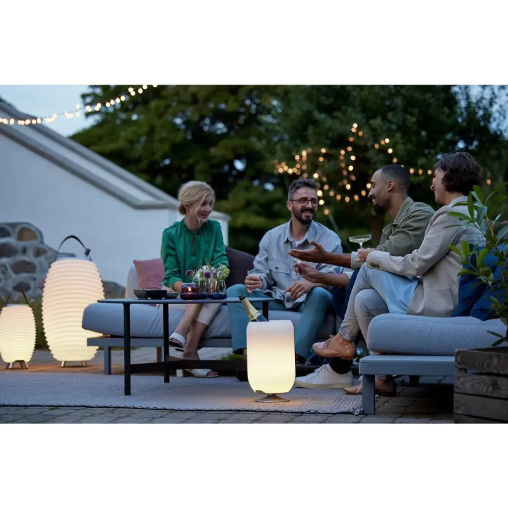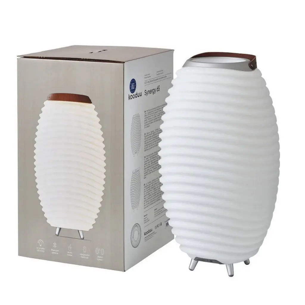 Synergy is a dimmable 4 intensity designer LED lamp, bluetooth speaker and a drink holder or wine cooler all in one. The Synergy speakers sounds as good as it looks thanks to Kooduu's Bright Sound Technology, a module that combines warm light and high quality, balanced audio. It is available in 2 different sizes and 100% portable thanks to its rechargeable battery. The 22" version fits 1 bottle & the 28" version fits 2 bottles. Relax, enjoy, celebrate, decorate and create great memories in style with the touch of a button indoors or outdoors. These speaker lamps with a drink holder are the best ally for spontaneous house parties, cozy date nights, relaxing summer evenings, and much more.