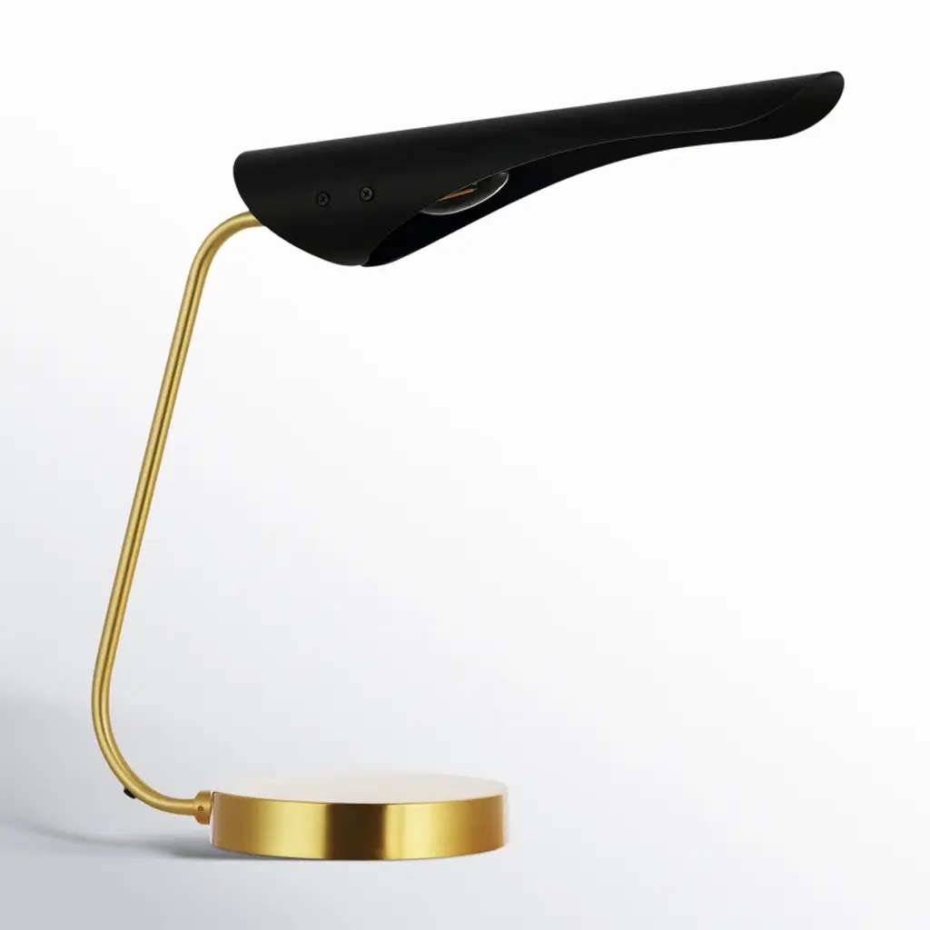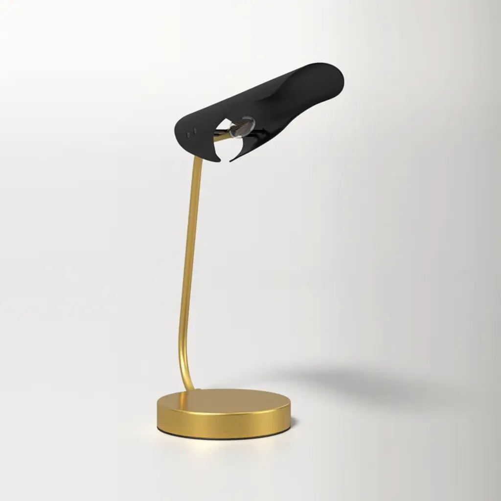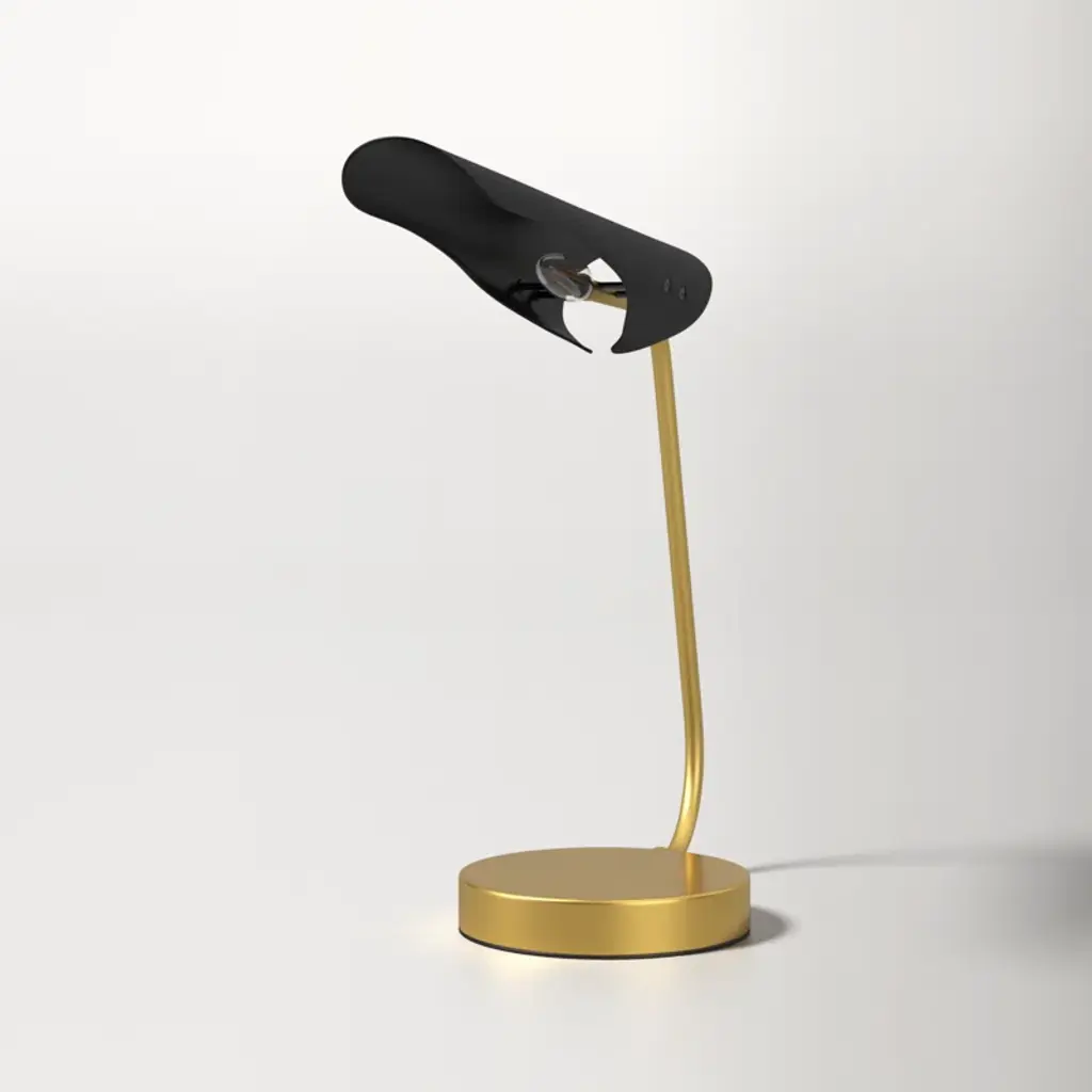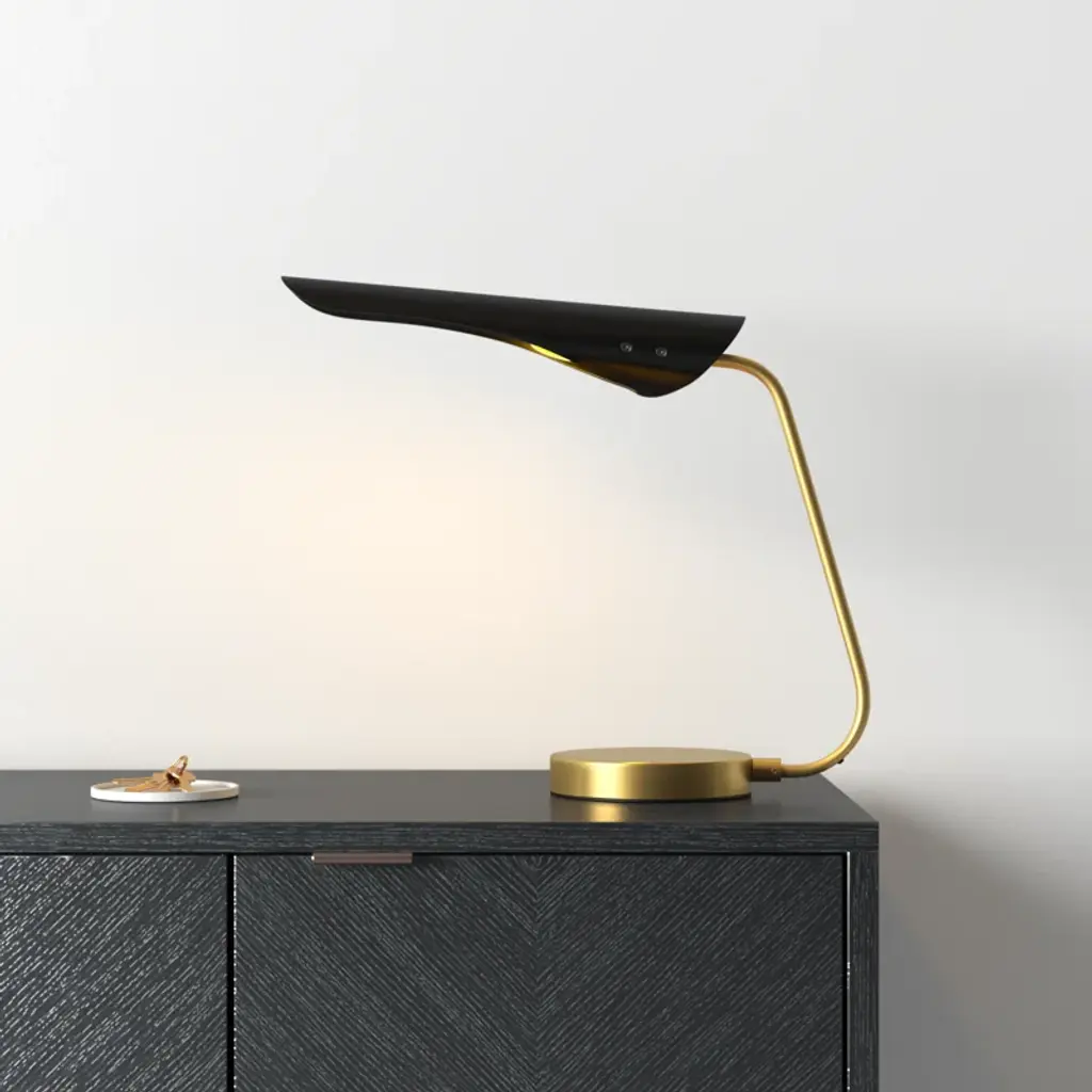 Make a refined and striking statement with our stunning Kota table lamp. Streamlined to its striking essentials, our lamp attains the perfect balance between clean lines and soft curves. An angular arm gracefully bends to hold our stunningly minimalistic black iron shade. It is completed with lustrous brass hardware and base to add the right amount of glam to an end table, nightstand or desk. Providing focused light ideal for reading and writing, our table lamp remains a striking way to illuminate your workspace.