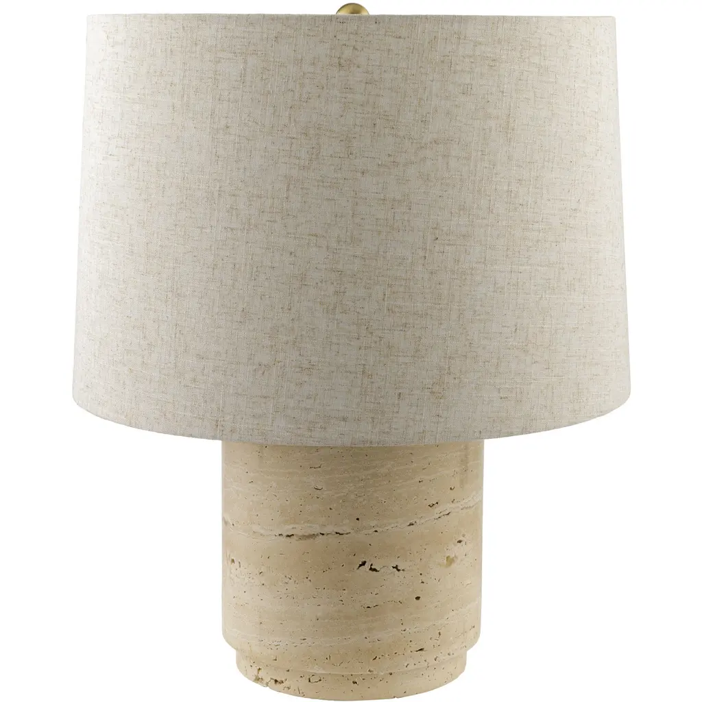 Illuminate your space with the accent table lamp, a stunning accessory that adds an elegant touch to any room. Constructed from travertine for the body and accented with a linen outer shade and metal inner shade, this lamp is a unique blend of natural elements and modern design. Standing at 19 inches tall, it's perfectly sized to provide ambient lighting on a side table or nightstand. The metallic finial offers an additional stylish detail, completing the sophisticated look of this lamp. Maintenance is effortless - simply wipe clean with a dry cloth to keep it looking its best.