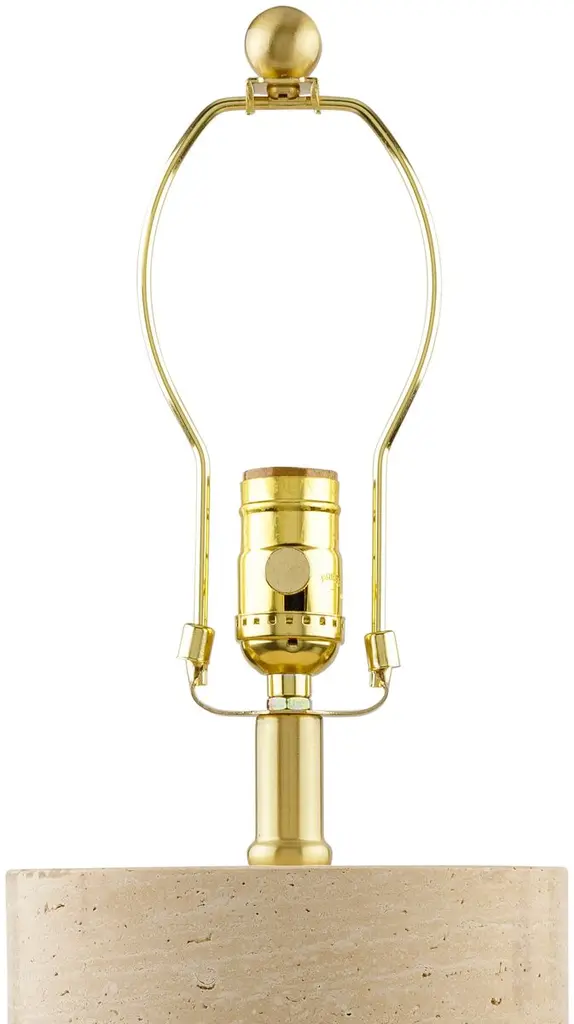 Illuminate your space with the accent table lamp, a stunning accessory that adds an elegant touch to any room. Constructed from travertine for the body and accented with a linen outer shade and metal inner shade, this lamp is a unique blend of natural elements and modern design. Standing at 19 inches tall, it's perfectly sized to provide ambient lighting on a side table or nightstand. The metallic finial offers an additional stylish detail, completing the sophisticated look of this lamp. Maintenance is effortless - simply wipe clean with a dry cloth to keep it looking its best.