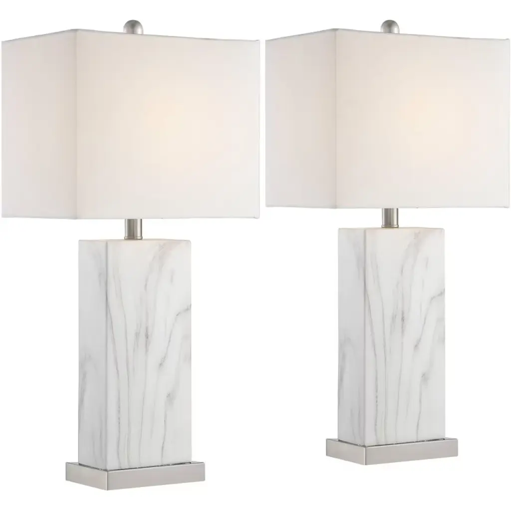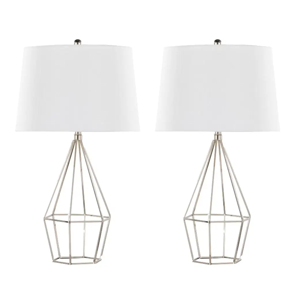 Possessing a refined modern look, the Kriftel table lamp set is a work of art. The silver-finished bases are designed with crossed pillars that form an X shape. The white drum shades suit any color scheme or decor style. Featuring a three-way switch, each lamp accommodates up to a 150-watt bulb (not included).
