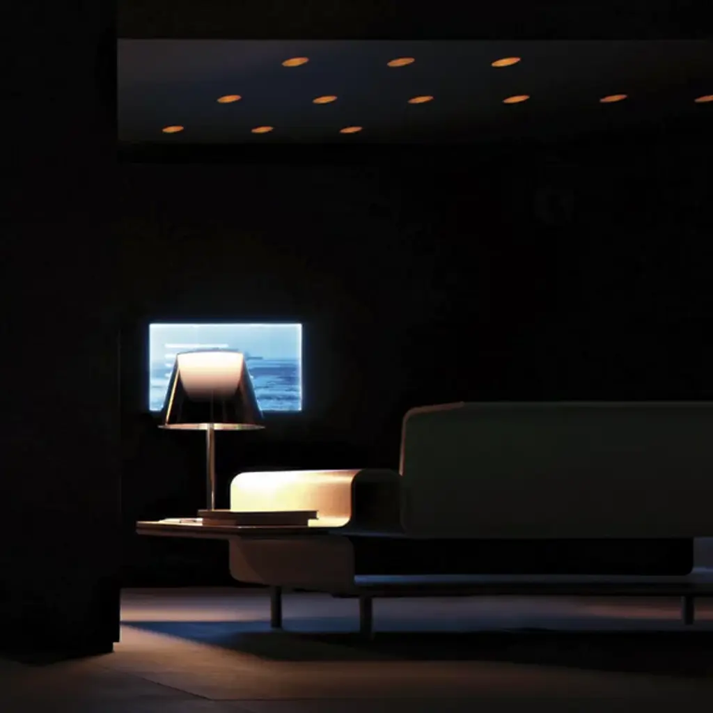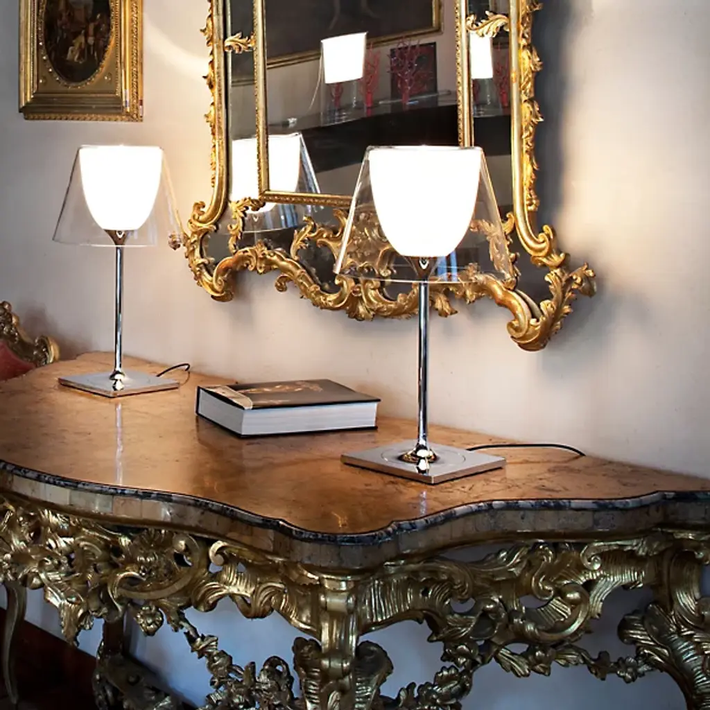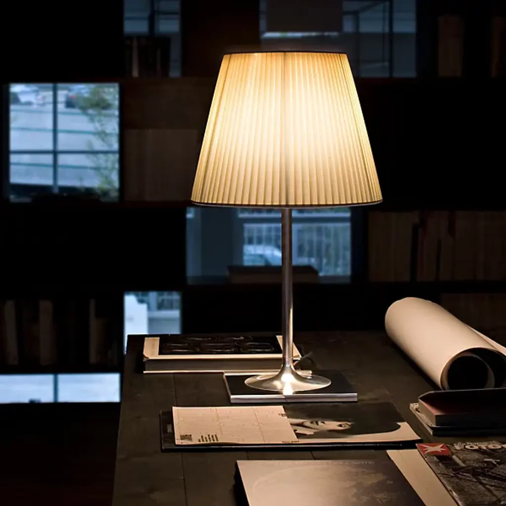 Following in the footsteps of the iconic Miss K, the Flos Ktribe T2 Table Lamp was designed by Philippe Starck with the same distinctive silhouette. Atop a clean, nylon-covered base, a flared PMMA or plisse cloth shade overlays a cup-shaped inner Opal polycarbonate diffuser.