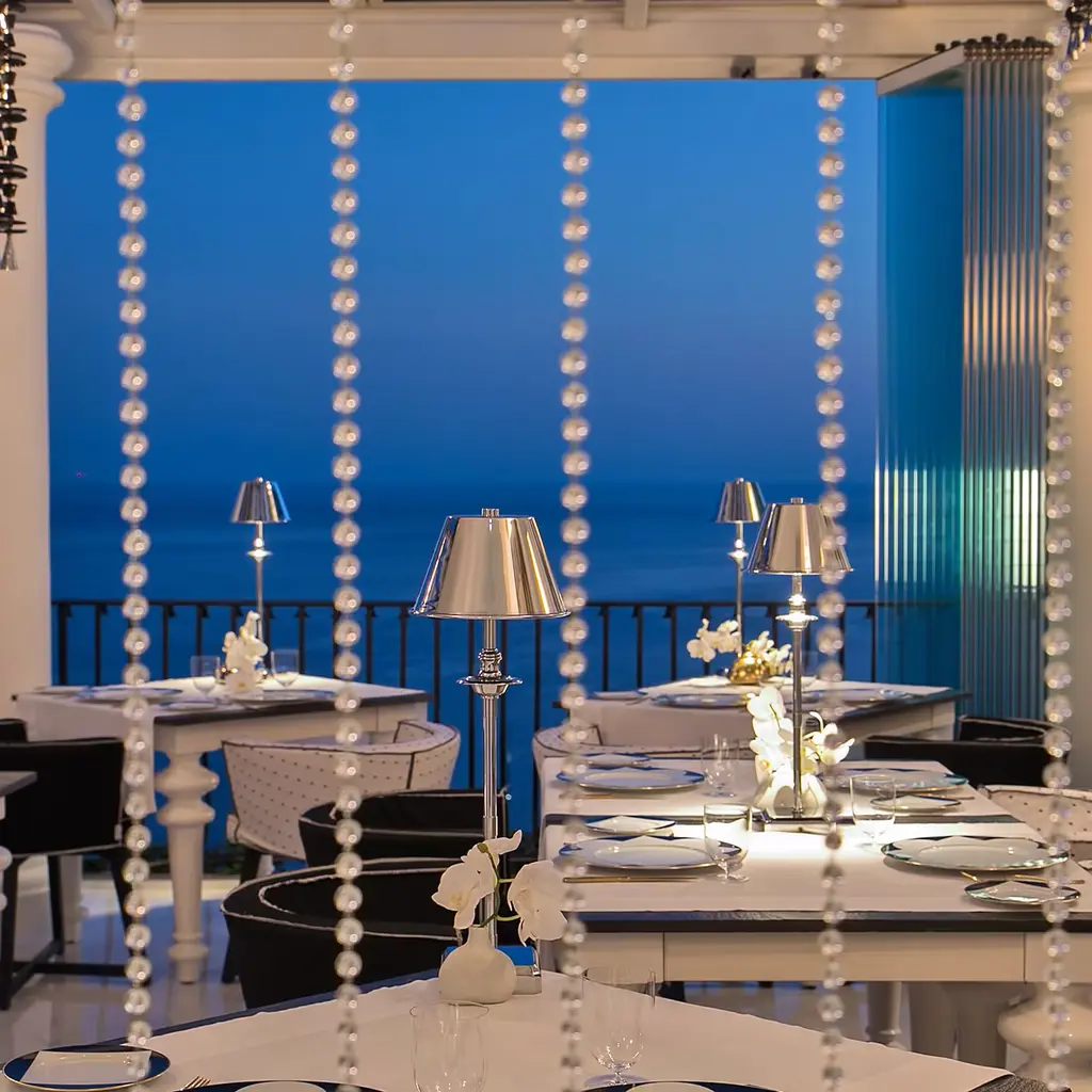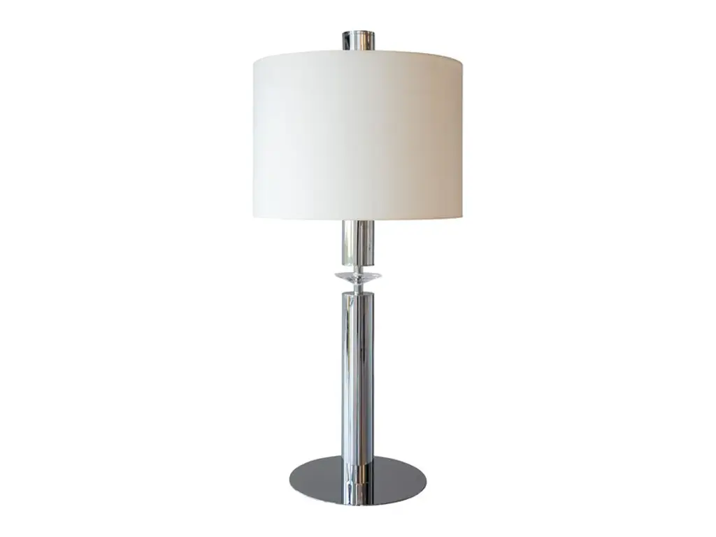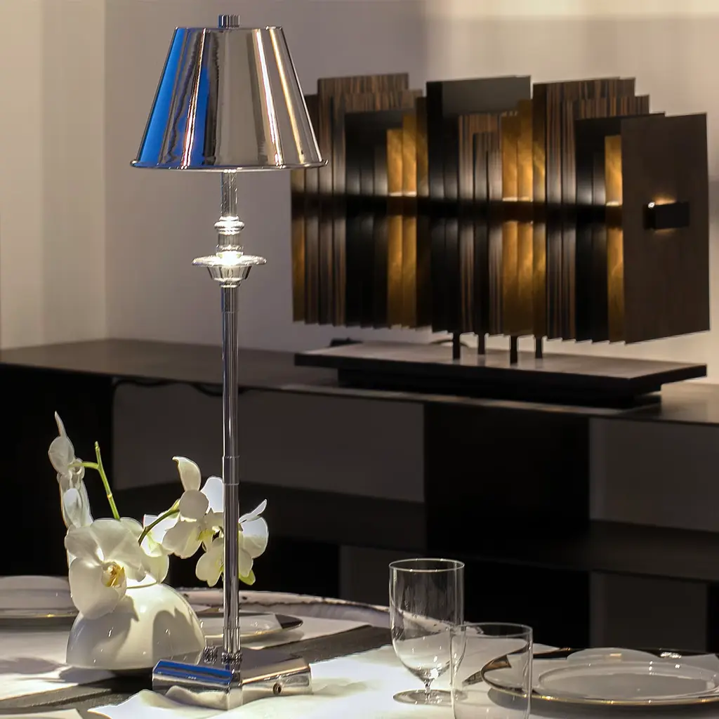 Equally apt to elegantly accent special table settings in hospitality or domestic contexts, this table lamp is a rechargeable lighting fixture free of uncomfortable cables. The brass frame - also incorporating the conical shade - flaunts a glaring chrome finish whose reflective quality is emphasized by the glare radiating from above by the three 1.2W LED sources. The delivery includes appropriate mains for the switch-mode power supply, please contact the Concierge for technical specs.