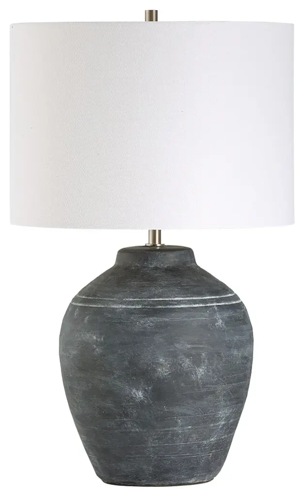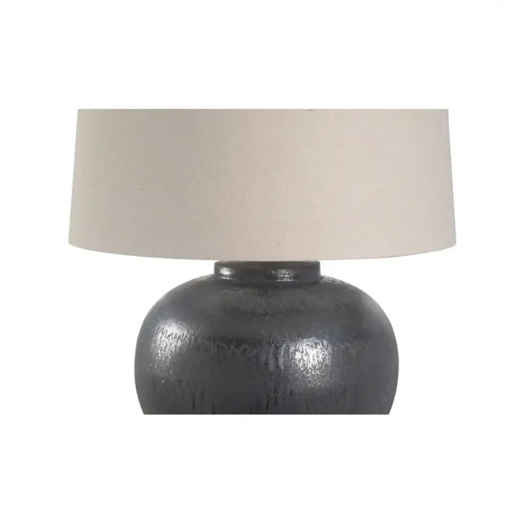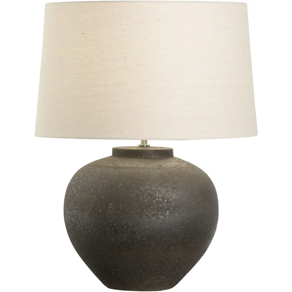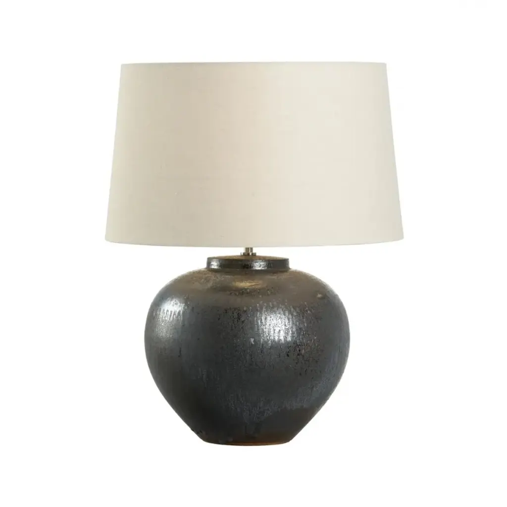 The Kuro Table Lamp, part of the Shiga collection, is hand turned with mineral glaze, allowing iron oxides to be used as part of the coloring process. The Kuro is completed with cloth wiring and topped with a refined empire rolled-edge linen shade. Made in Japan.