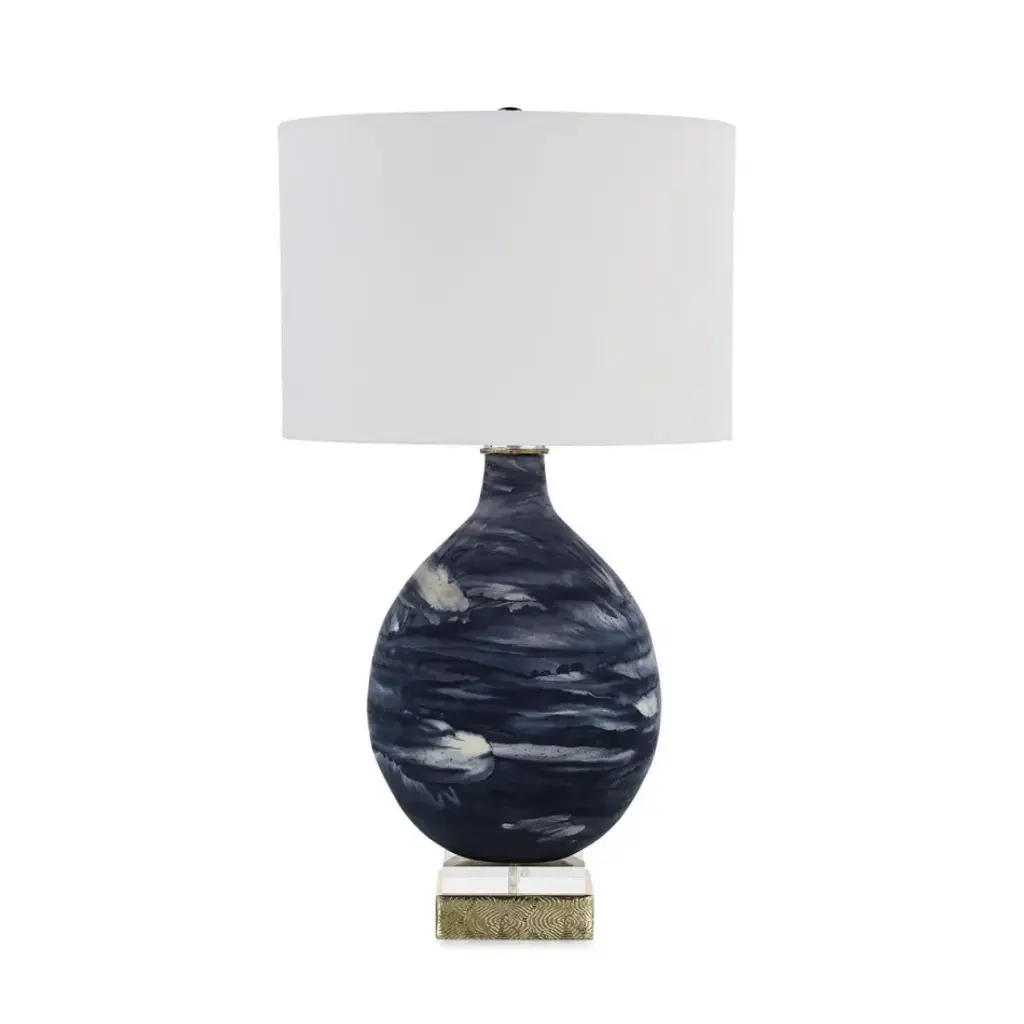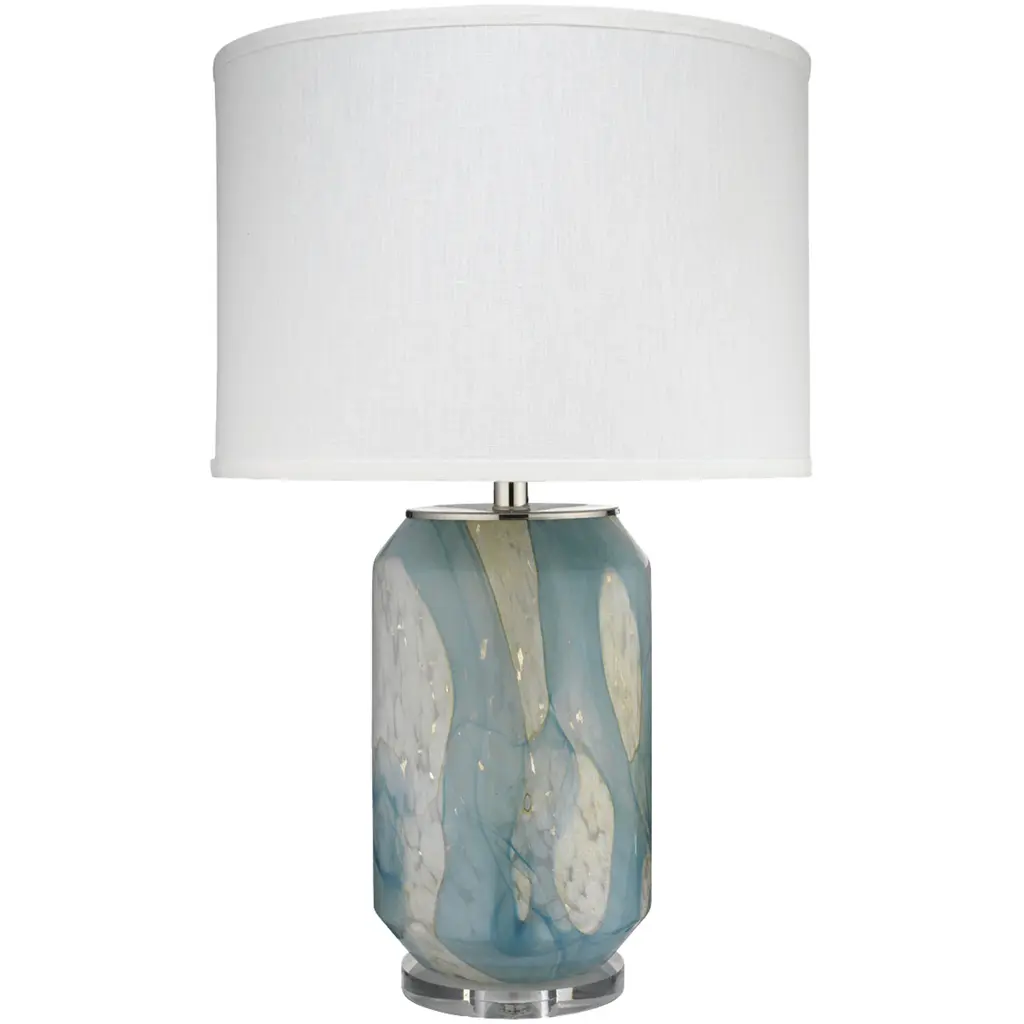 The Kyoto Table Lamp is a stunning piece that contributes a wealth of visual interest to any décor. Crafted from art glass, the piece displays swirling shades of blended blue and gray tones. The lamp rests atop a square steel base with swirling motifs in a Champagne finish, showcasing an acrylic accent to match the neck. The look is completed with a Champagne ball finial and a white drum shade.