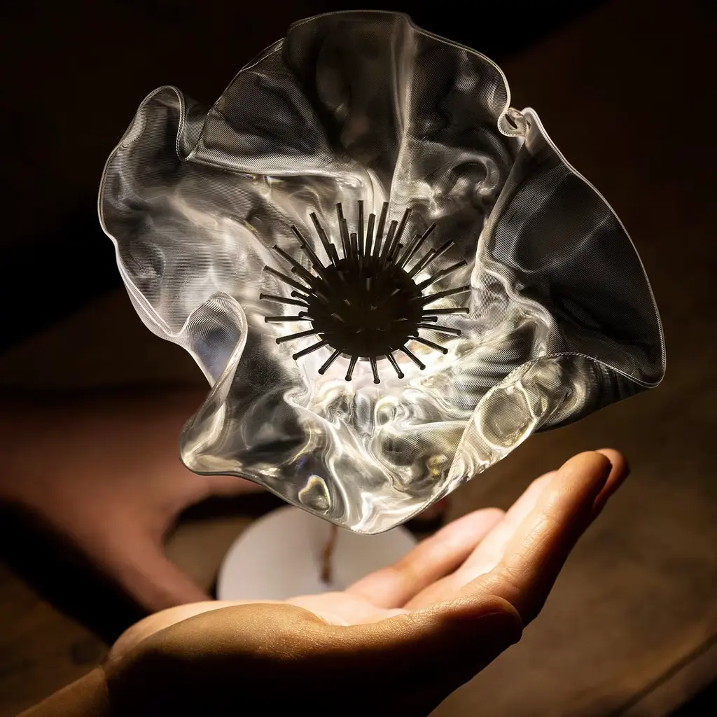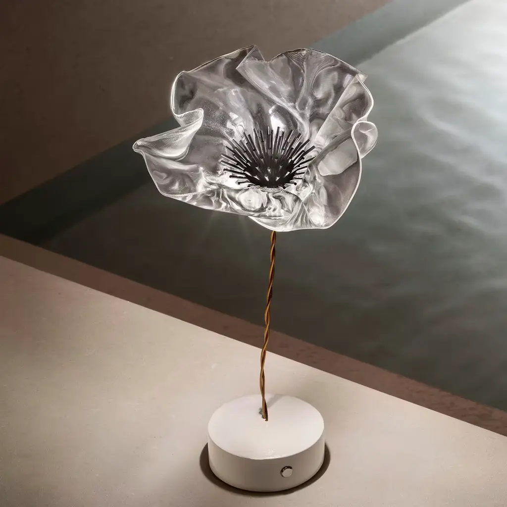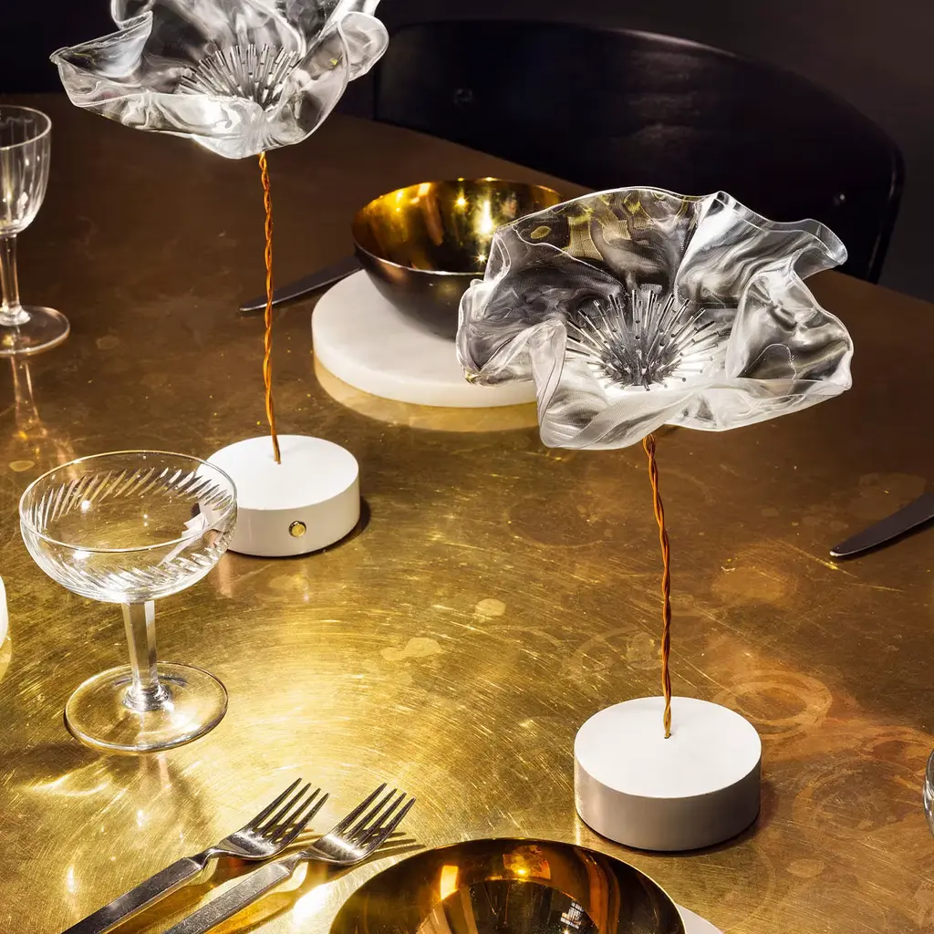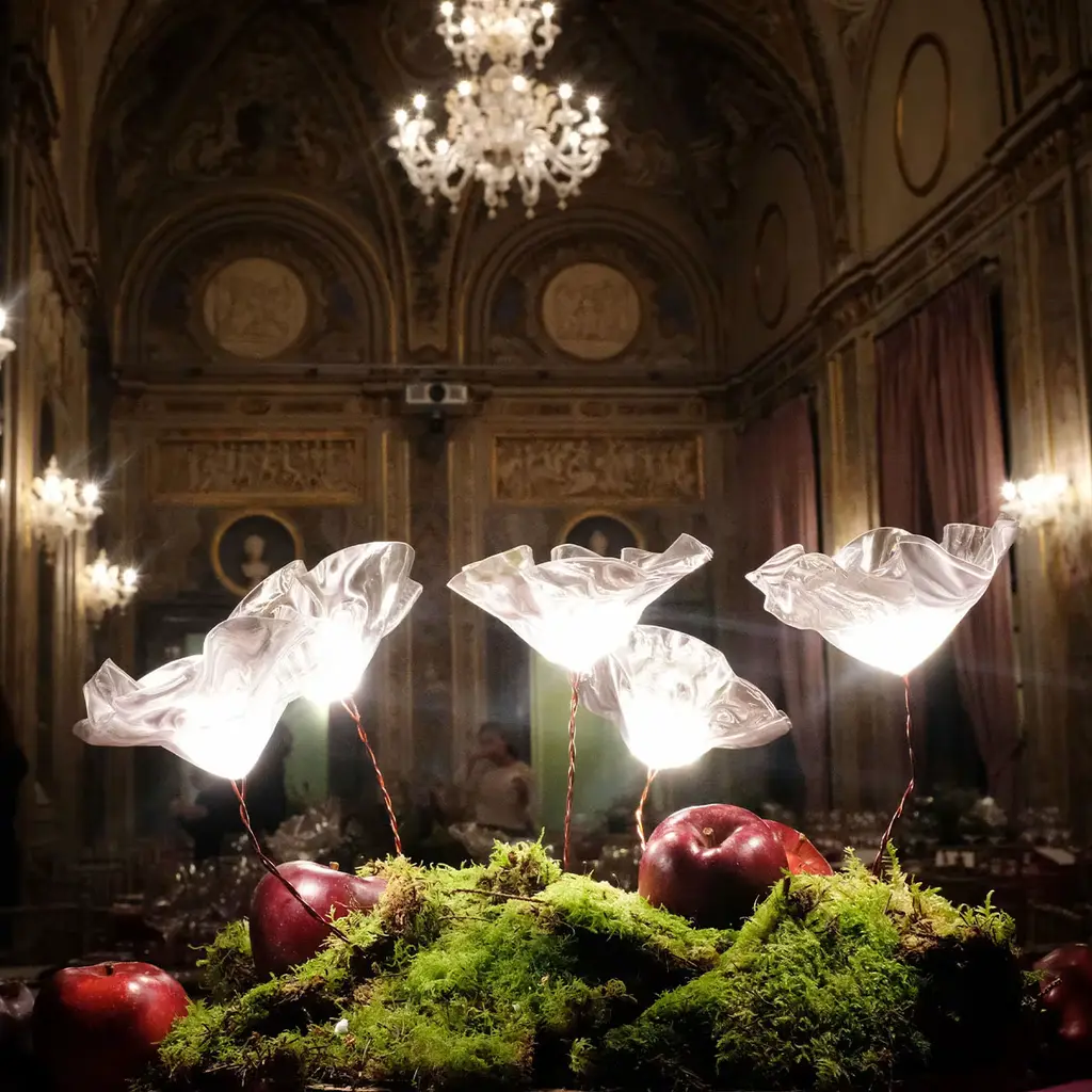 This battery-operated design by Marc Sadler combines functionality and adaptability with a highly decorative aesthetic. The three-dimensional diffuser is hand-molded in the shape of a delicate blossoming flower using a heated sheet of Lentiflex® that captures and diffuses warm, energy-efficient illumination throughout its sensual silhouette and individual pistils. Equipped with a magnetic base, this lamp has a metal anchor designed to be placed under a tablecloth for an eye-catching mise-en-place or affixed to a wall to transform this artistic luminaire into a sconce.