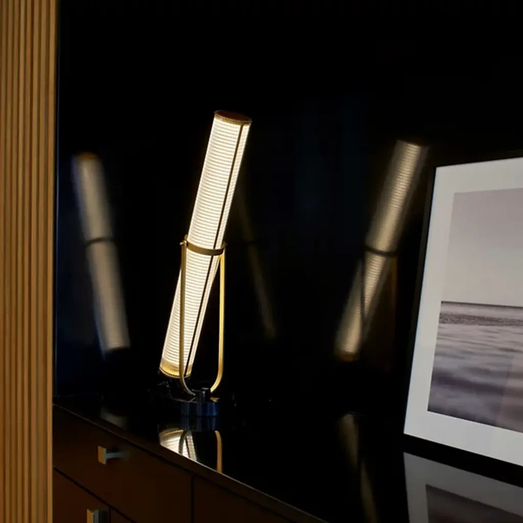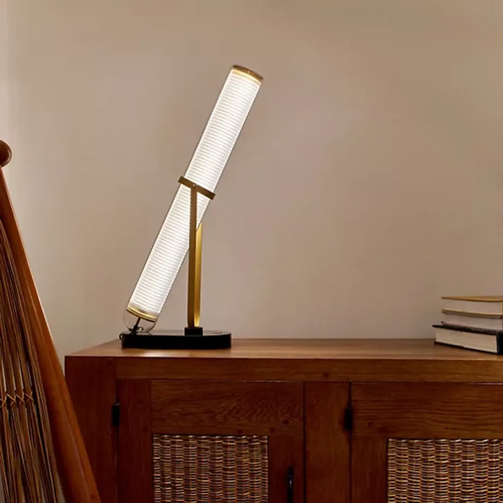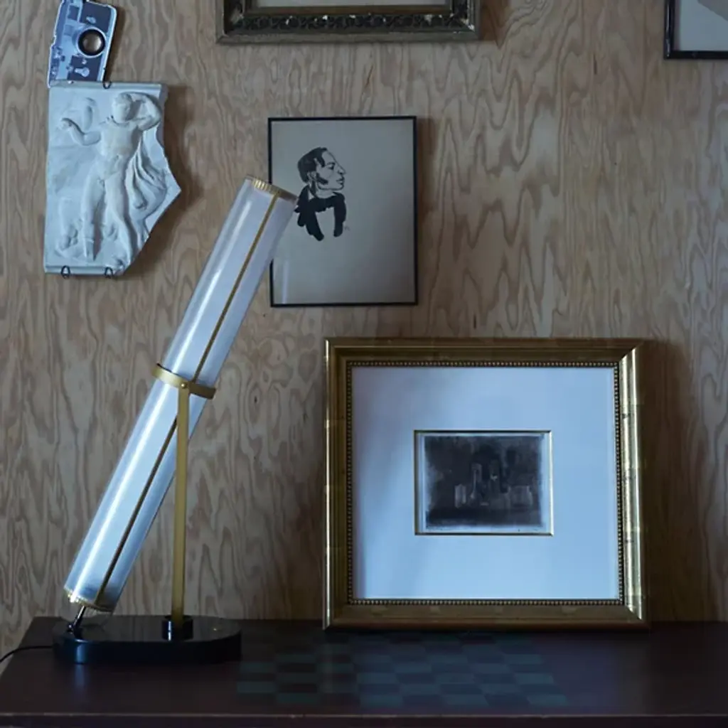The mystery of the unknown inspires this part magic, part science design. Surprise yourself and surprise guests when you flip the switch on La Lampe Frechin LED Table Lamp from DCW Editions. Designer Jean-Louis Frenchin approaches the piece with a poetic view of technology. Frenchin designed the piece to reveal and hide its light. Like a slender beaker, the glass tube conceals the bulbs inside while displaying their energy with a golden, layered design. Looking at the warm tube of light conjures up the same sense of wonder as a magic trick or science experiment. Adding to its otherworldly properties, the tube gets energy from 2 positions on the elegant marble base. Held with a sleek metal frame, the tube stands straight or at an angle in a handsome silhouette. Tap on the low-profile dimmer on the base for a tailored mood.