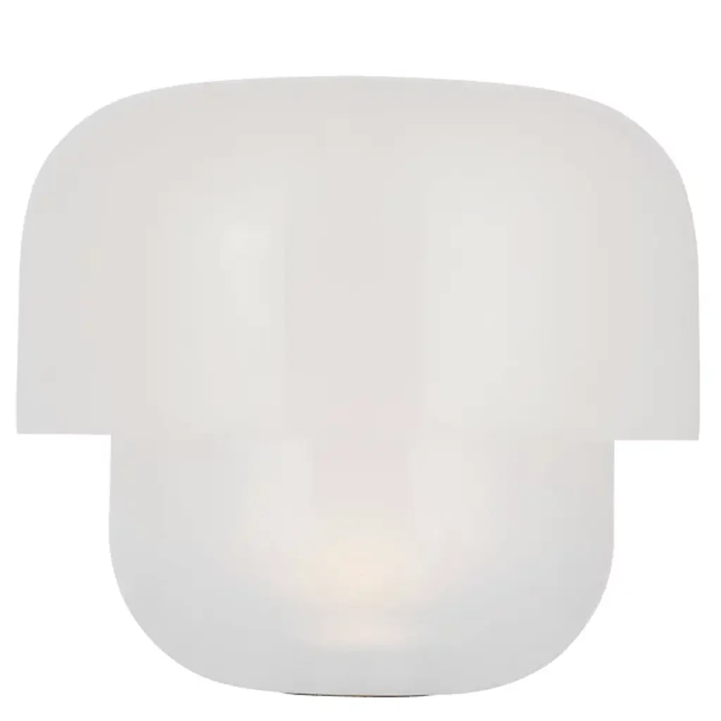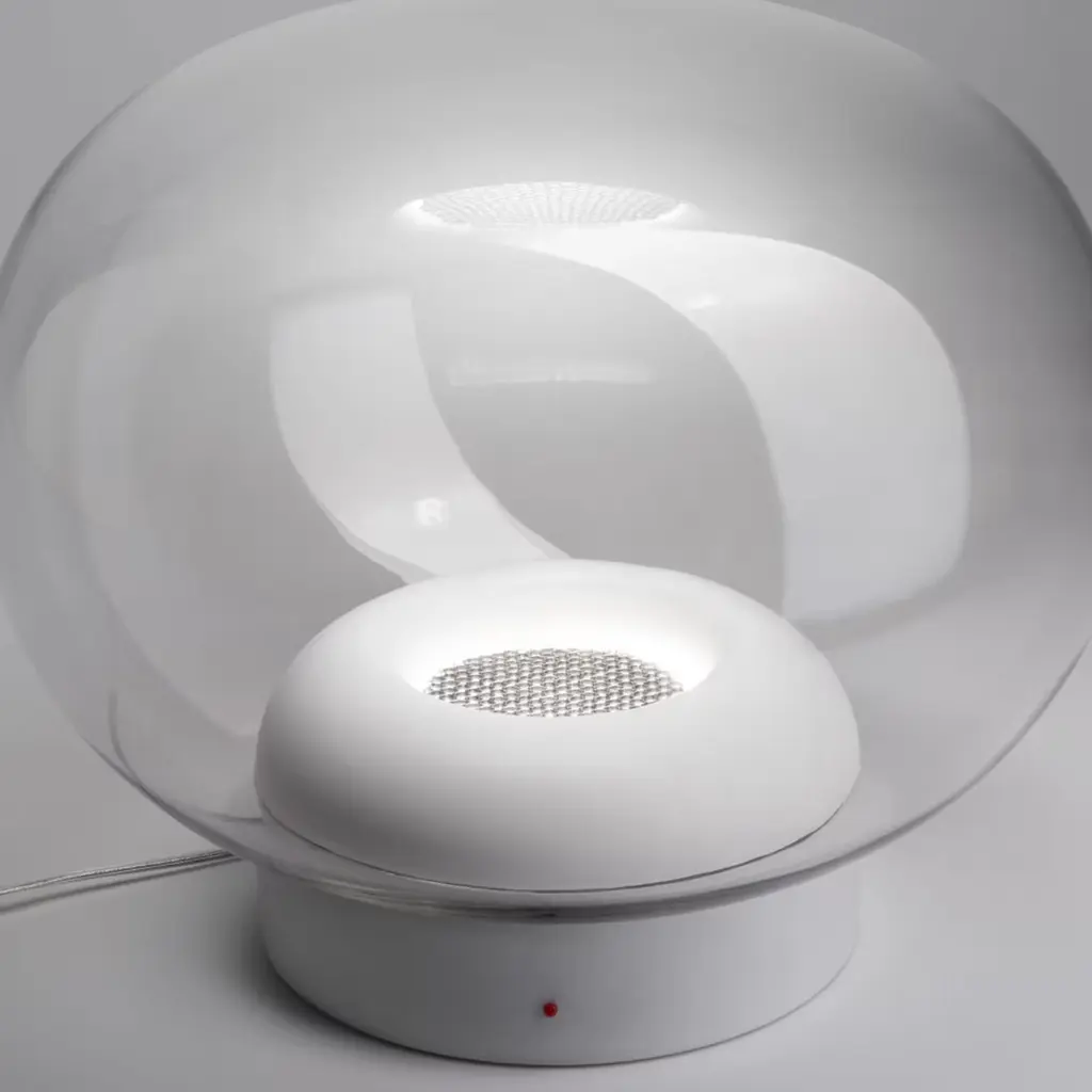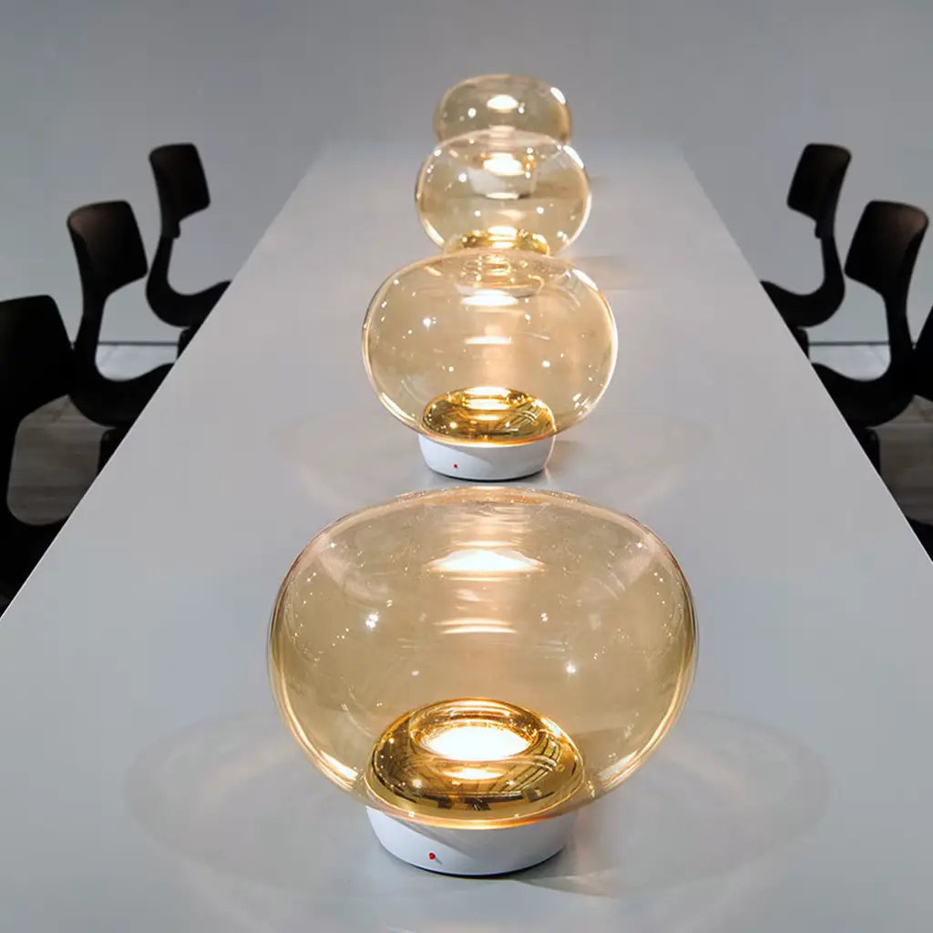 Table lamp in blown transparent glass, housing LED source in white painted aluminum and white base. Single emission table lamps for indoor application. Single emission table lamps for indoor application. The warm white LED light source with a general lighting light distribution is composed of 18 topled LEDs.