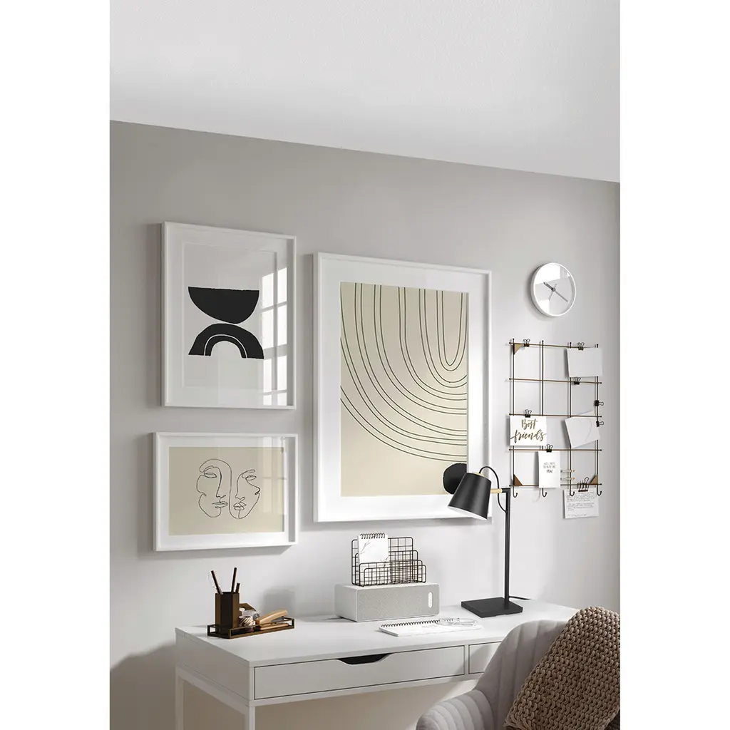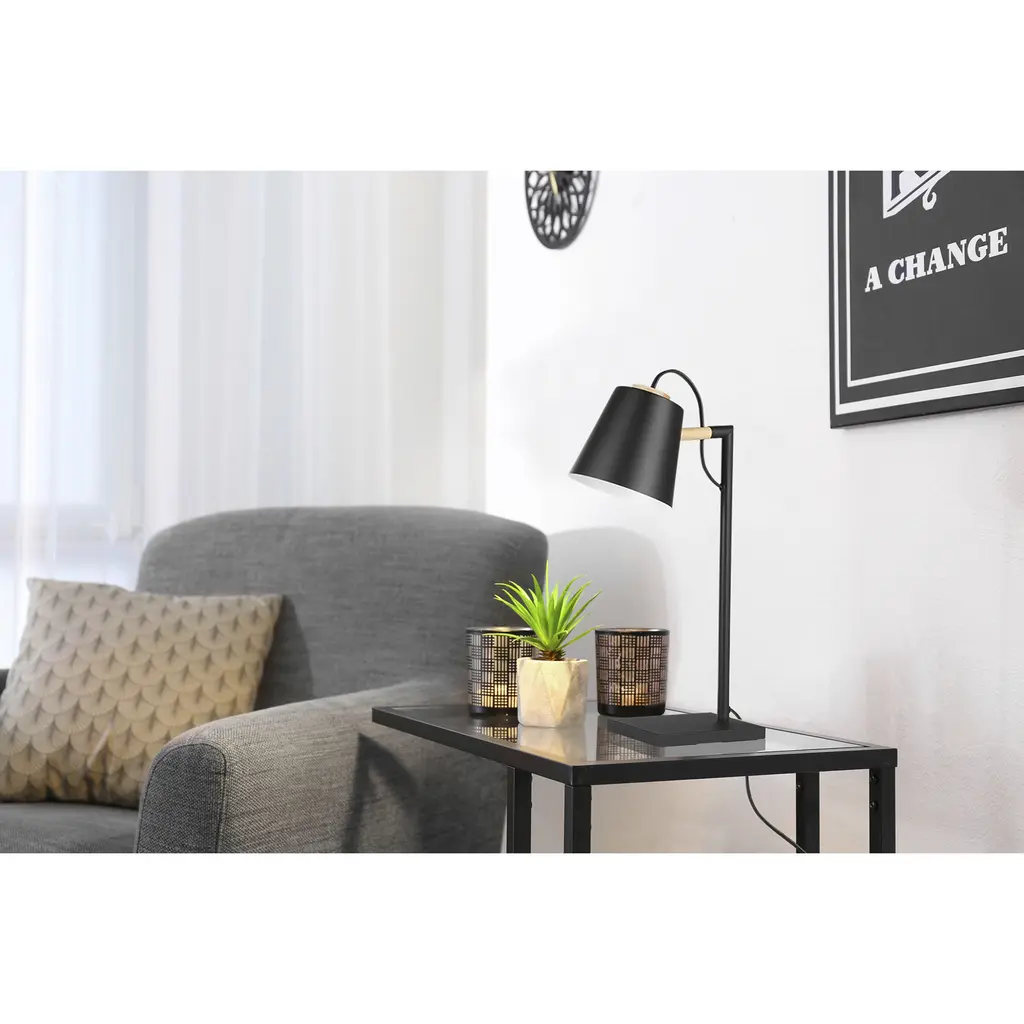 The Lacey table lamp by Eglo features a structured black finish w/ a natural wood accent. The metal shade is adjustable and has a structured black exterior and white interior finish. The black plug in cord measures 59" long