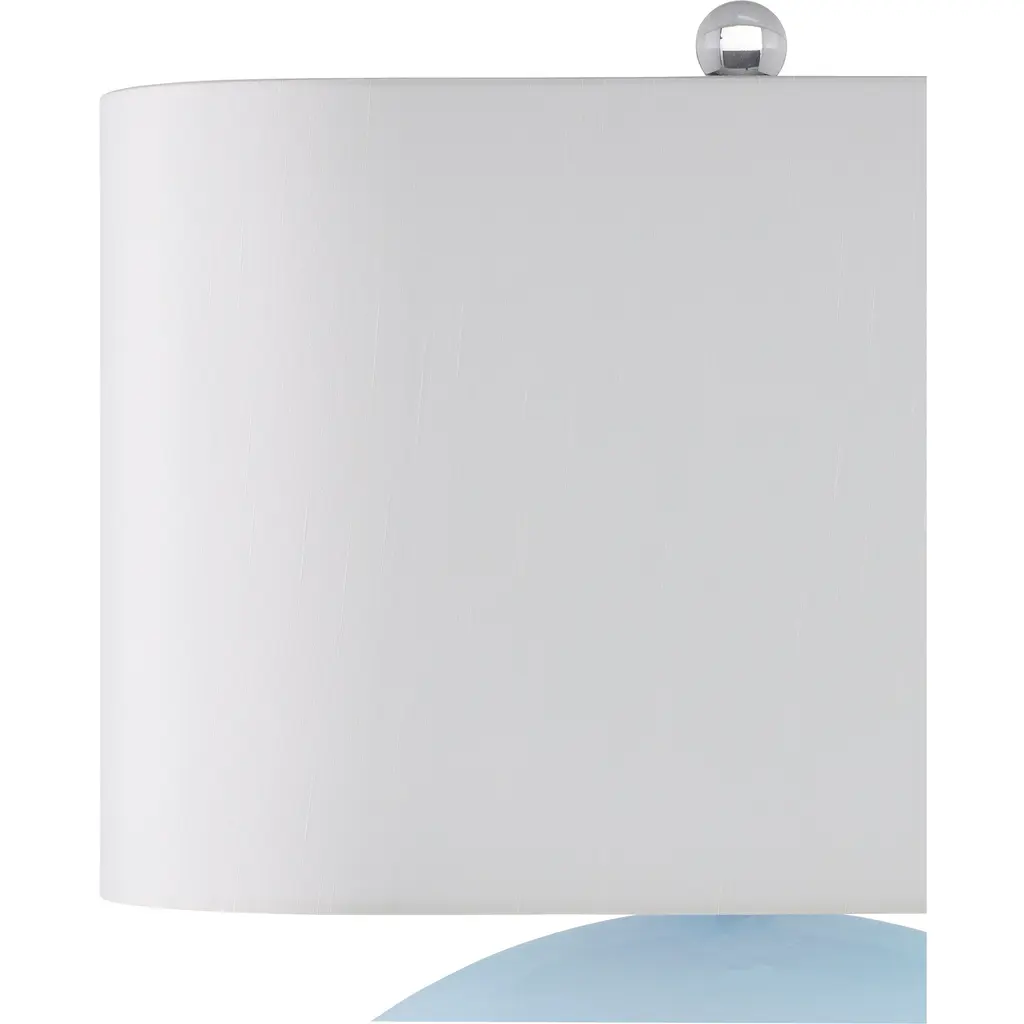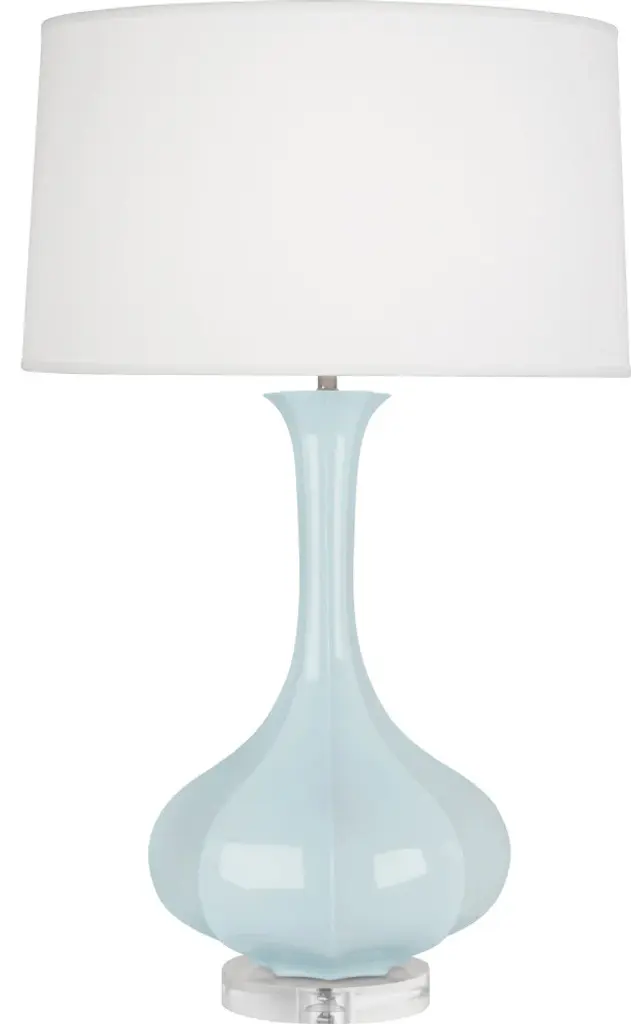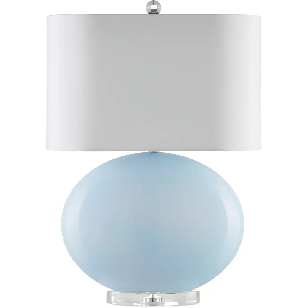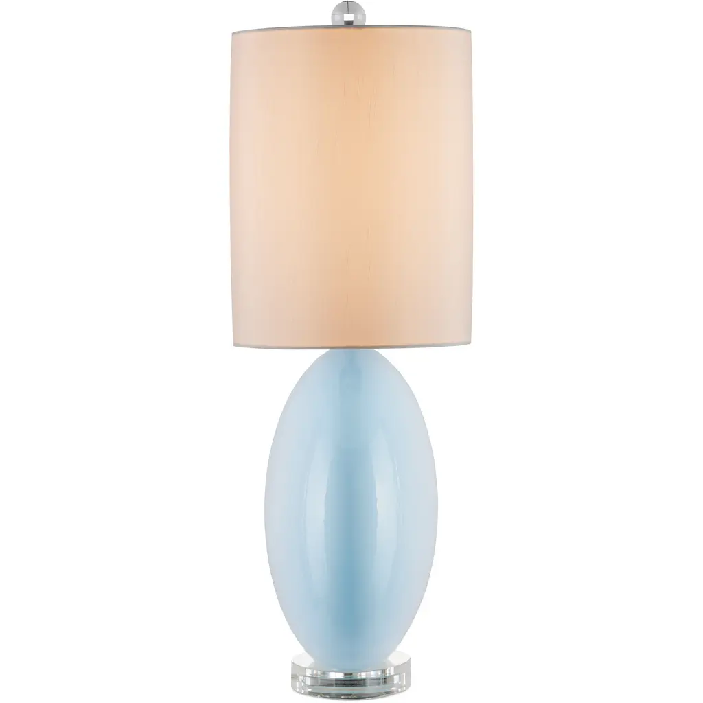 The Laconia Table Lamp is a luminous creation with a lozenge-shaped body made of light blue glass sitting atop an optic crystal base. The hardware is equally brilliant in a polished nickel finish, and a round optic crystal finial tops off the creation. This pale blue lamp is narrow, so it is a great choice for tables or cabinets without large or deep top surface spaces.