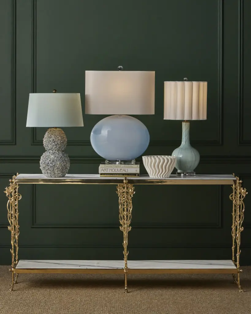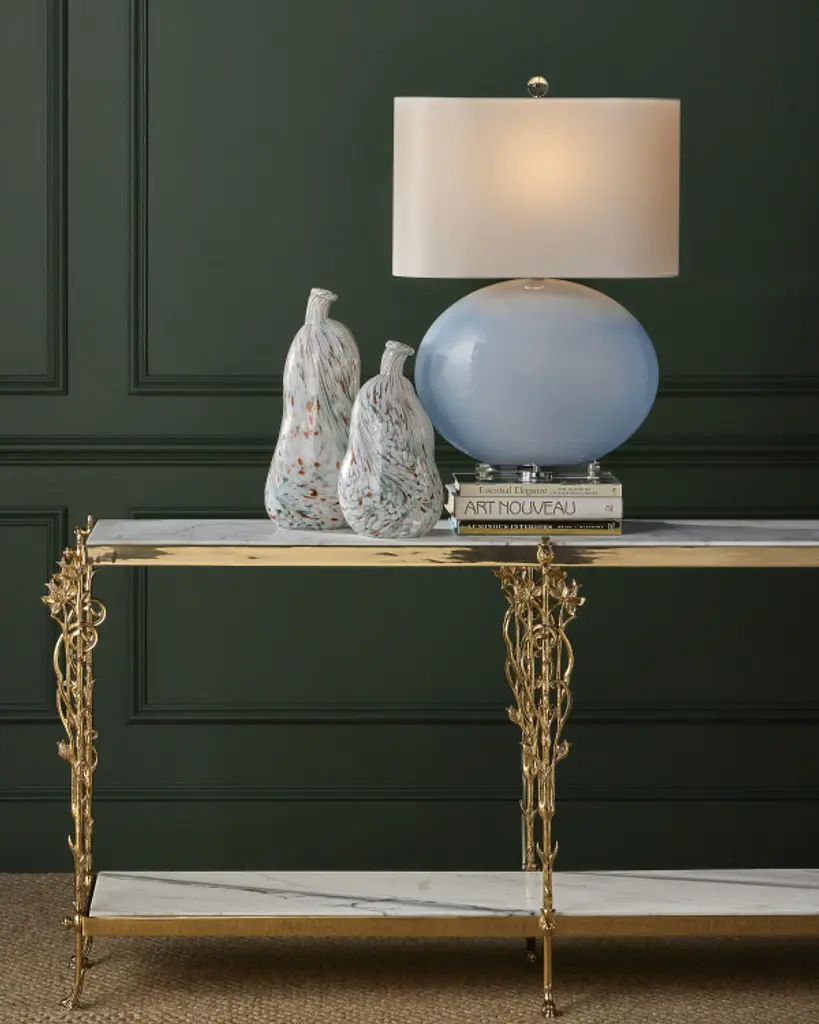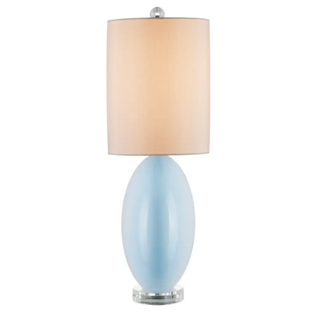 The Laconia Table Lamp is a luminous creation with a lozenge-shaped body made of glass sitting atop an optic crystal base. The hardware is equally brilliant in a polished finish, and a round optic crystal finial tops off the creation. This lamp is narrow, making it a great choice for tables or cabinets without large or deep top surface spaces.
