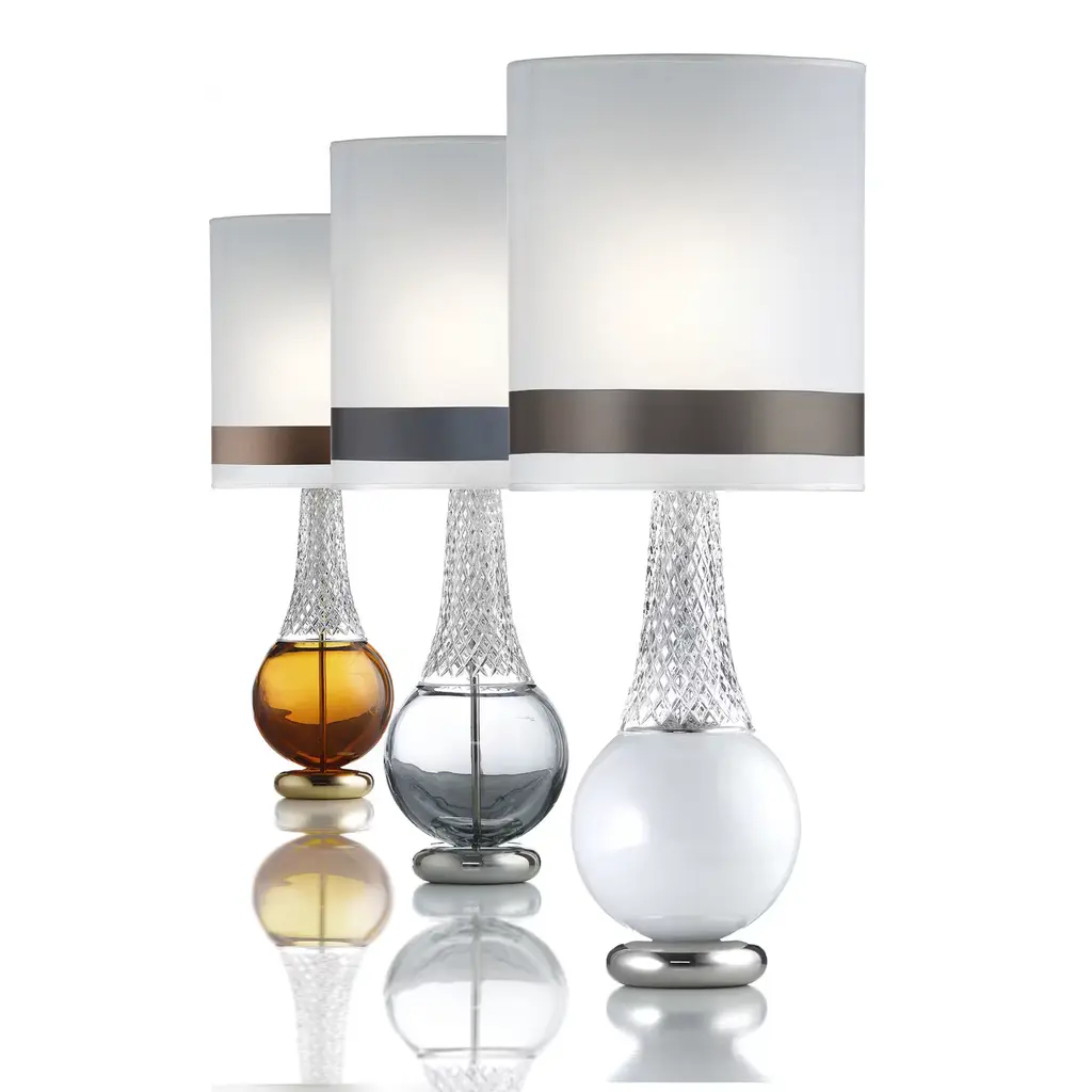 This superb table lamp is a striking example of exquisite craftsmanship and modern design. The structure in metal with a polished nickel finish rests on a round base on which the hand-cut 24 lead Italian crystal creates two entirely different effects: at the bottom, the precious glass has a white finish (also available in amber or tinted color), while the top element is clear and boasts a stunning diamond-shaped texture. The shade is in glossy organza on PVC. This unique piece will be eye-catching in both a classic and contemporary decor.