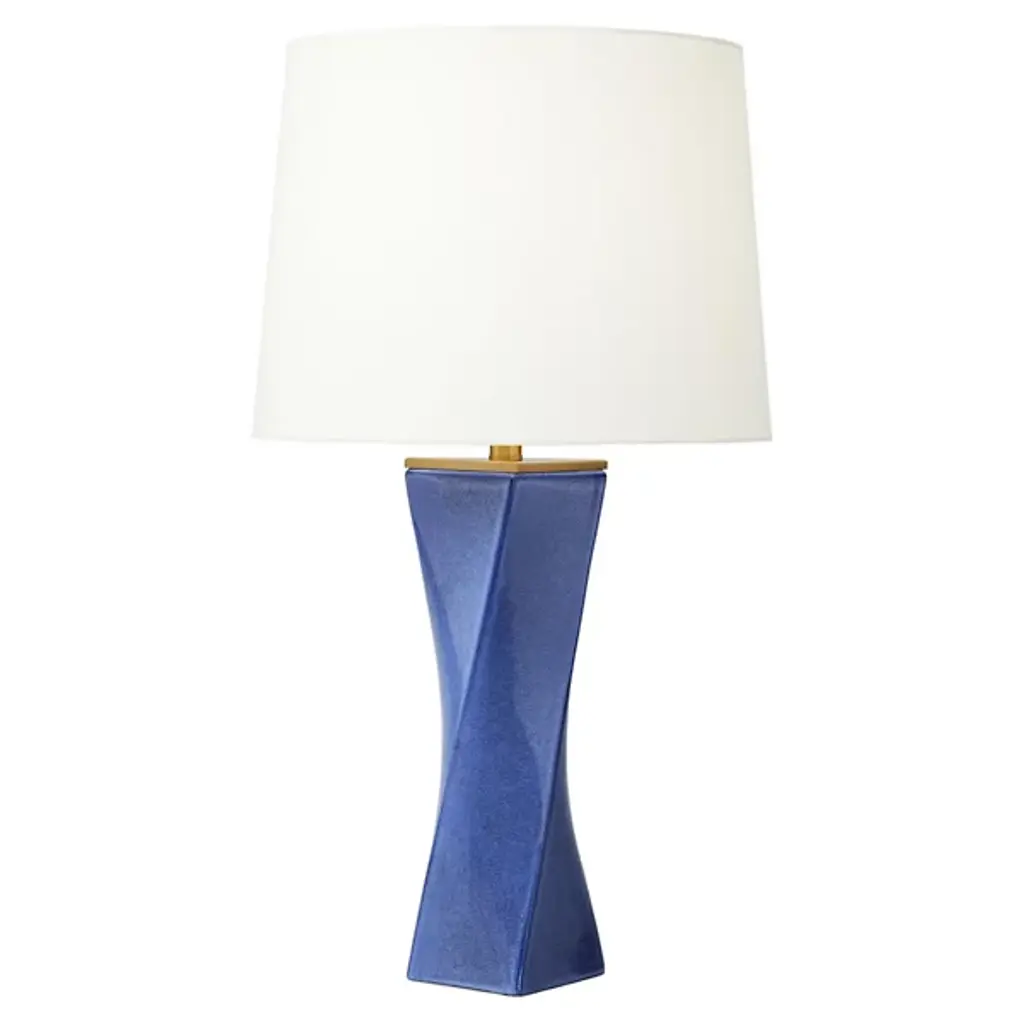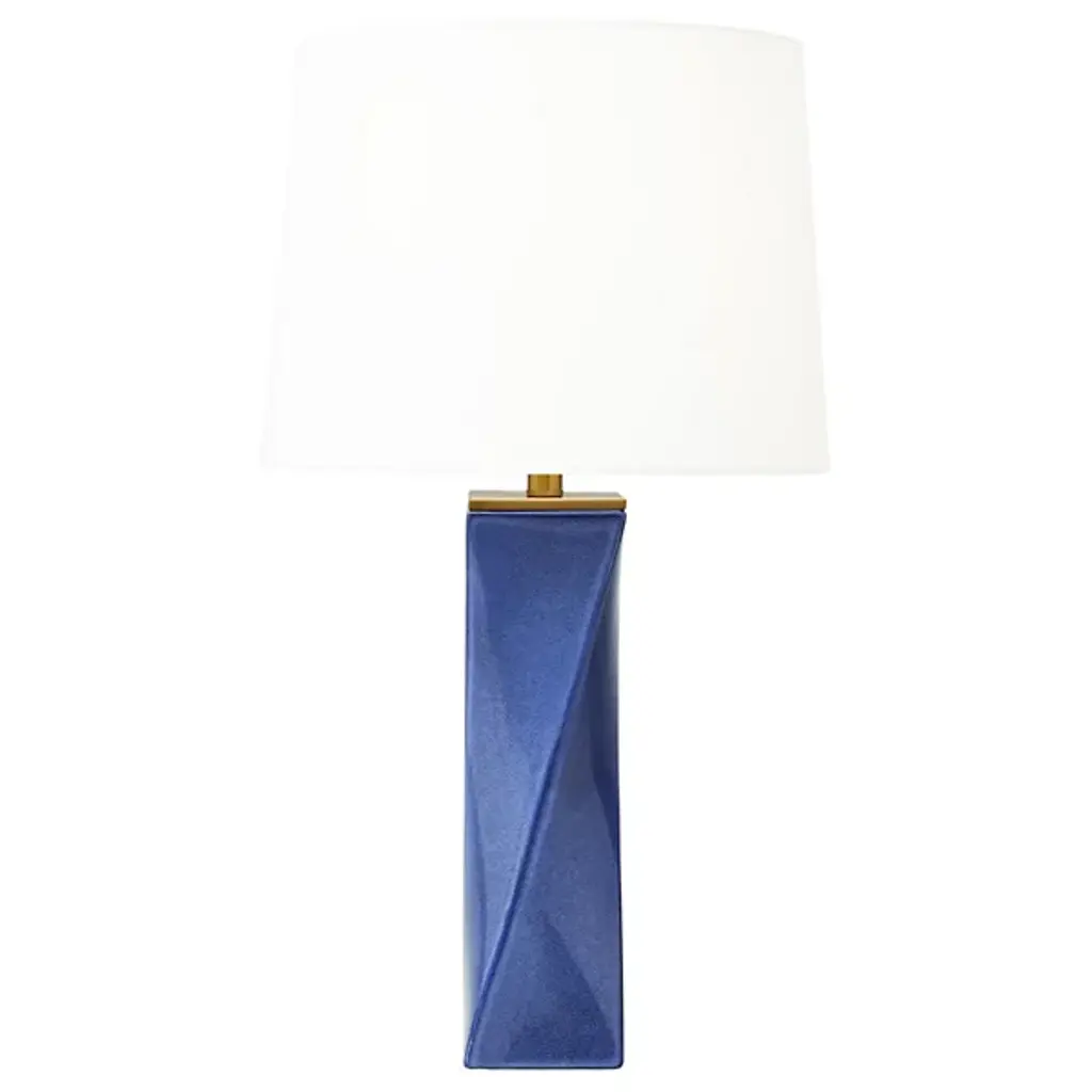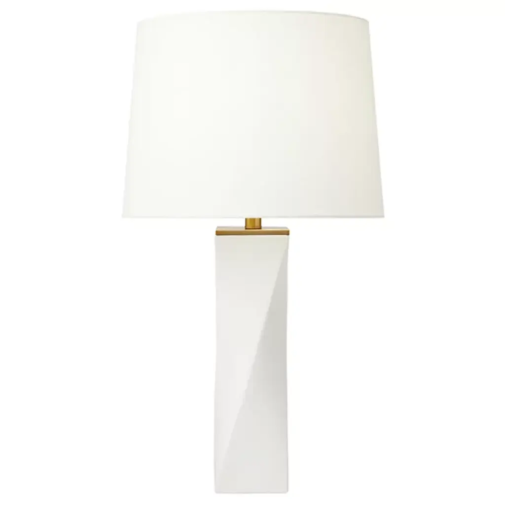Add a fashion-minded twist to indoor tables with the Lagos Table Lamp from Visual Comfort Studio, formerly known as Chapman & Myers, A rectangular prism body in textured ceramic twists as it rises. The twisting motion shows off the piece's beautiful sculptural facets. A square platform accent on top adds a dash of color contrast while holding a lone lamp. The tapered linen shade cuts glare to the sides. The bright drum shade sends out a relaxed ambiance and a broad wash of downlight.
