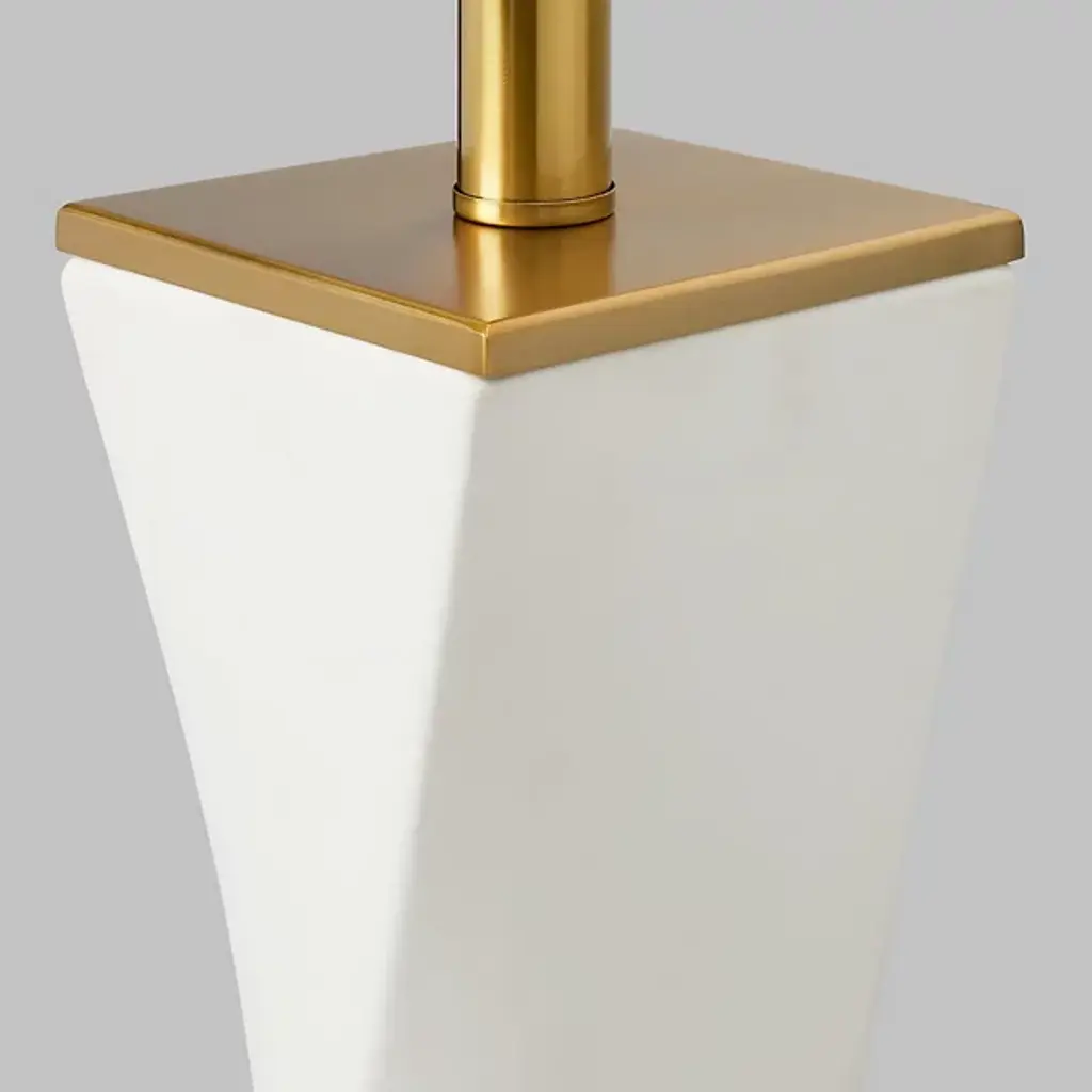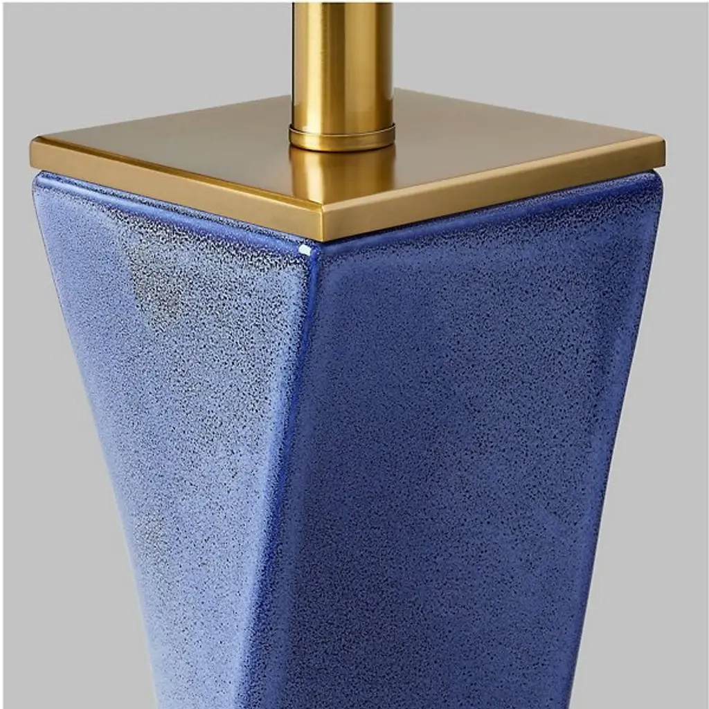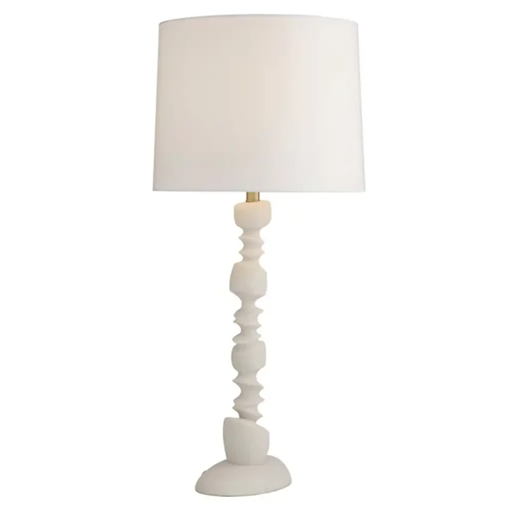 Add a fashion-minded twist to indoor tables with the Lagos Table Lamp from Visual Comfort Studio, formerly known as Chapman & Myers, A rectangular prism body in textured ceramic twists as it rises. The twisting motion shows off the piece's beautiful sculptural facets. A square platform accent on top adds a dash of color contrast while holding a lone lamp. The tapered linen shade cuts glare to the sides. The bright drum shade sends out a relaxed ambiance and a broad wash of downlight.