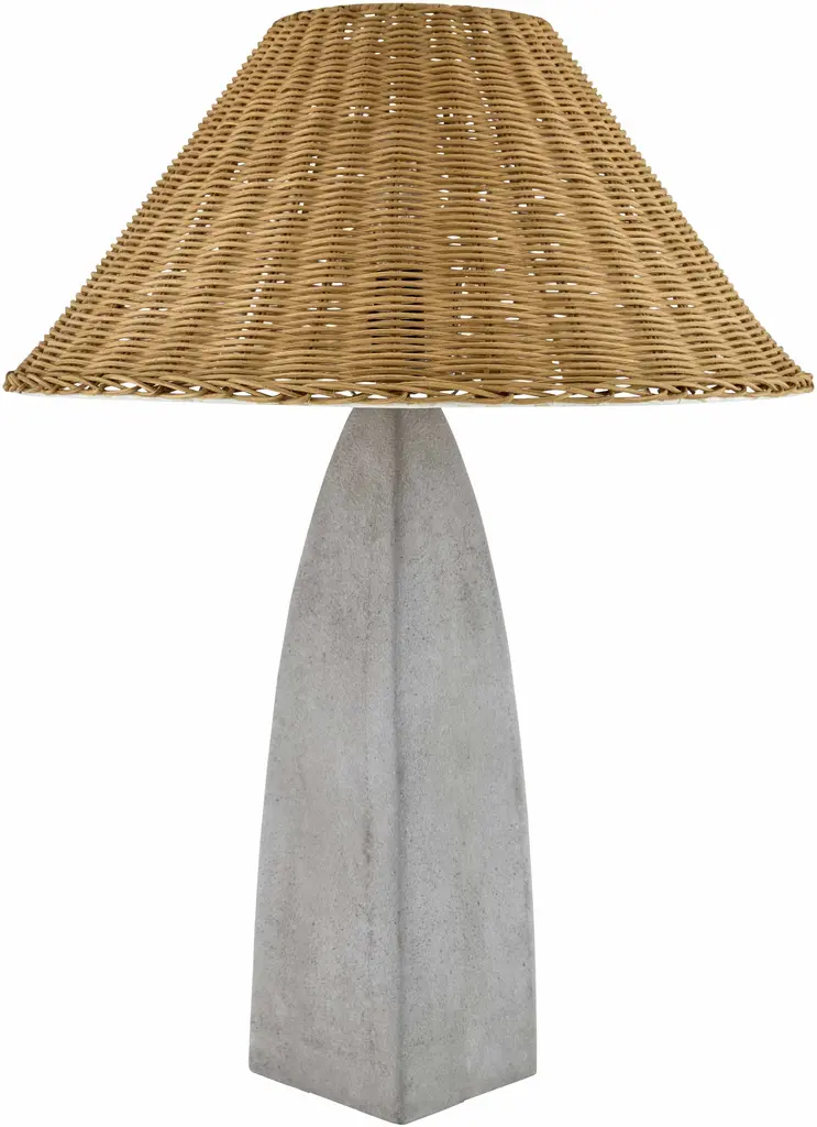Collection: Lajosmizse Colors: Gray, Dark Red, White, Metallic - Nickel Material: Body: Concrete / Shade (Outside): Rattan / Finial: Iron Styles: Traditional Made In: China Lighting Type: Accent Table Lighting Shade Material: Rattan Shade Color: White, Brown Cord Length: 6' Switch Type: On/Off Number of Bulbs: 1 Socket Type: E-26 Bulb Wattage: 100W