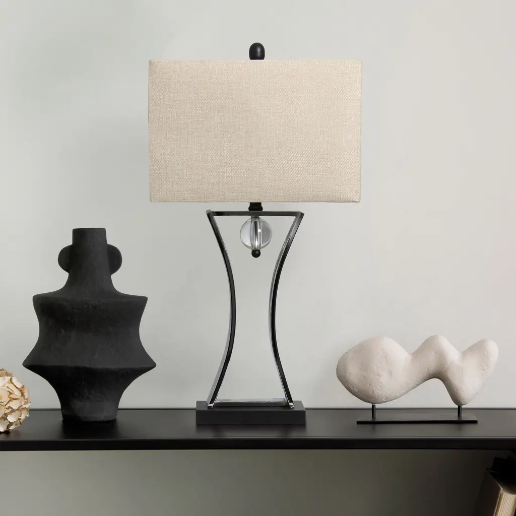 Enhance your space with the modern and stylish executive business table lamp. Featuring an hourglass shape and pendulum design, this lamp exudes contemporary elegance. Featuring a matte black base and commercial beige and gray rectangular shade that perfectly complement each other. Whether placed in a conference room, waiting area, or office, this lamp adds a touch of modern flair to any space. We believe that lighting is like jewelry for your home, and our products are designed to enhance your bedroom, living room, office, hallway, or foyer with elegance and sophistication.