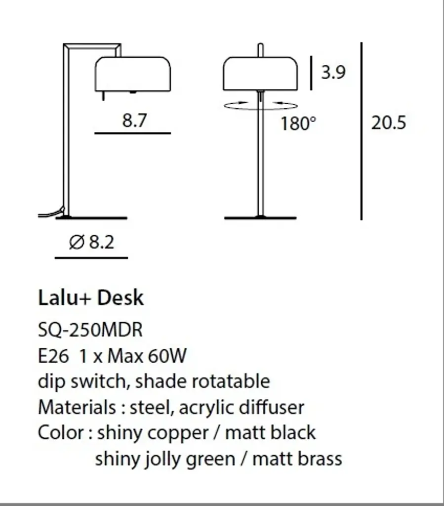 LALU+ Pendant version has gained so much popularity that we''ve introduced LALU+ Desk and Floor versions as well. By replacing glass with steel, this classic silhouette has been reinvented with a modern twist. Fuse a bit of retro with a splash of modern, render it utilitarian, and you??ve got LALU+. Allow this light to enliven your surroundings.Number of Bulbs: 1Bulbs Included: NoMaximum Wattage: Max 60WType of Bulb: E26Feature: Dip switch, shade rotatableDimmable: No
