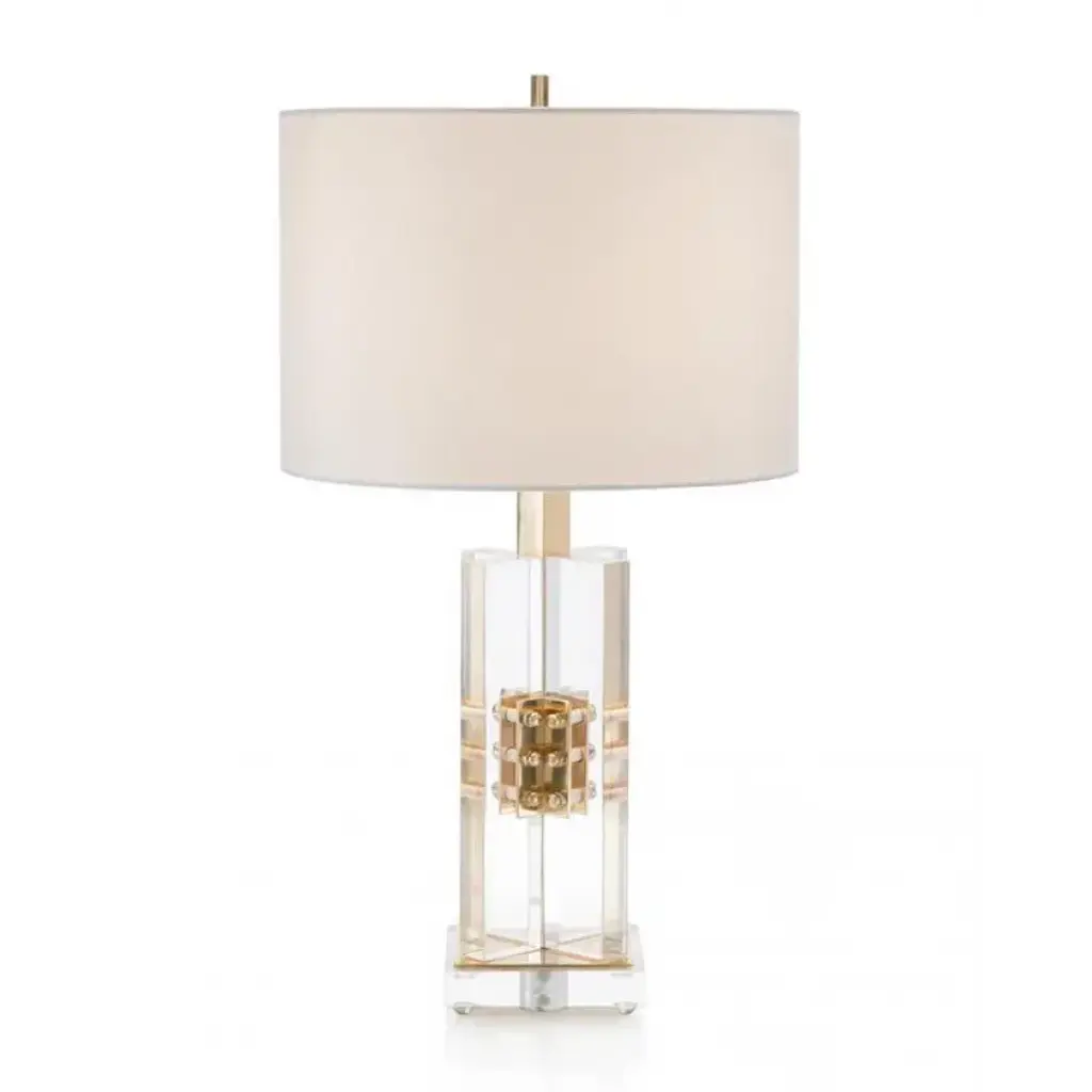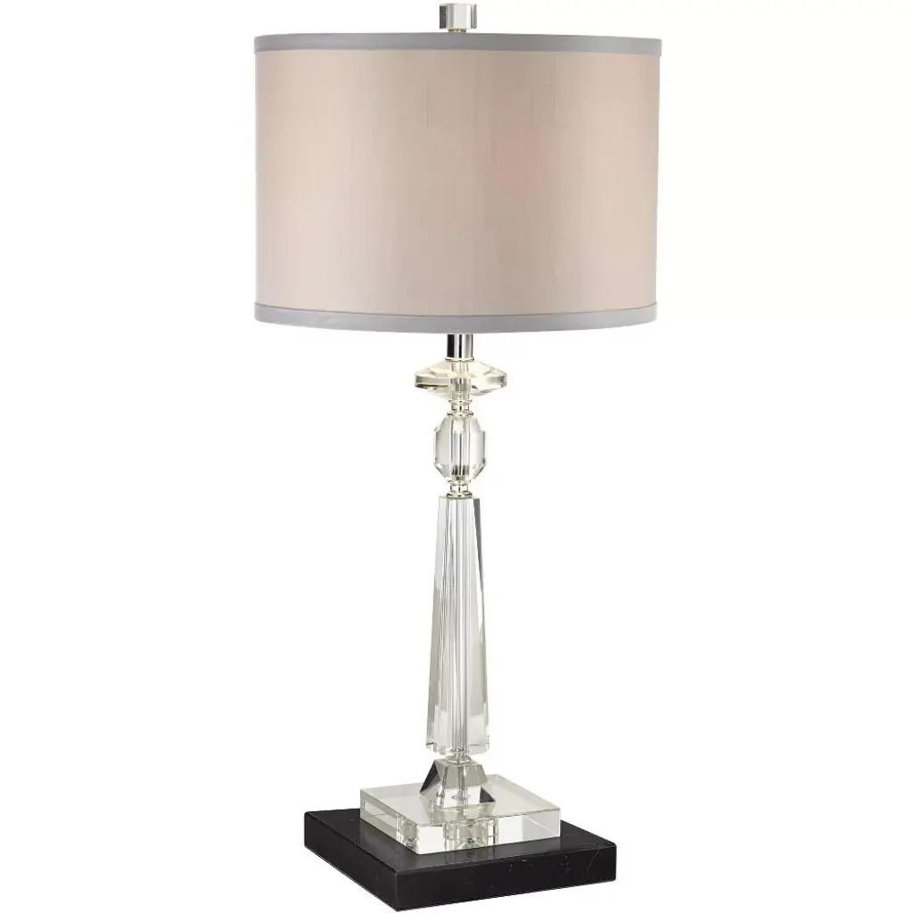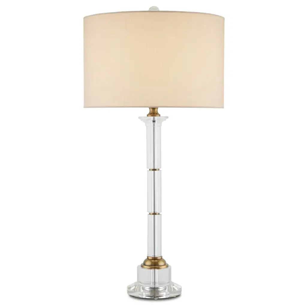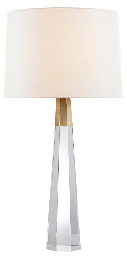 Our Lamont Table Lamp is made of intersecting planes of beveled optic crystal fitted into a brass base in a natural brass finish. The reflection of the metal stem rising along the pyramid shape of the clear crystal lamp draws the eye to the off-white shantung shade and pointy finial. We also offer the Lamont as a pendant. Ships In 7-10 Business Days This image is for illustrative purposes only. The colors shown are accurate within the constraints of lighting, photography, and the color accuracy of your screen.