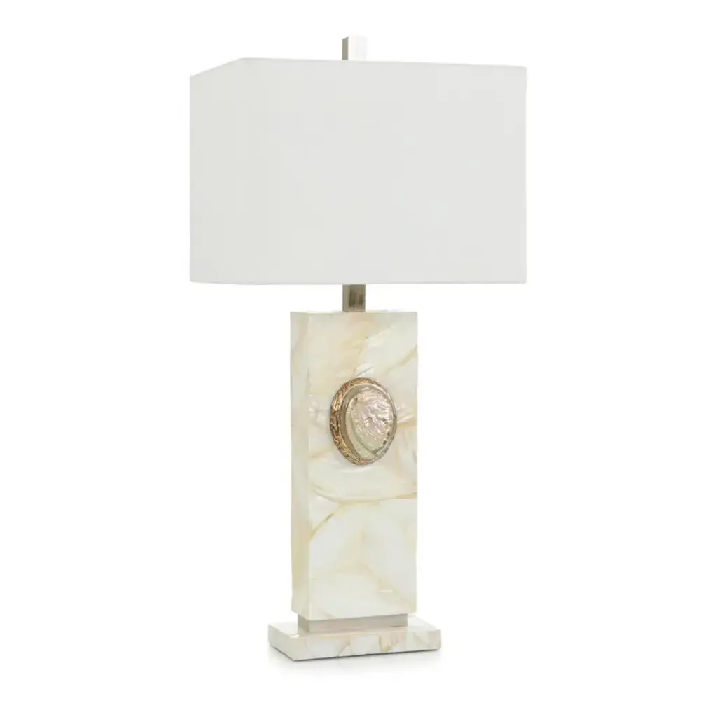 This classic column lamp inlaid with ivory Capiz shell features a bezeled Capiz shell motif on the front. The antique neck adds to the pearlescent of this table lamp.