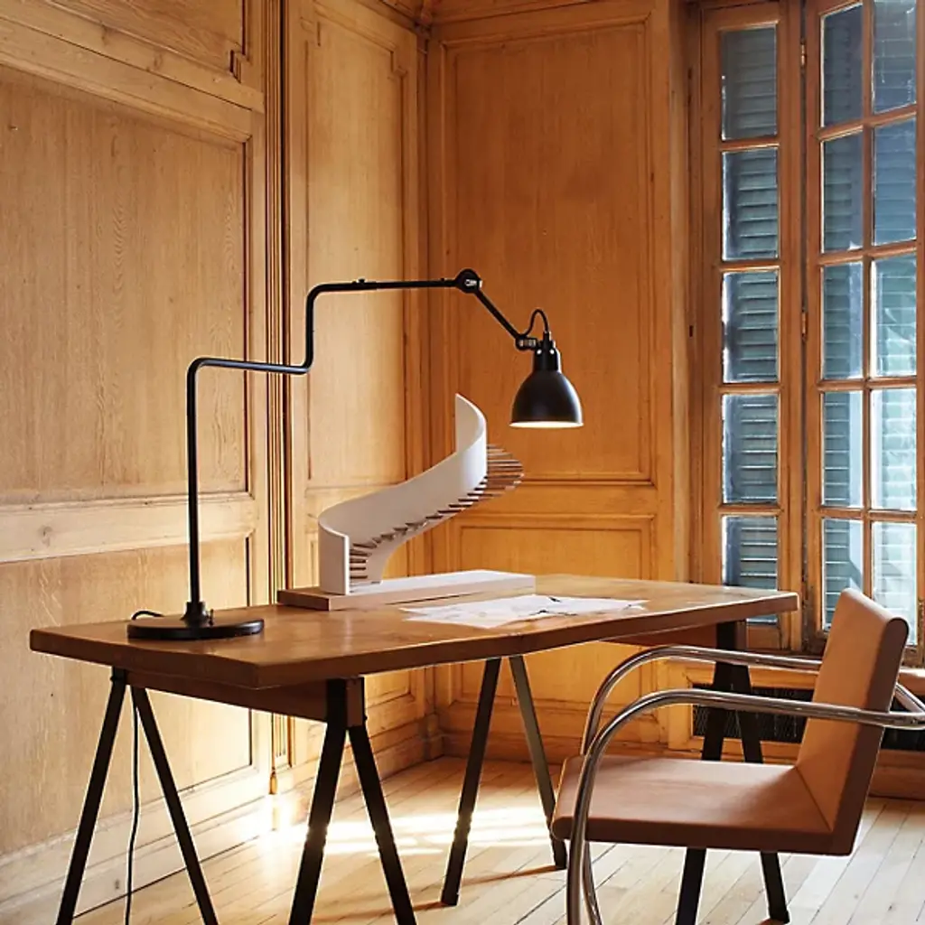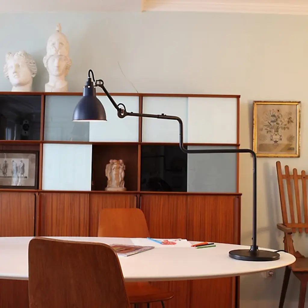 A sleek, ultra-adjustable construction, the Lampe Gras 317 Table Lamp by DCW editions offers stylish task lighting buoyed by a timeless silhouette. Designed in 1921 by Bernard-Albin Gras, this thoughtful update uses a simple, switched disc base to send up a single matte-textured steel arm with several pivot points. The arm then extends in a small, articulated rod and curved metal shade with a single socket set inside, dispatching a tight beam of light easily tailored to its surroundings.