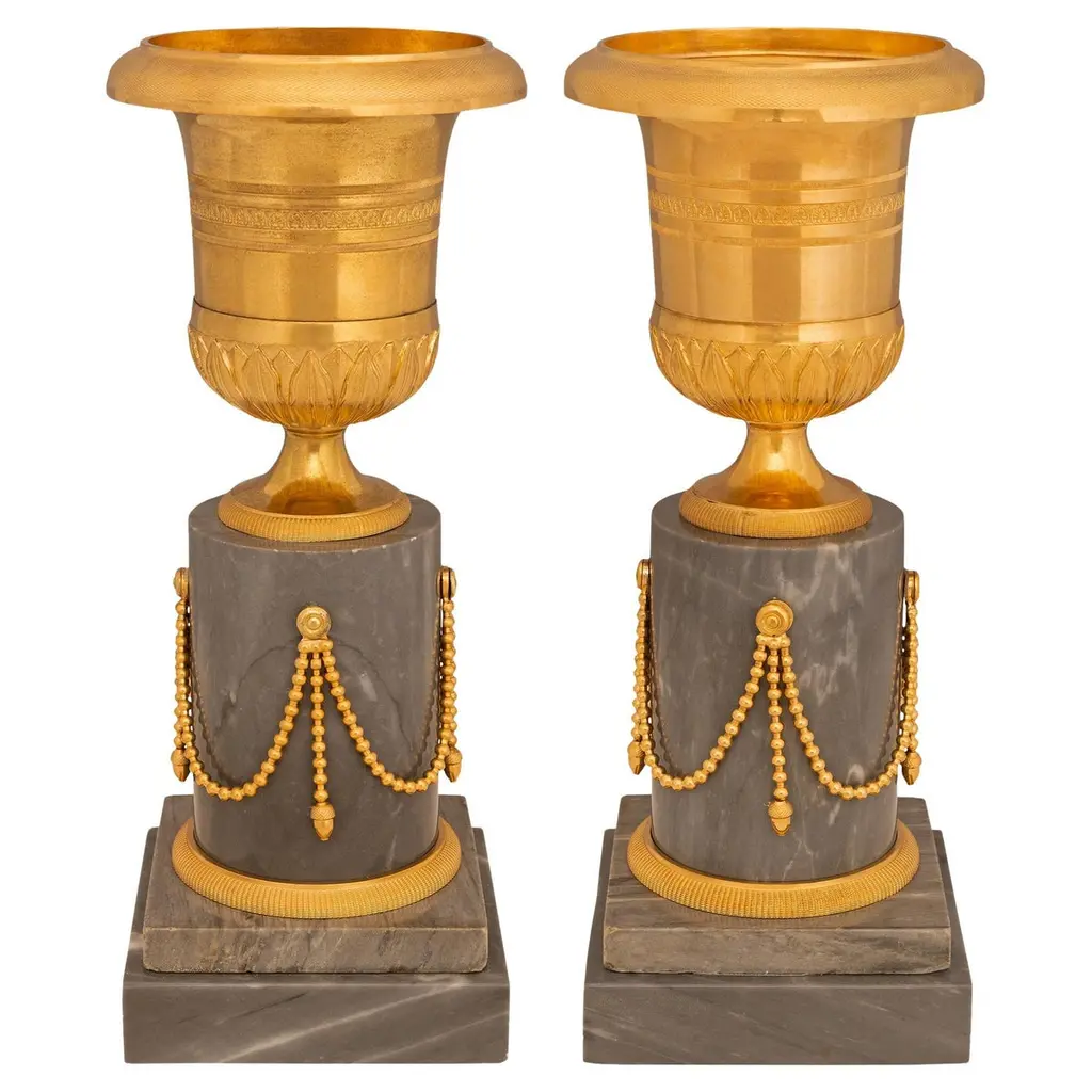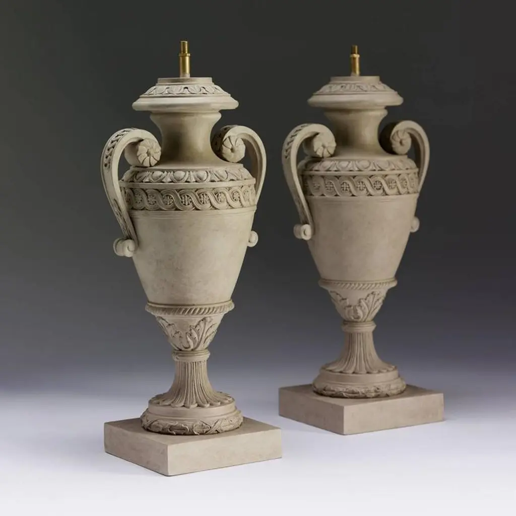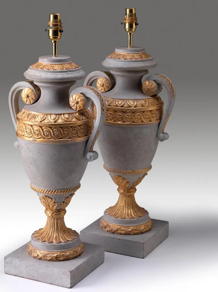 A fine pair of carved and painted Robert Adam inspired table lamps with guilloche and egg and dart decoration, on square platform bases.We are currently working to a 30-36 week lead time.