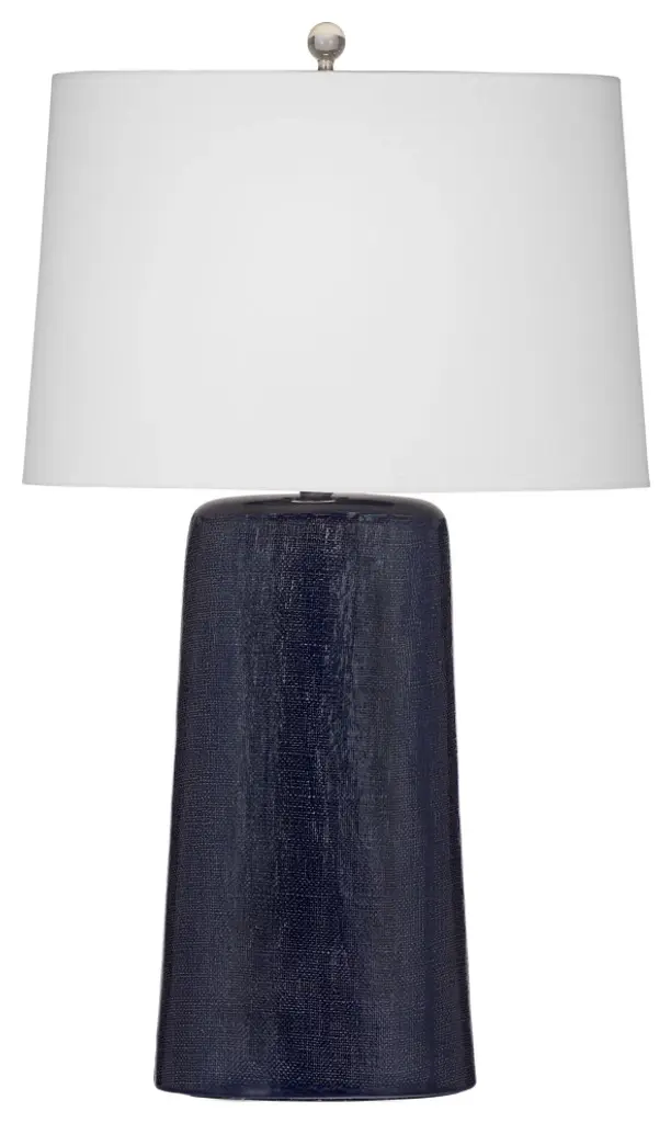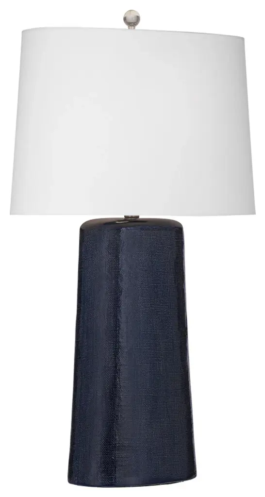 The Lancaster Table Lamp showcases exemplary craftsmanship, meticulously fashioned from ceramic to create a piece that radiates timeless sophistication. Its textured navy finish adds a layer of depth and character, imparting a rich and inviting aesthetic to the lamp. Accompanied by a white oval shade, this lamp achieves a harmonious balance between classic charm and contemporary style. The carefully chosen materials and design elements make the Lancaster Table Lamp an exquisite addition to interior spaces, seamlessly marrying enduring design with a touch of modern allure. The white oval shade complements the textured navy finish, casting a soft and welcoming glow that enhances the ambiance of any room. With meticulous attention to detail and a thoughtful approach to design, this lamp stands as a symbol of seamless integration, offering both functional illumination and an aesthetically pleasing accent to elevate the overall decor.Features:This navy blue table lamp features a modern style.The tapered drum shaped lamp shade is constructed with white fabric.Features a 3 way switch.Lamp cord measures 6 inches, allowing for easy placement.Bulb type a required, not includedEasy assembly - just attach harp, finial and shadeFor over a century, Bassett Mirror has been synonymous with style and quality, transforming homes with its sophisticated and timeless designs. With a wide-ranging collection of furniture, lighting, mirrors, and art, Bassett Mirror seamlessly blends modern style with classic appeal. From rustic modern to luxe glam, each piece is thoughtfully crafted to inspire and elevate any space. Committed to exceptional value and customer care, Bassett Mirror makes it easy for homeowners to create beautiful, personalized interiors with confidence.