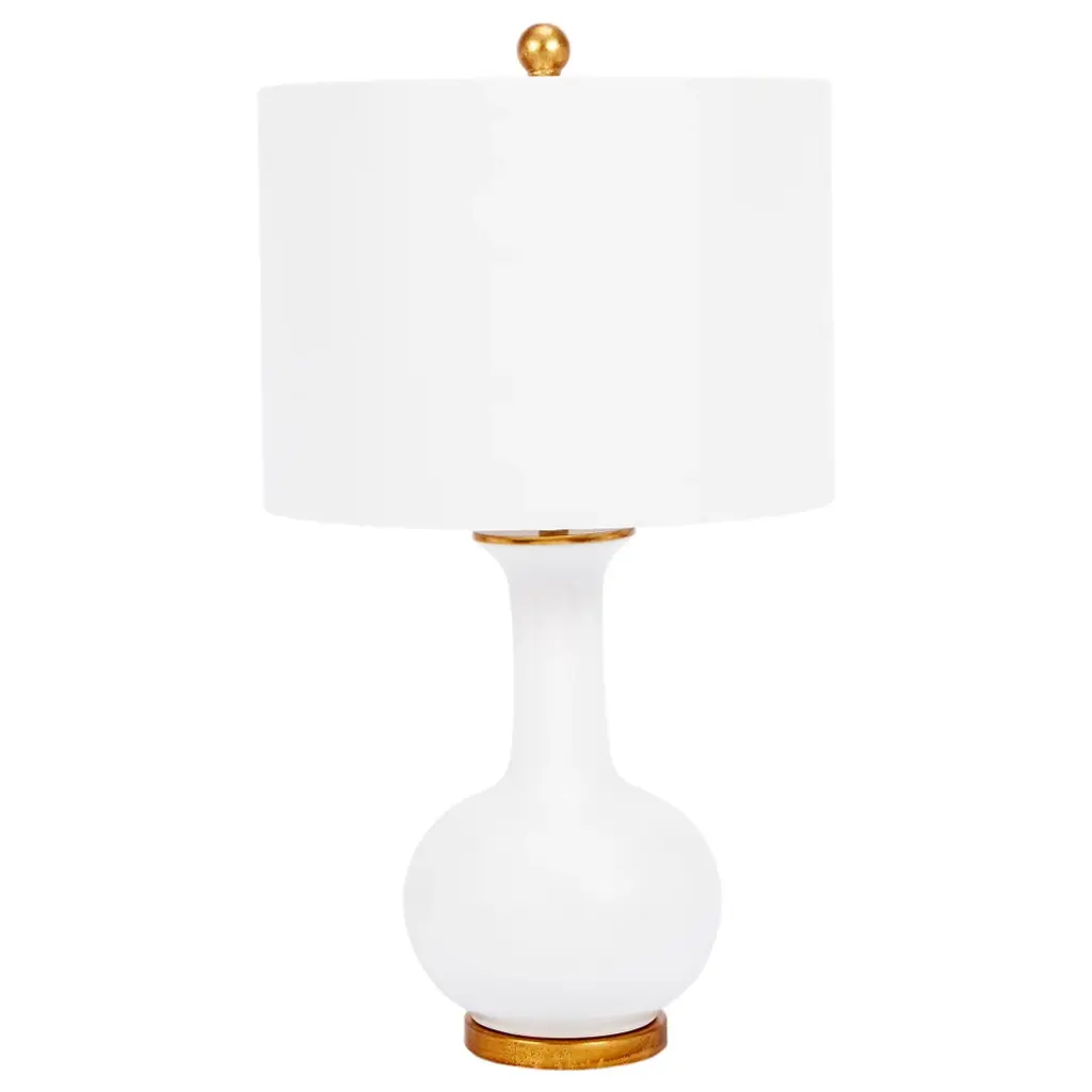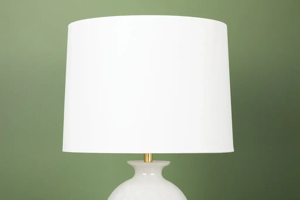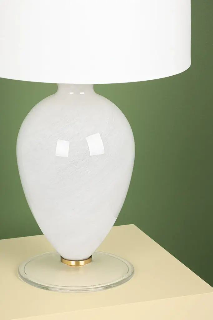 Laney gives the classic table lamp silhouette a gorgeous and intriguing update with a cloud glass base. Light fills the white linen drum shade and casts down to give the base a soft, inviting glow. Aged brass details accent the white hues beautifully.