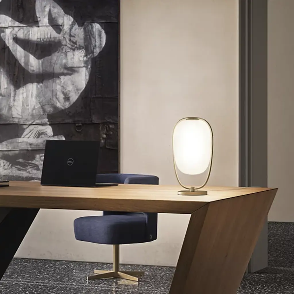 A smooth salute to tradition. The Lanna Table Lamp from Kundalini is a daring design from the mind of Noè Duchafour Lawrance, drawing inspiration from the Lanna Thai ritual of releasing lanterns into the sky to commemorate notable occurrences. A slender oval frame rises from a sleek disc base, suspending powerful LED lamping beneath a disc-shaped housing that also supports a two-layer diffuser of opal glass around it. The glass blunts direct light from all sides and transforms it into a pleasing glow that radiates out evenly in all directions.