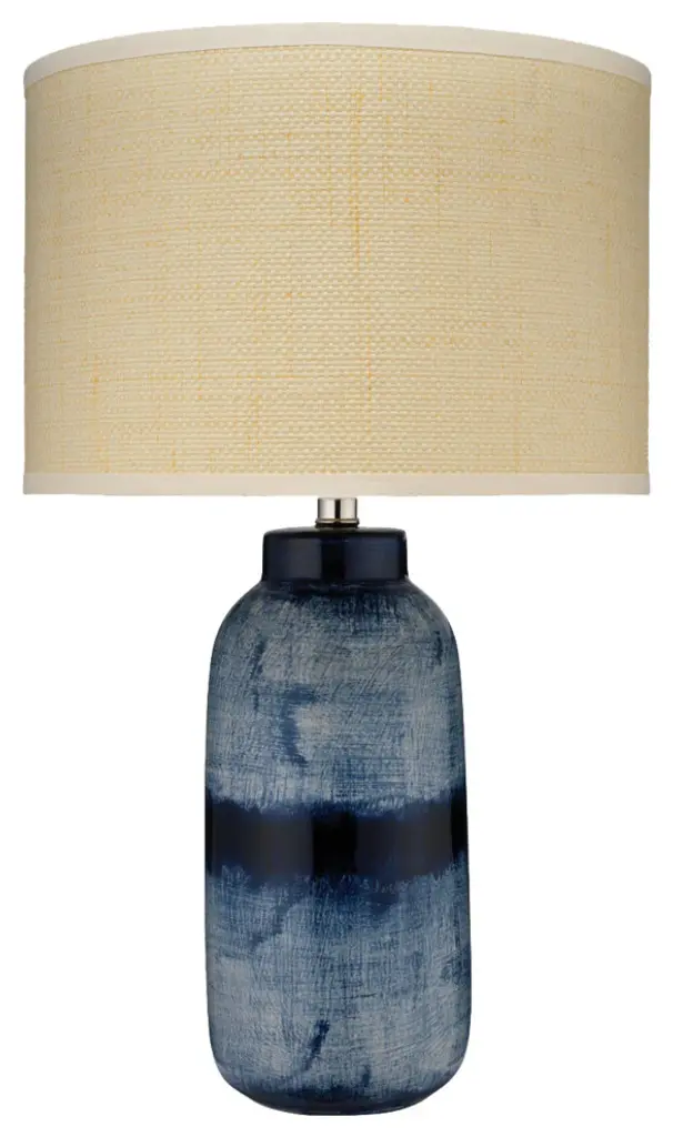 Inspired by Japanese ceramics, this lamp is a stunning ceramic accent that features a deep indigo reactive glaze that results in unique color variations for a one-of-a kind piece. Topped with a natural raffia shade, this accent is great for today''s updated coastal aesthetic. Handmade of ceramic100% Raffia Drum ShadeReactive Glaze makes each piece distinct from the nextMatching Resin Ball FinialThe handcrafted nature of ceramic creates products with character and individuality. The inherent variations in tone or texture, are preserved, to create pieces rich in detail and natural beauty. These unique imperfections and variations are what define our products, with each piece having its own personality. Lamp Dimensions: 15"H x 6.25"W x 6.25"D''shade Dimensions: 10"H x 15"W x 15"D1 bulb required; Bulb Not Included150 Max Wattage; 120 VoltsE26 Bulb Base Type 8 Ft Clear Cord3-way SwitchCare Instructions: We do not recommend using harsh or abrasive cleaners at any time as they can damage product. Wipe surfaces gently with soft, dry cloth. If needed, you may use a lightly damp cloth with water only on base.