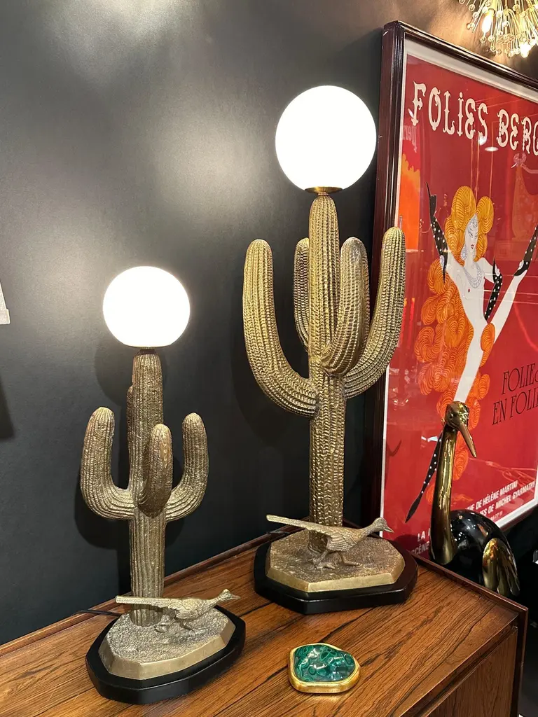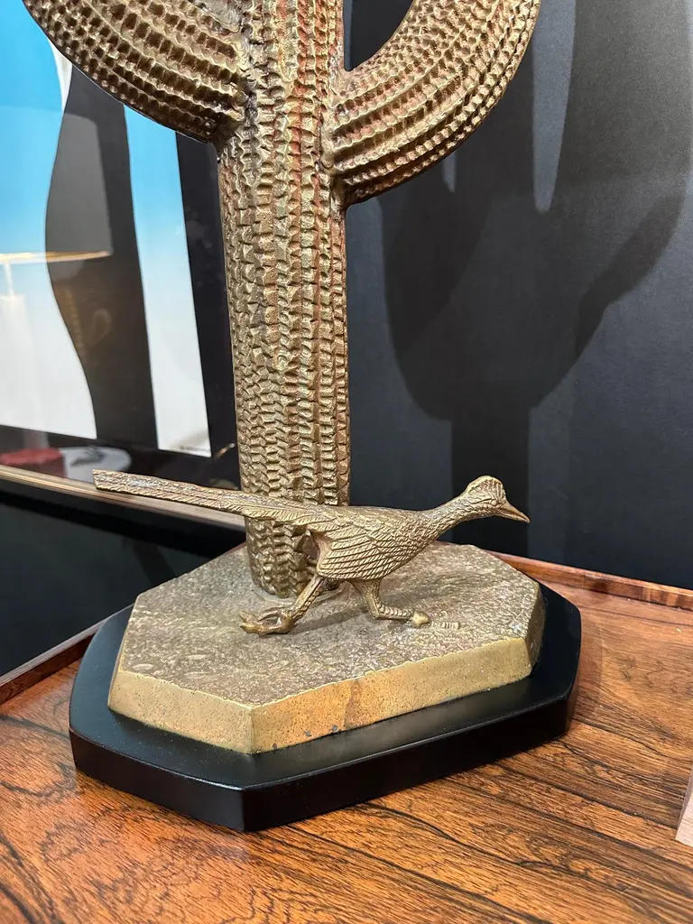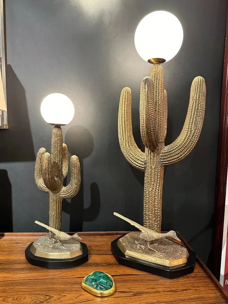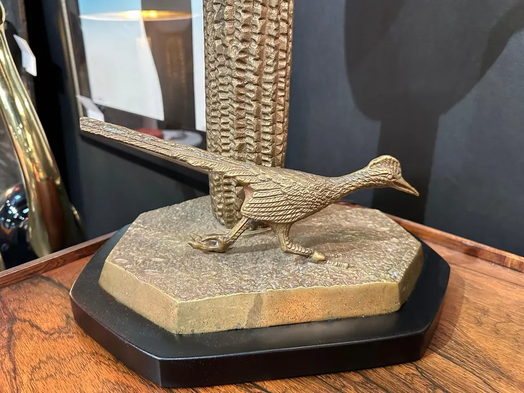 Brass saguaro cactus and roadrunner sculpture from 1970’s mounted as lamps. Only brass cactus is 29" high. Globe shade is 6" diameter and requires candelabra base LED up to 60watt watt bulb.Two available. Price is for one lamp.