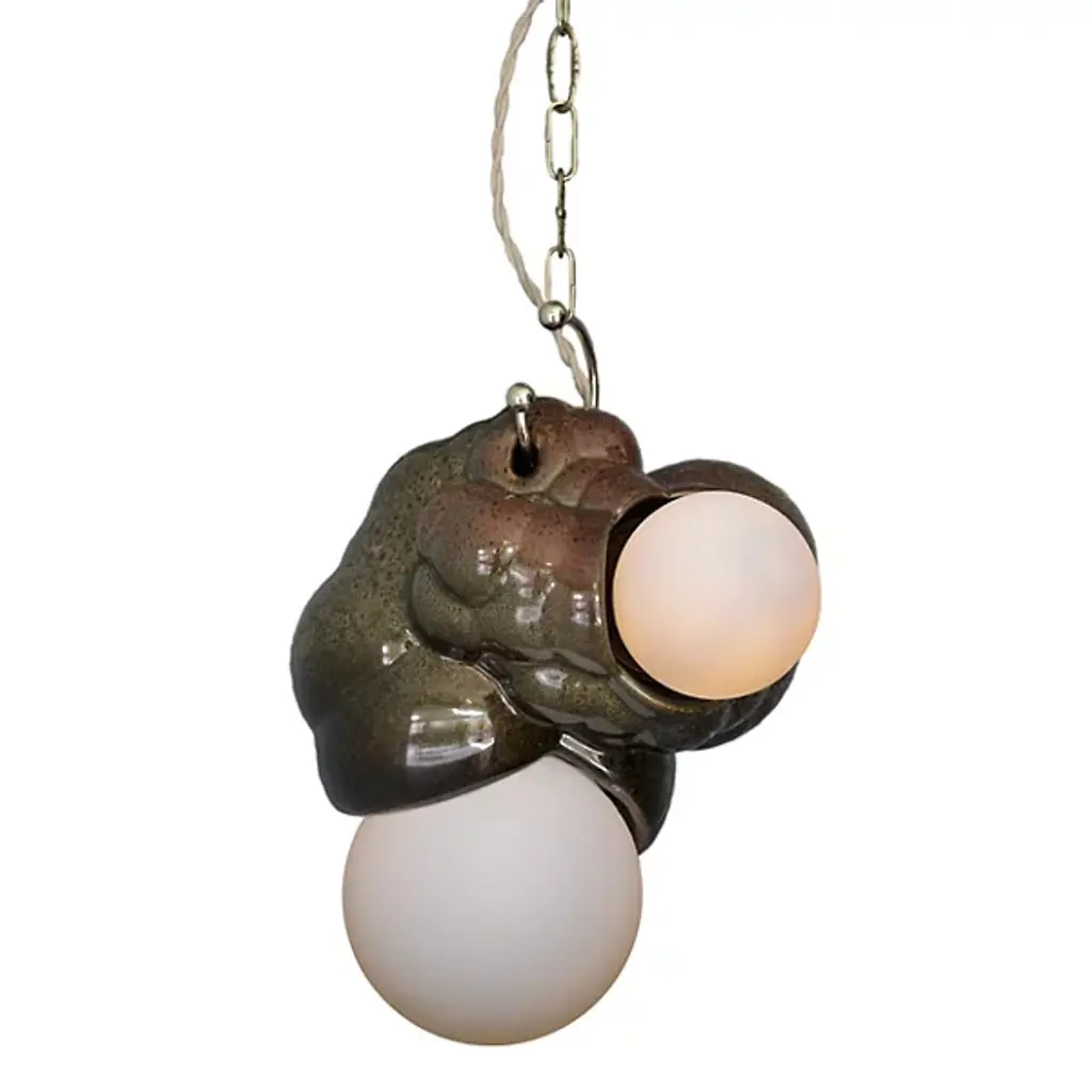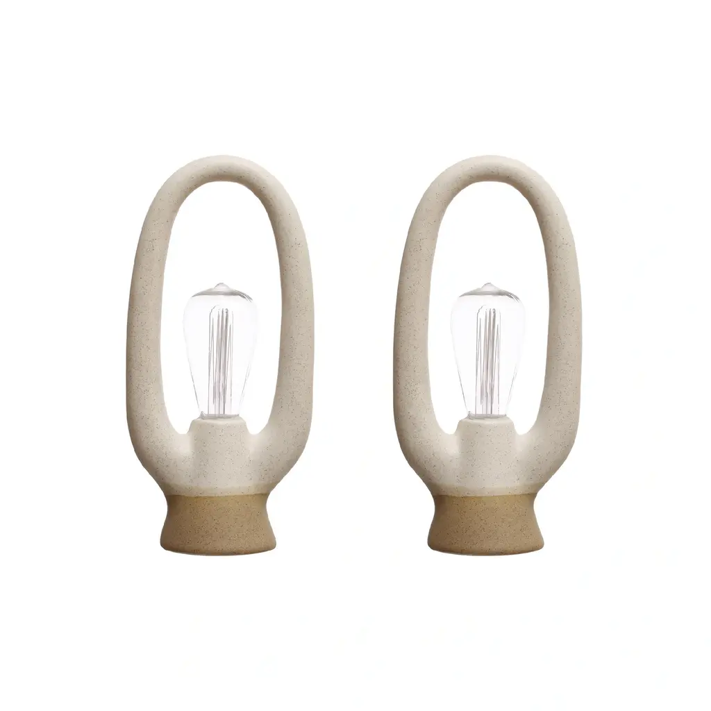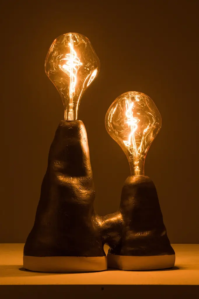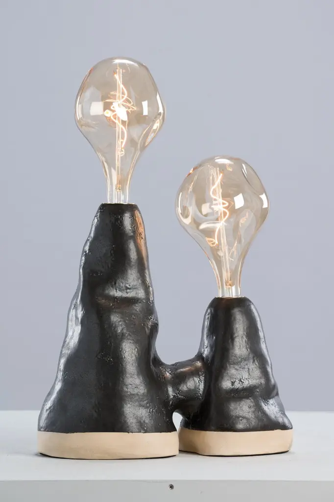 Large double lamp by Sophie RogersDimensions: D 51 x H 50 (base only) / 74 (with bulb) cmMaterials: white stoneware, matte black glaze, aged brassBulb spec: 6W, E27, 340 Lumens, dimmableBlack stoneware and white glaze also available.All our lamps can be wired according to each country. If sold to the USA it will be wired for the USA for instance.Nottingham - based ceramicist Sophie Roger designs and handcrafts sculptural lighting and homewares from her home studio.Her practice centres around the ancient Japanese carving method of Kurinuki, and adaptations on the technique personal to Sophie’s work has enabled her to create large-scale sculptural, functional pieces.Sophie’s practice is heavily material driven, with instinctual making and organic materials at its core. Drawing influence from geological and natural features, she looks to design products that maintain elegance and simplicity, whilst demonstrating a level of skill and complexity with scale.The process allows Sophie to hand craft bespoke pieces that are different every time for the home, contemporary craft, and contemporary design gallery markets.