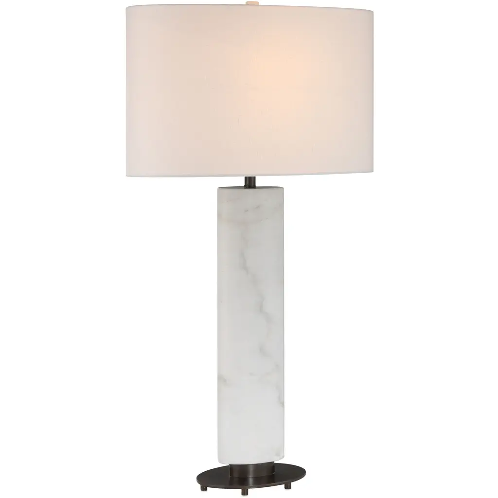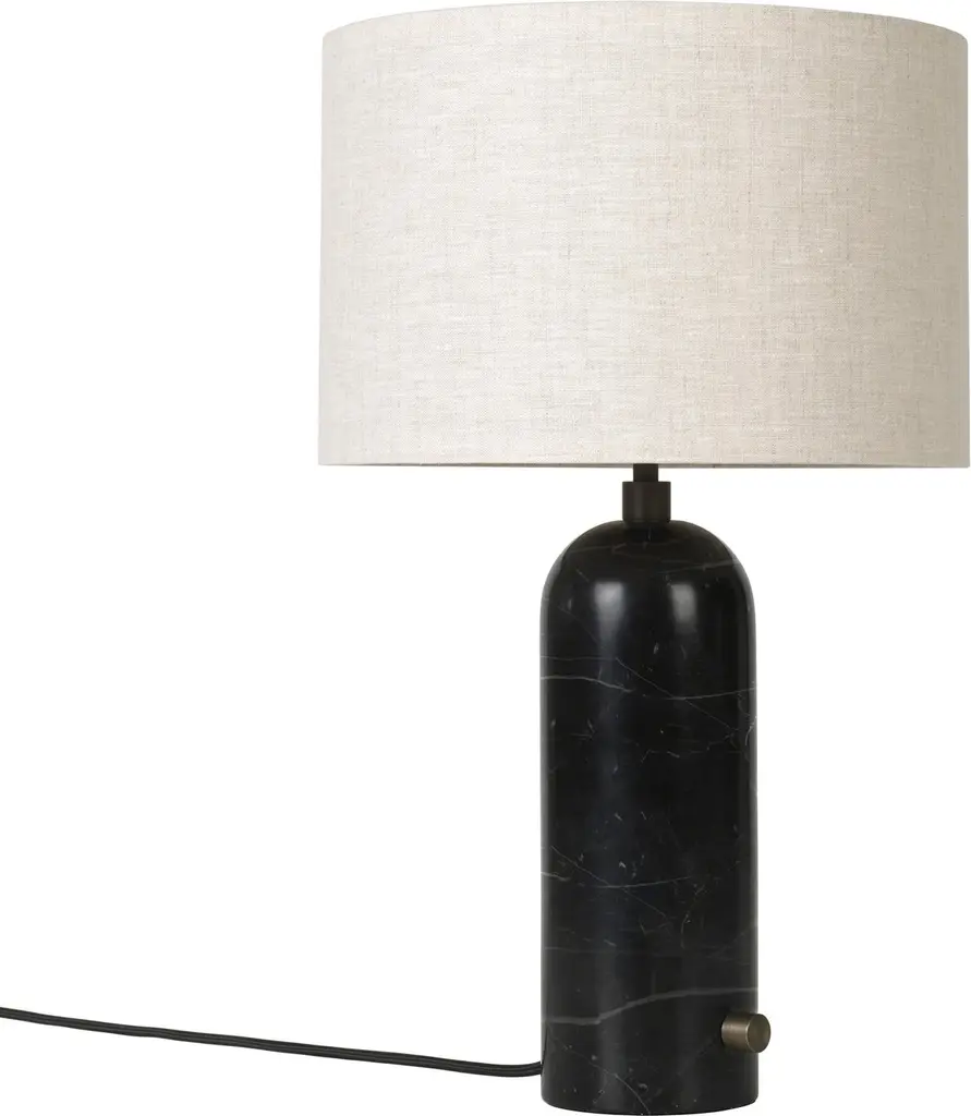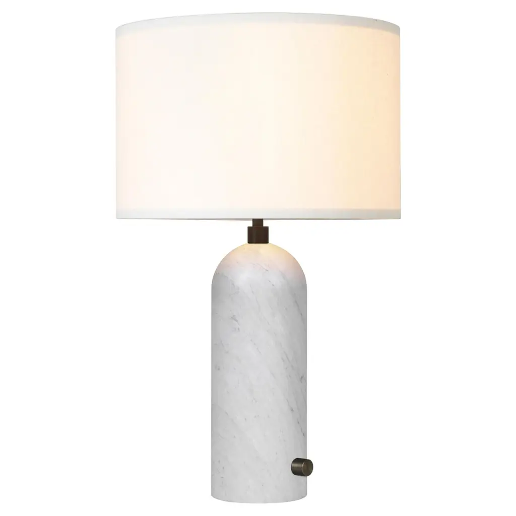 Large 'Gravity' marble table lamp by Space Copenhagen for Gubi in White.Executed in solid marble with a canvas or white textile shade perched atop its stem, the Gravity table lamp designed by Space Copenhagen for GUBI contrasts strength and fragility. The lamp has a distinctive balance between the heavy, cylindrical base and the lightweight, airy shade that beautifully merges into a sculptural whole. The lamp casts an ambient light while serving as statement piece in any room.Established in 2005 by Signe Bindslev Henriksen and Peter Bundgaard Rützou, Space Copenhagen is a design studio working across multiple disciplines from furniture, lighting and refined objects, to art installations, art direction and interior design for private homes, hotels and restaurants all over the world.Price is per item. Available in unlimited quantities in choice of blackened steel base or marble base in black, gray, or white. Choice of white textile or canvas shade. This listing is for the table lamp with white marble base; please specify shade type when ordering.Accommodates 1x 60W equivalent standard medium base (e26) LED bulb (lower with incandescent). UL listed.In-stock lead time 2-3 weeks. For out of stock orders, add an additional 2-3 weeks or more. Can take up to 10 weeks or more. Inventory availability subject to change at any time. Made to order. All sales are final. Please note that marble can vary from item to item due to the organic nature of the material.
