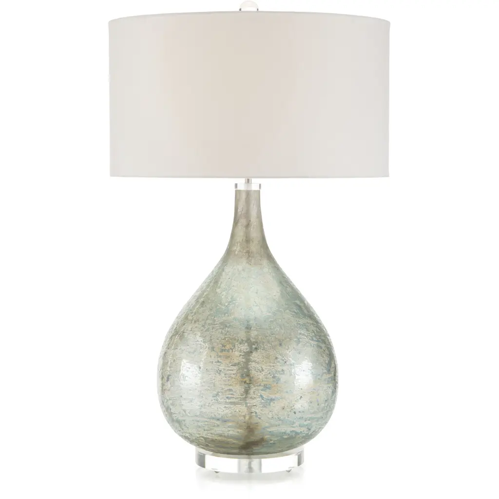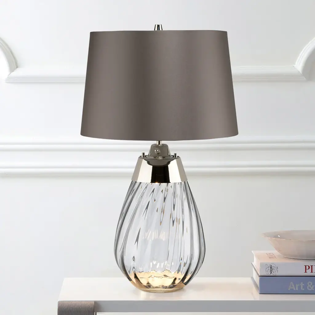 Large twisted mouth-blown glass with a Blue tint and Polished Nickel metalwork. This Dual-lit table lamp has a 4-way switch to light both the shade and base. Includes an Off White Satin shade.