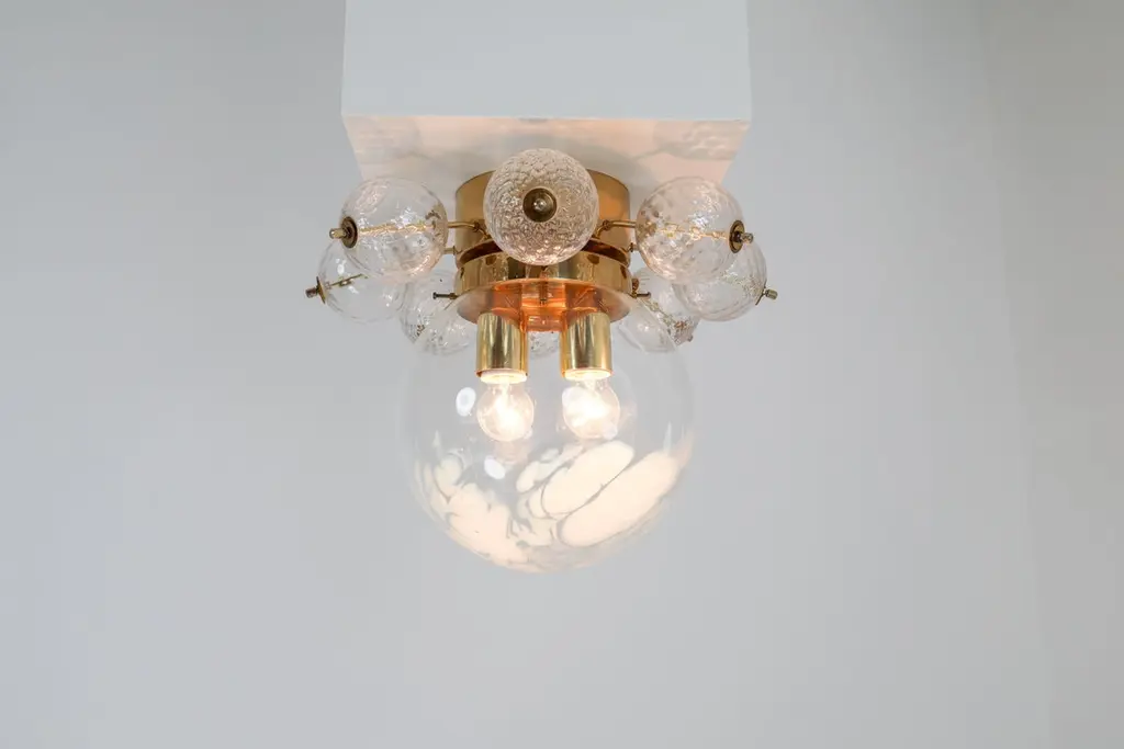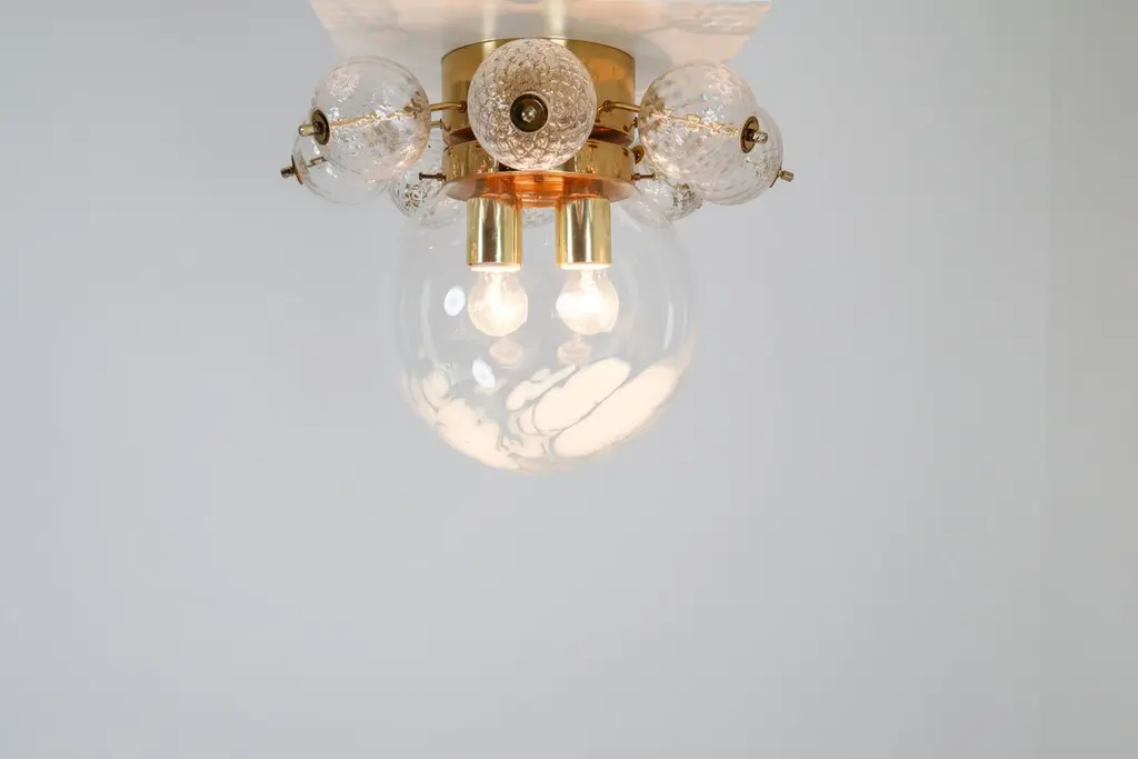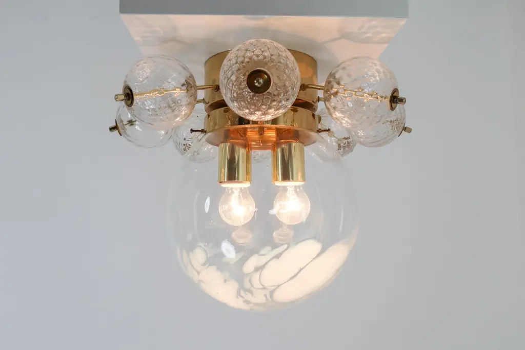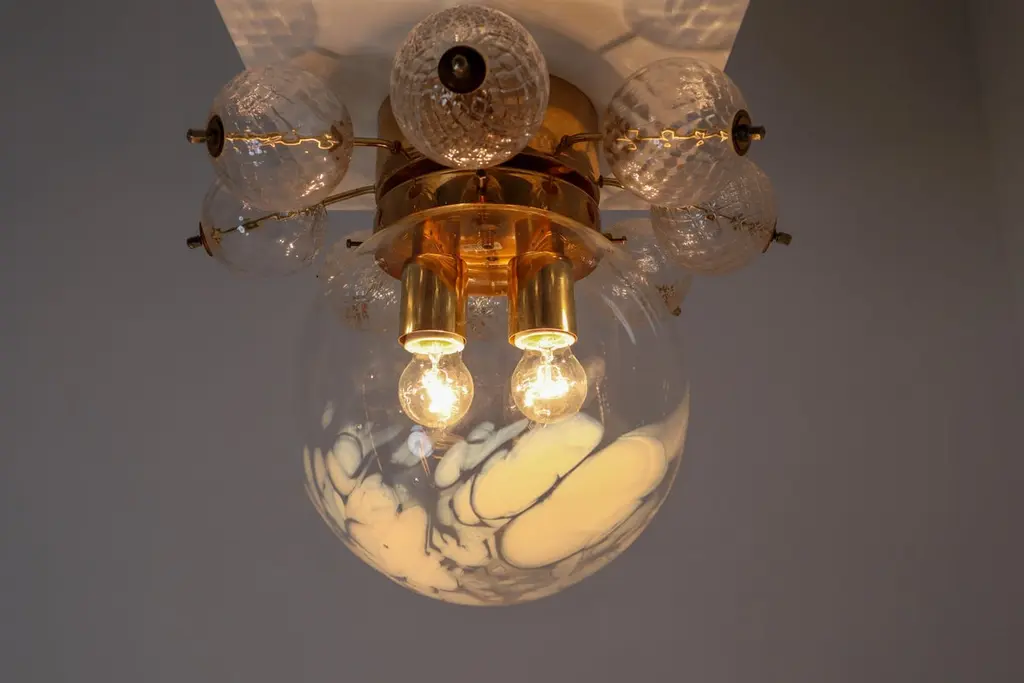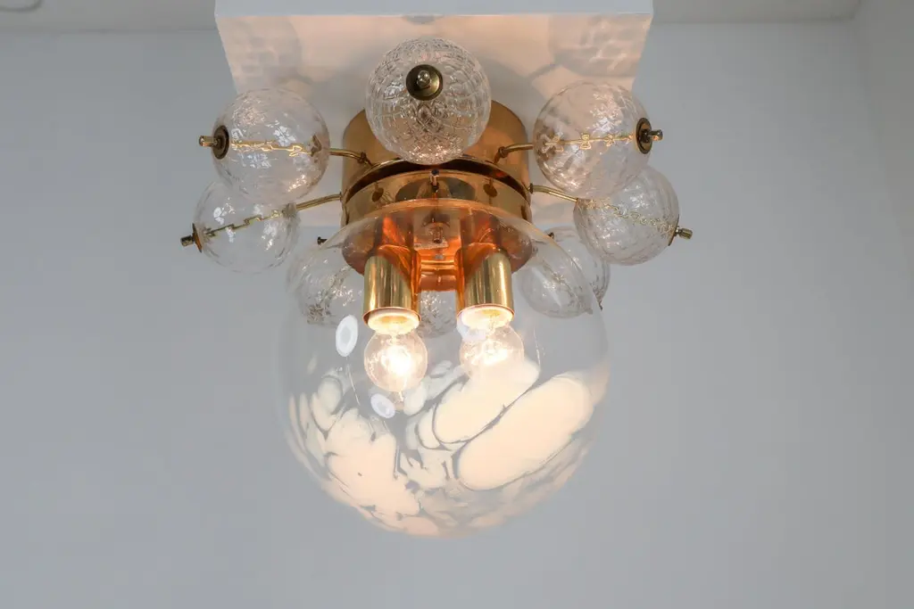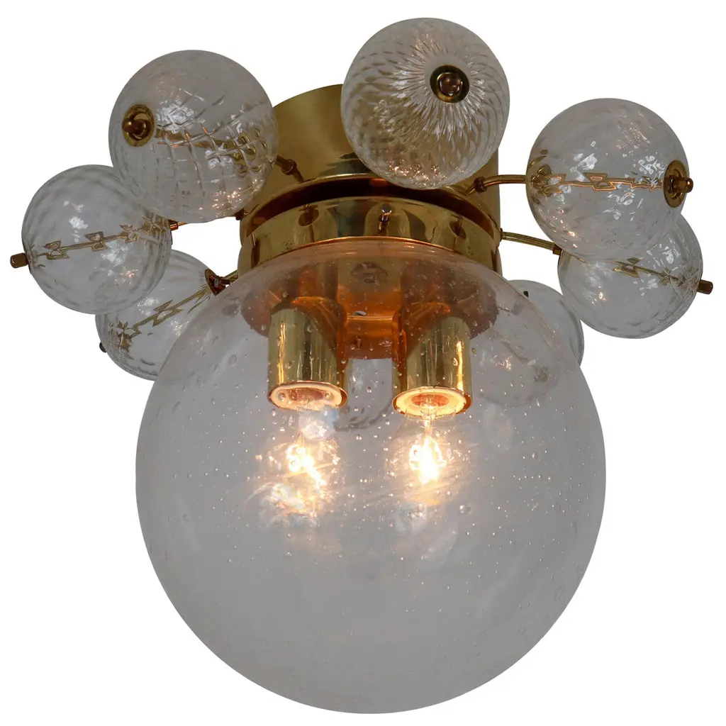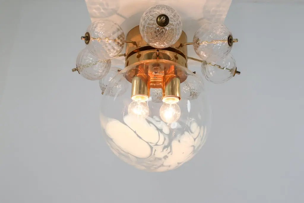 Large Midcentury Brass Ceiling Lamp-Chandelier With Hand Blown Art-Glass, 1960s