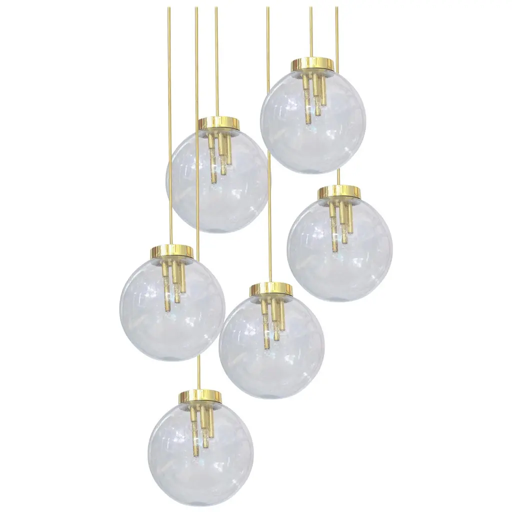 Large ceiling lamp-chandeliers with brass base and large hand blown art-glass globe. These clear hand blown glass globe are decorated with white streaks. The globe show a different and unique semi transparent, diffuse surface, which looks wonderful. Completed with the structured glass and brass details, these chandeliers will contribute to a luxurious character of the interior. Perfect original condition with a small patina on brass parts. 4 items available, price per item.