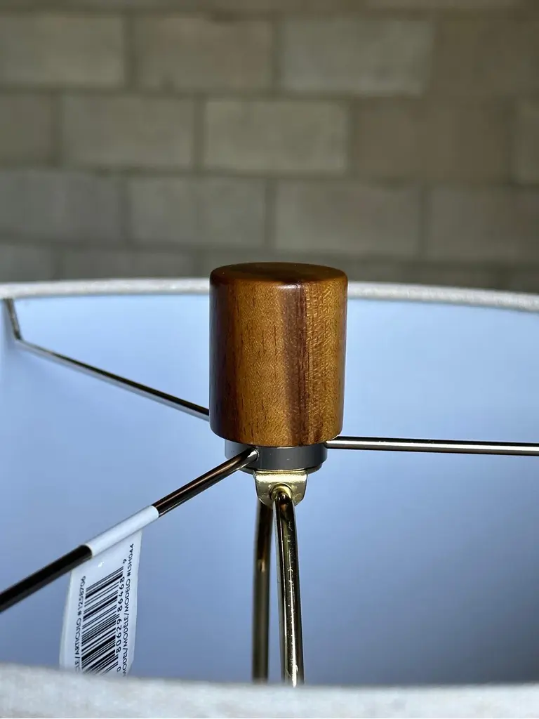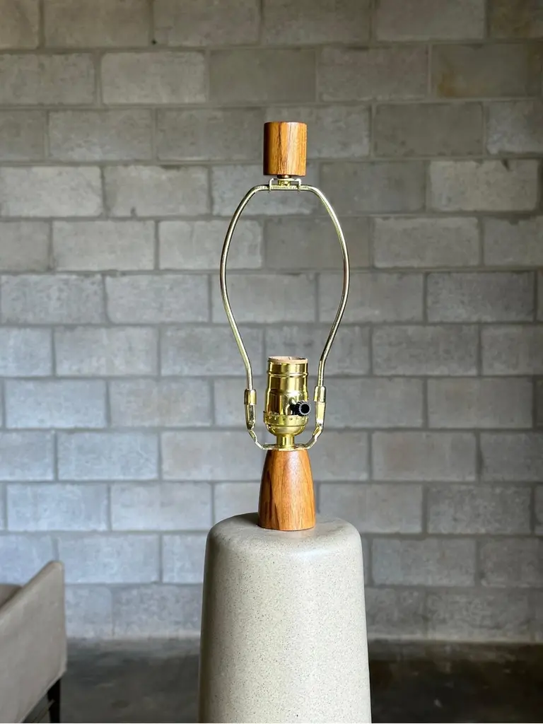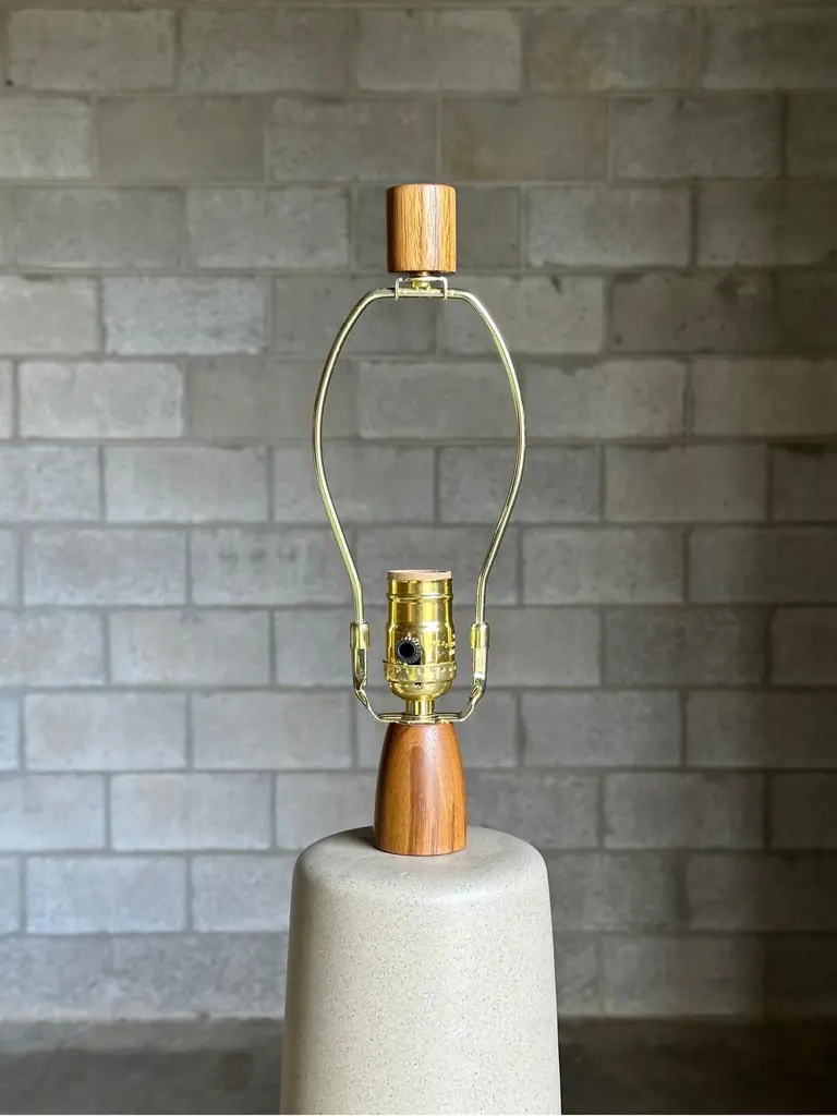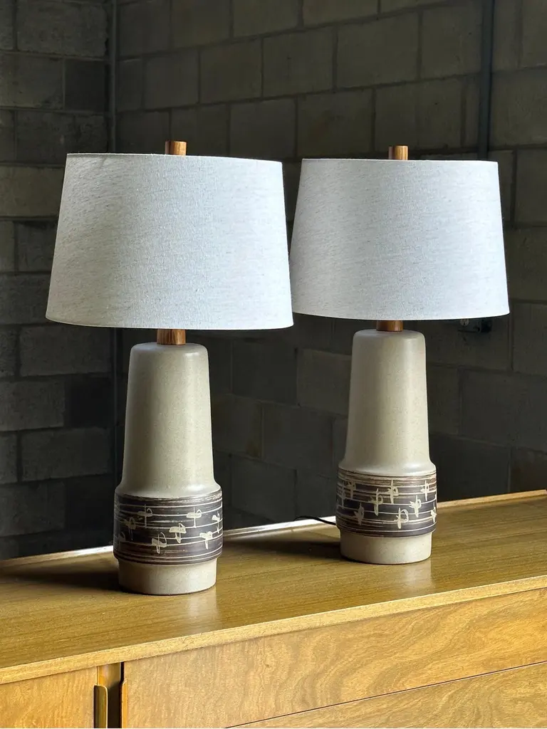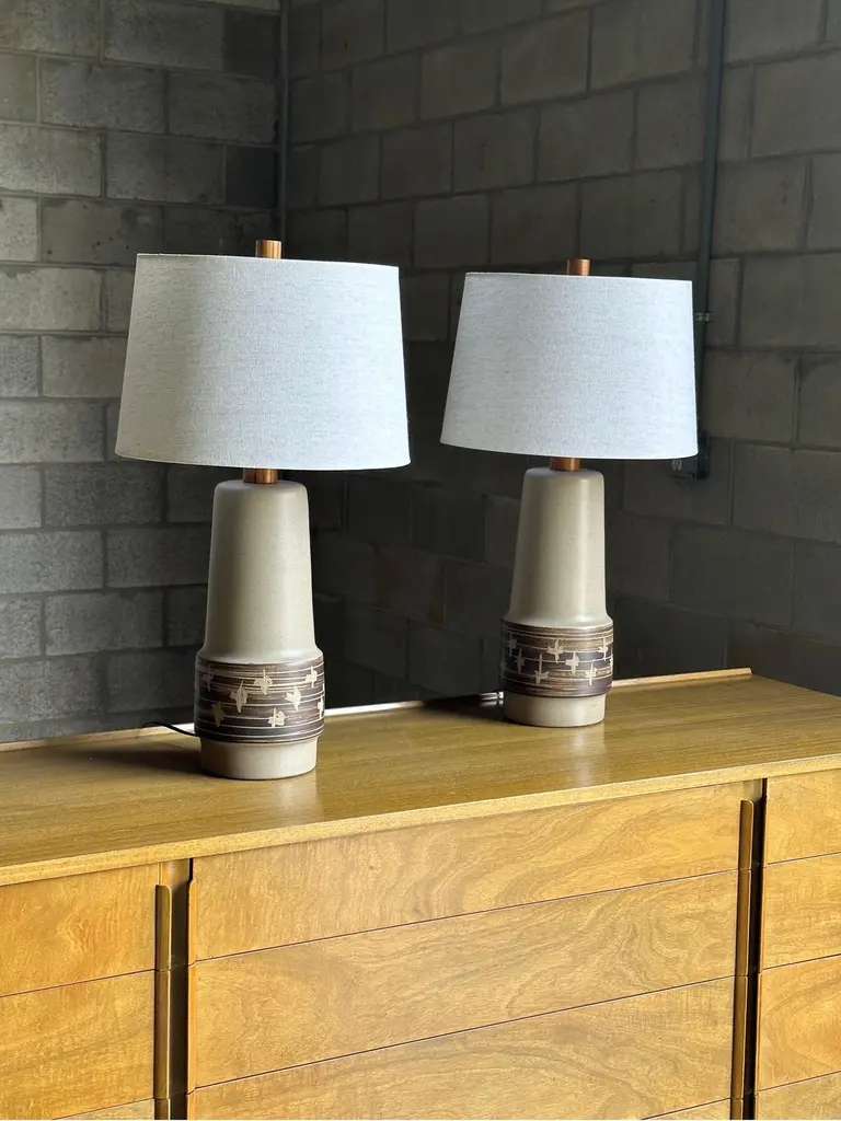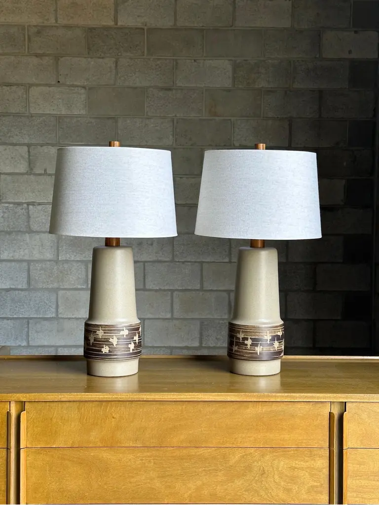 Large pair of lamps by ceramicist duo Jane and Gordon Martz for Marshall Studios. Wonderful tan color with faint blue speckles with patterned detail around bulge. These lamps were sourced as “new old stock” ceramic lamp bases. They are authentic Martz bases that hadn't yet been fitted with lamp components. The solid teak neck and finial, along with all wiring/ sockets/ hardware, is new. Overall as shown: 27.5” tall 15” wide Ceramic Portion 15” tall 6.5” wide Shade 13" top 15" bottom 10 tall