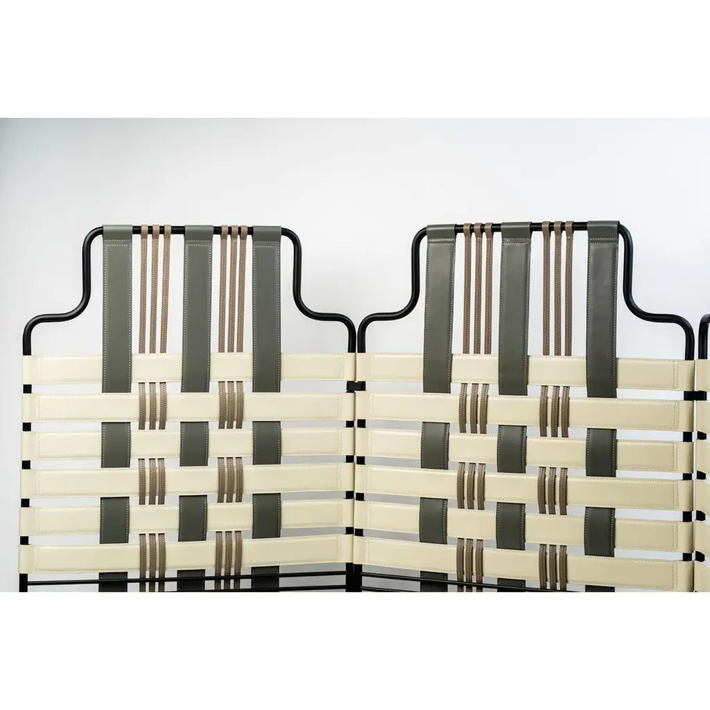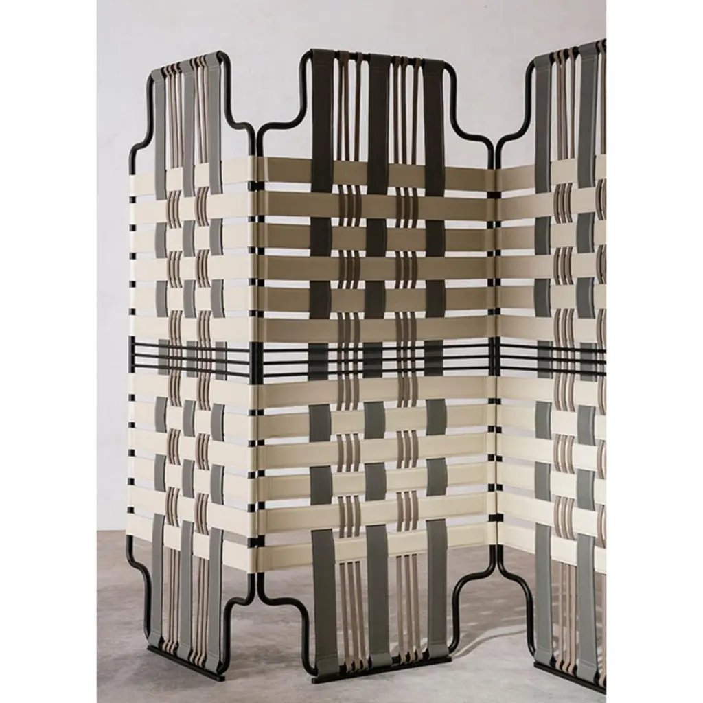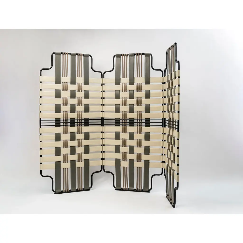 Large venier screen by Sebastian HerknerMaterials: black powder-coated metal, HideDimensions: W 248 x D 2.5 x H 177.8 cmOther dimensions available: small: W248 x D2.5 x H141.8 cmThe appeal of the Venier screen resides first in its decorative quality, even before any consideration forits function. Rather than adapt to any sort of interior setting, it enhances the surrounding decor and drawsattention by its very distinctive and flamboyant character.The strips of coloured leather crisscrossing against the metal structure create an unusual geometric effectand a sense of movement. The meticulous weaving work and attention to material quality heighten itspracticality and pleasant aura. With a decorative manner, Venier suggests a division within a roomwithout completely fading away into the background.The German designer Sebastian Herkner, born 1981, studied Product Design at HfG Offenbach University of Art and Design. Designing objects and furniture, he honed his keen sense for materials, colors and textures. After working for Stella McCartney in London, Sebastian Herkner founded his own studio in 2006 and he has designed furniture, lamps and smaller items for manufacturers.An unconditional love for traditional craftsmanship paired with a good feel for new technologies, a trueflair for color, authentic materials and textures, an unadulterated curiosity for different cultures, theseare the characteristics of Sebastian Herkner’s work, from objects and furniture creation to interior architecture projects. His works have won numerous prizes. Maison&Objet Paris has also elected him 2019“Designer of the Year”.