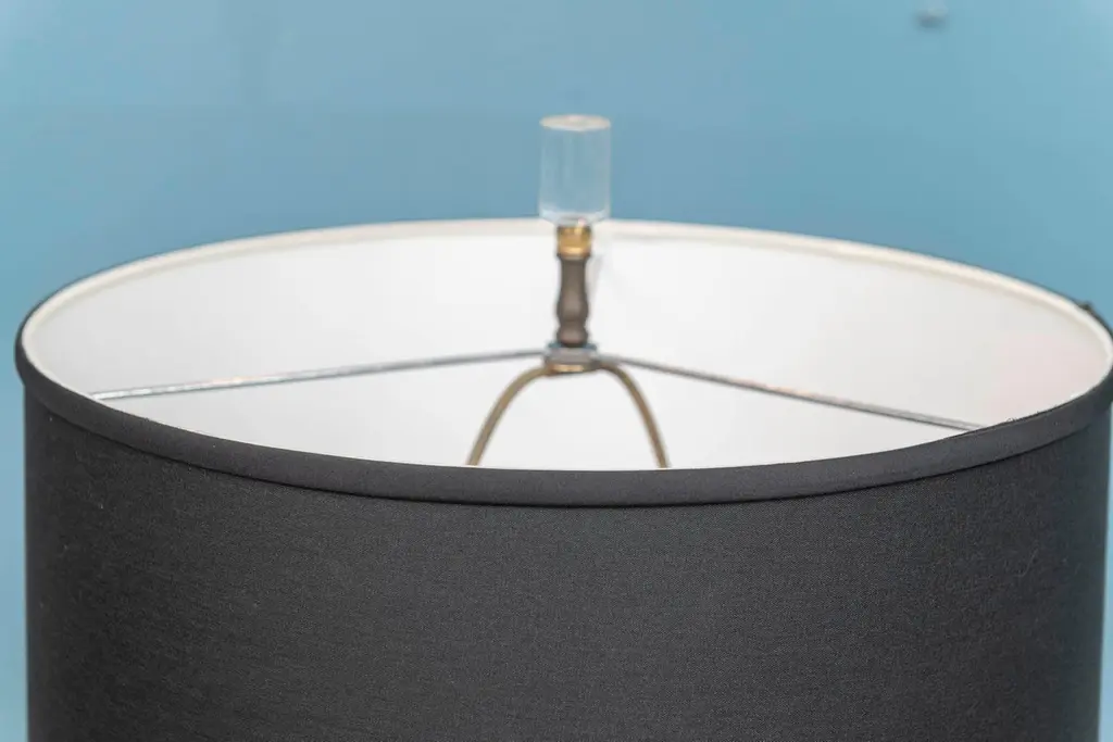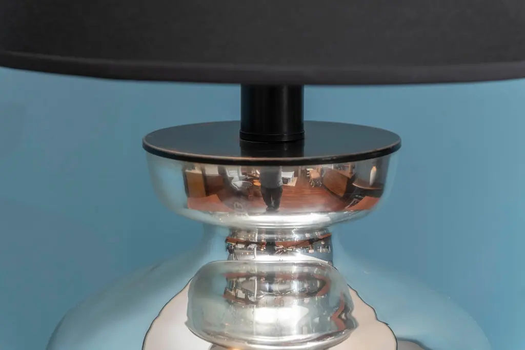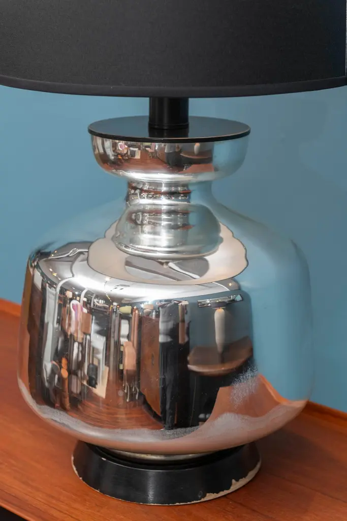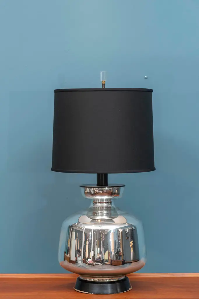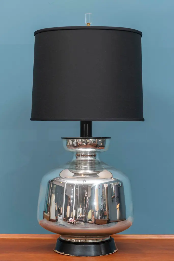Large vintage mercury glass table lamp. Impressive size and scale in original condition and works as it should. Age related wear to the black painted wood base, shade not included.