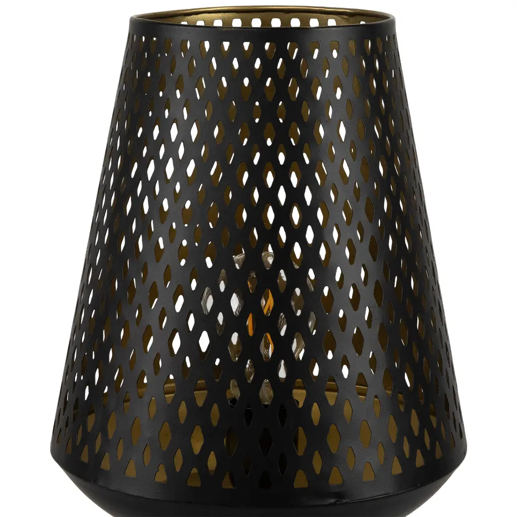Discover the perfect blend of modern elegance and rustic charm with this iron table lamp. Featuring a laser-cut diamond pattern, this lamp casts intricate shadows that add a touch of sophistication to any space. The black and gold finish enhances its contemporary appeal, while the sturdy wood base brings warmth and stability. Ideal for living rooms, bedrooms, or offices, this table lamp is a stylish and functional addition to your décor. Product Features: Base: E26 Lamp uses (1) 60 watt bulbs - not included 2-way button switch Wire color: black Cord length: 7.5' UL listed for indoor use 120 volts, 60 hertz, 7 watts Dimensions: 11"H x 9”W x 9”D Material(s): iron/wood