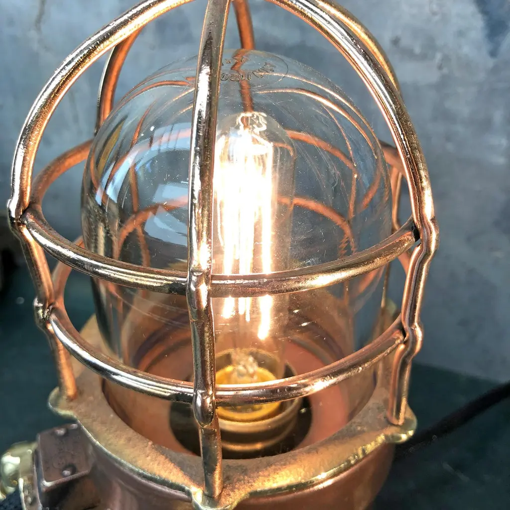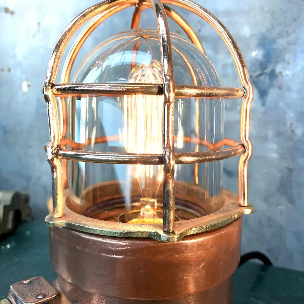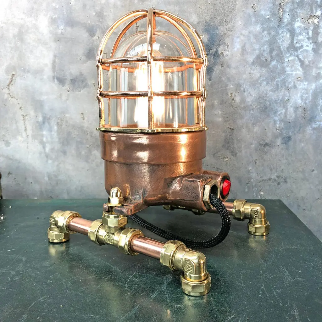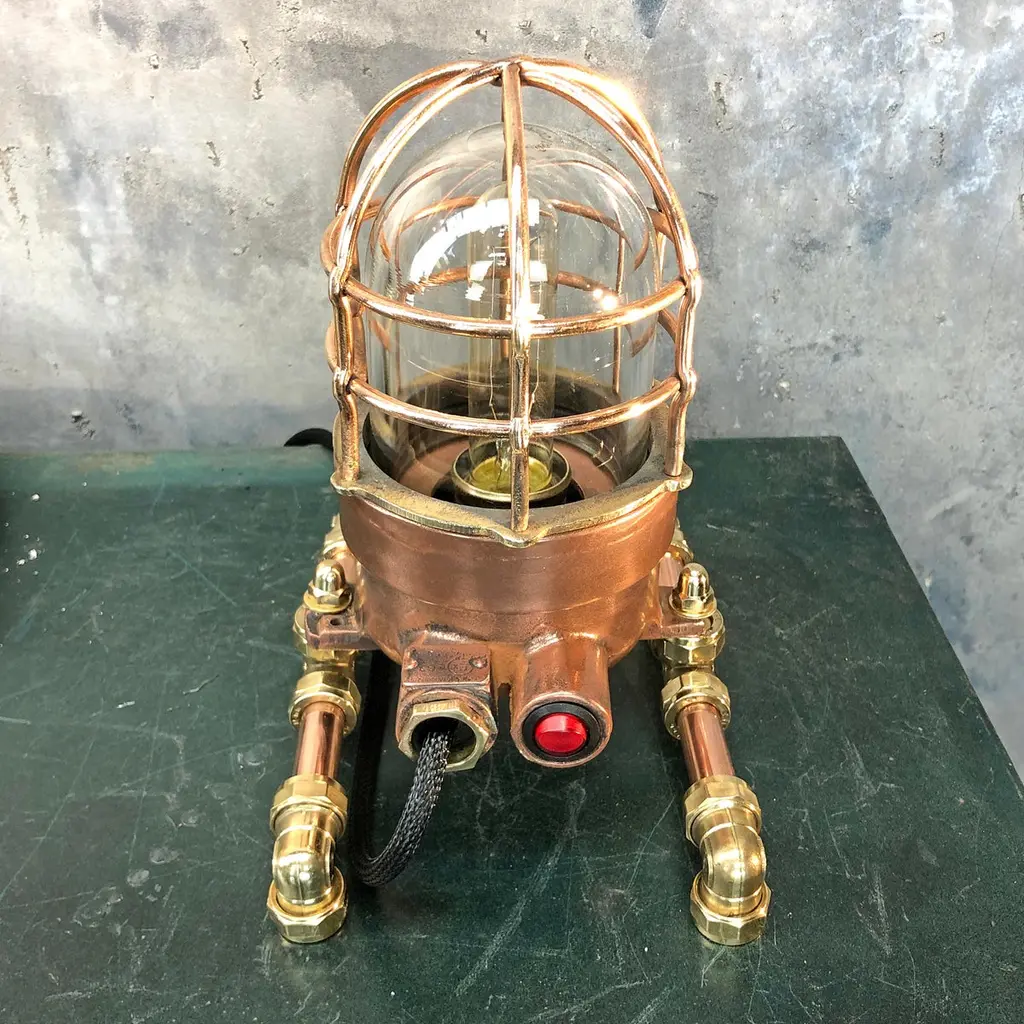 1970s explosion proof passage way light reclaimed from a super tanker modified to function as a table or desk lamp.The light itself is made from copper and brass and has a tempered glass dome and protective cage.These lights were manufactured by Wiska of Germany and are designed and built to withstand the harshest of conditions endured by heavy Industrial vessels transporting hazardous cargo across the globe. The design of this light has stood the test of time and are still manufactured to the same specification today.Loomlight have expertly stripped, polished and replaced all the electrical wiring and fitted an Edison bulb and red glow switch, mounted the lamp on copper and brass compression footings.Dimensions:Width of lamp - 14cmDepth of footings - 20cmHeight - 27cmWeight - 5kg.