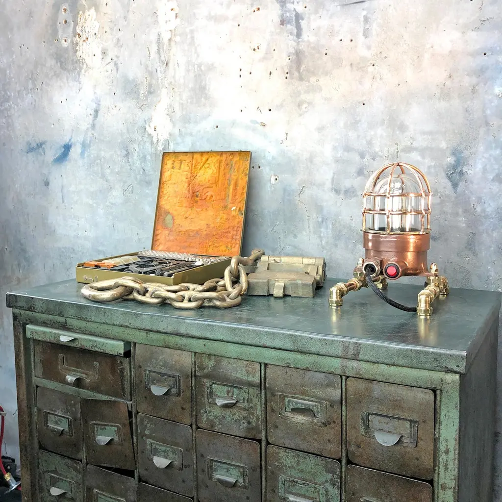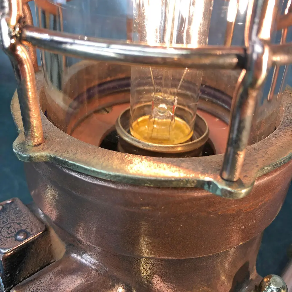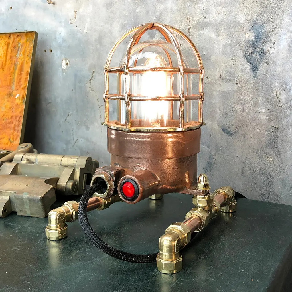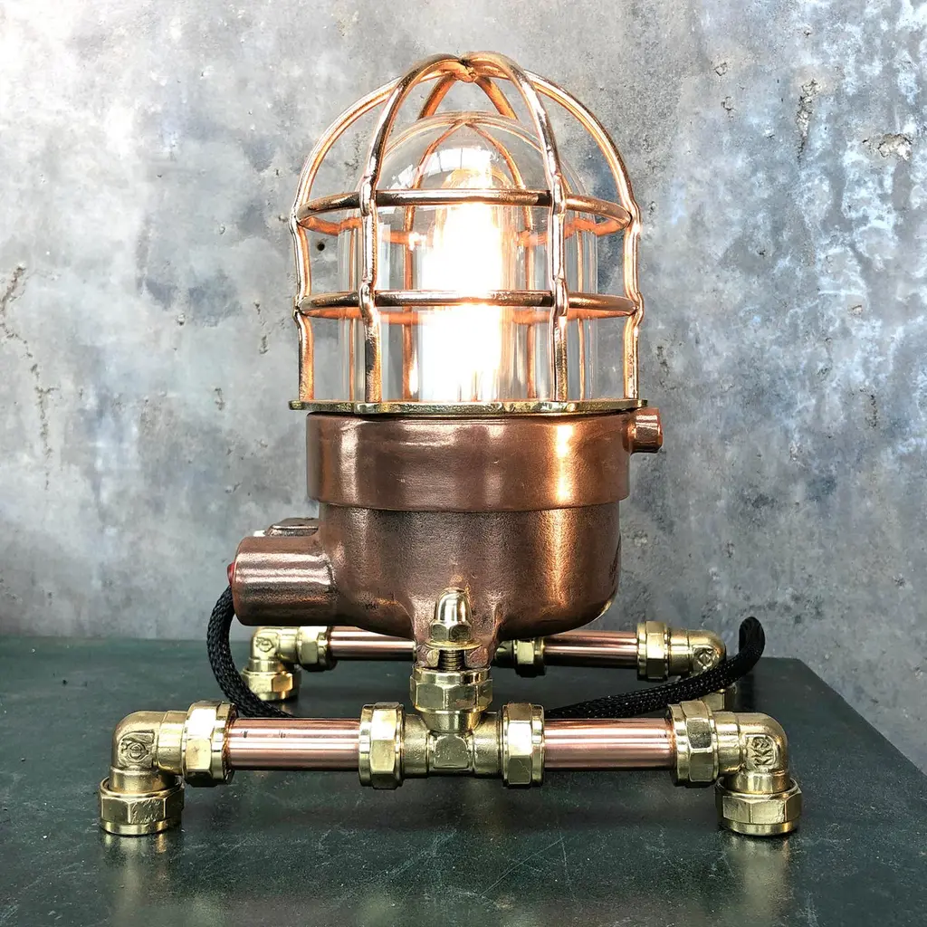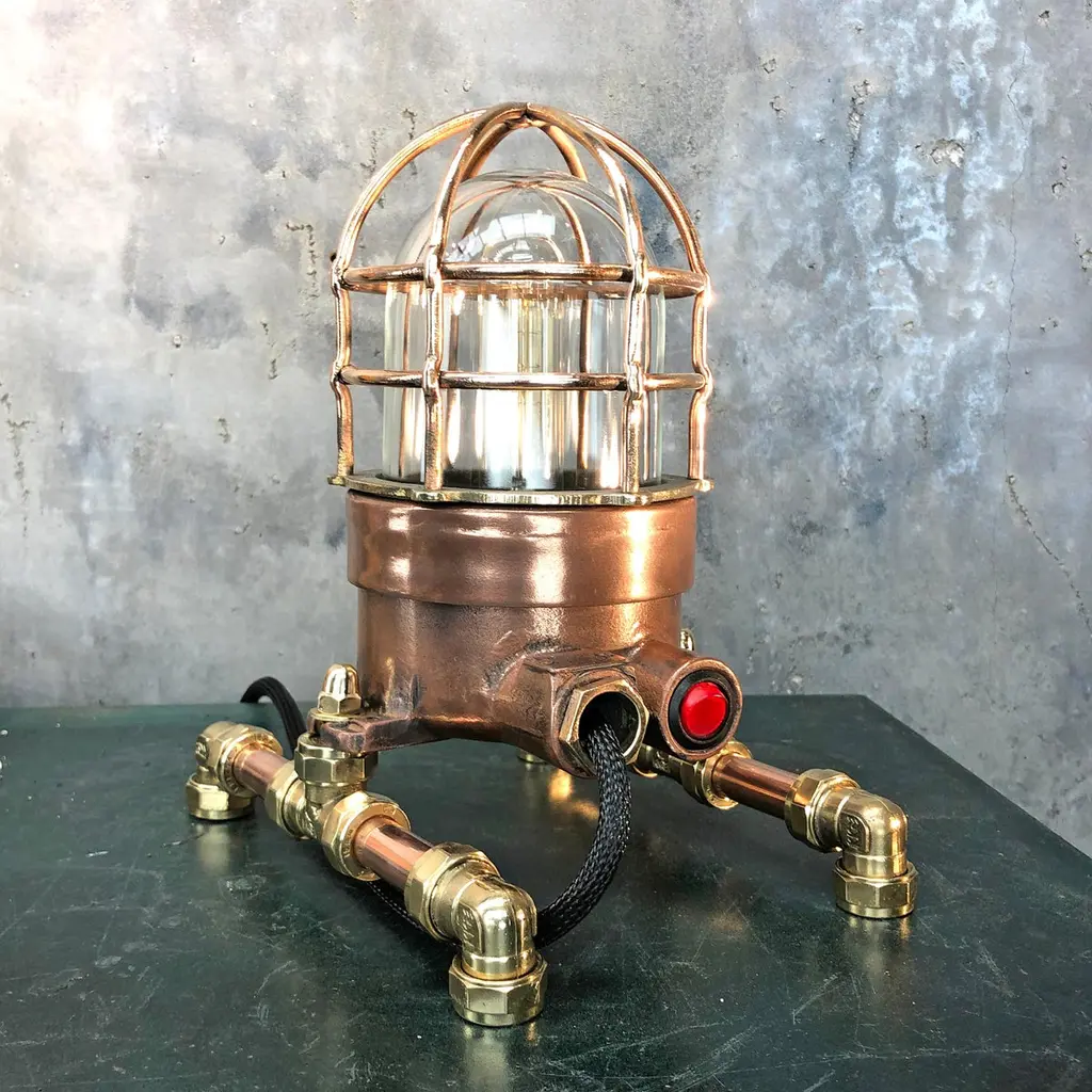 1970s explosion proof passage way light reclaimed from a super tanker modified to function as a table or desk lamp.The light itself is made from copper and brass and has a tempered glass dome and protective cage.These lights were manufactured by Wiska of Germany and are designed and built to withstand the harshest of conditions endured by heavy Industrial vessels transporting hazardous cargo across the globe. The design of this light has stood the test of time and are still manufactured to the same specification today.Loomlight have expertly stripped, polished and replaced all the electrical wiring and fitted an Edison bulb and red glow switch, mounted the lamp on copper and brass compression footings.Dimensions:Width of lamp - 14cmDepth of footings - 20cmHeight - 27cmWeight - 5kg.