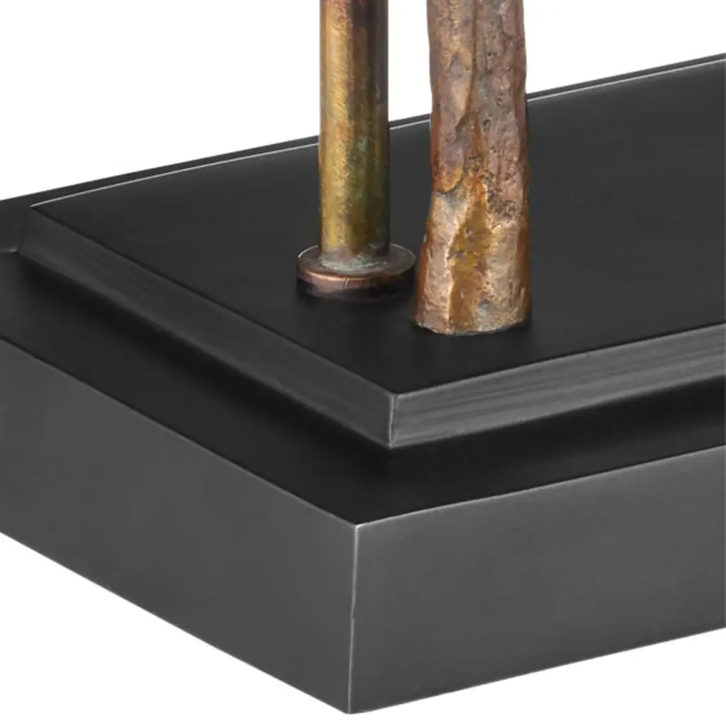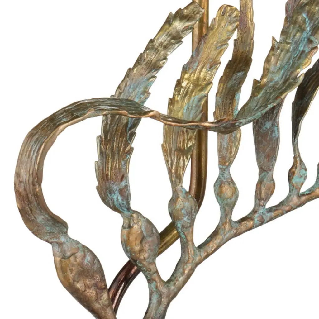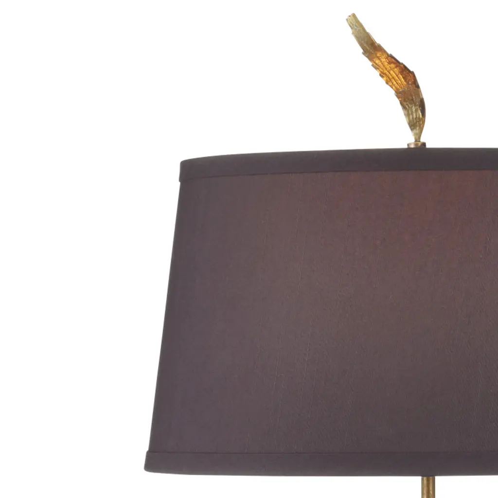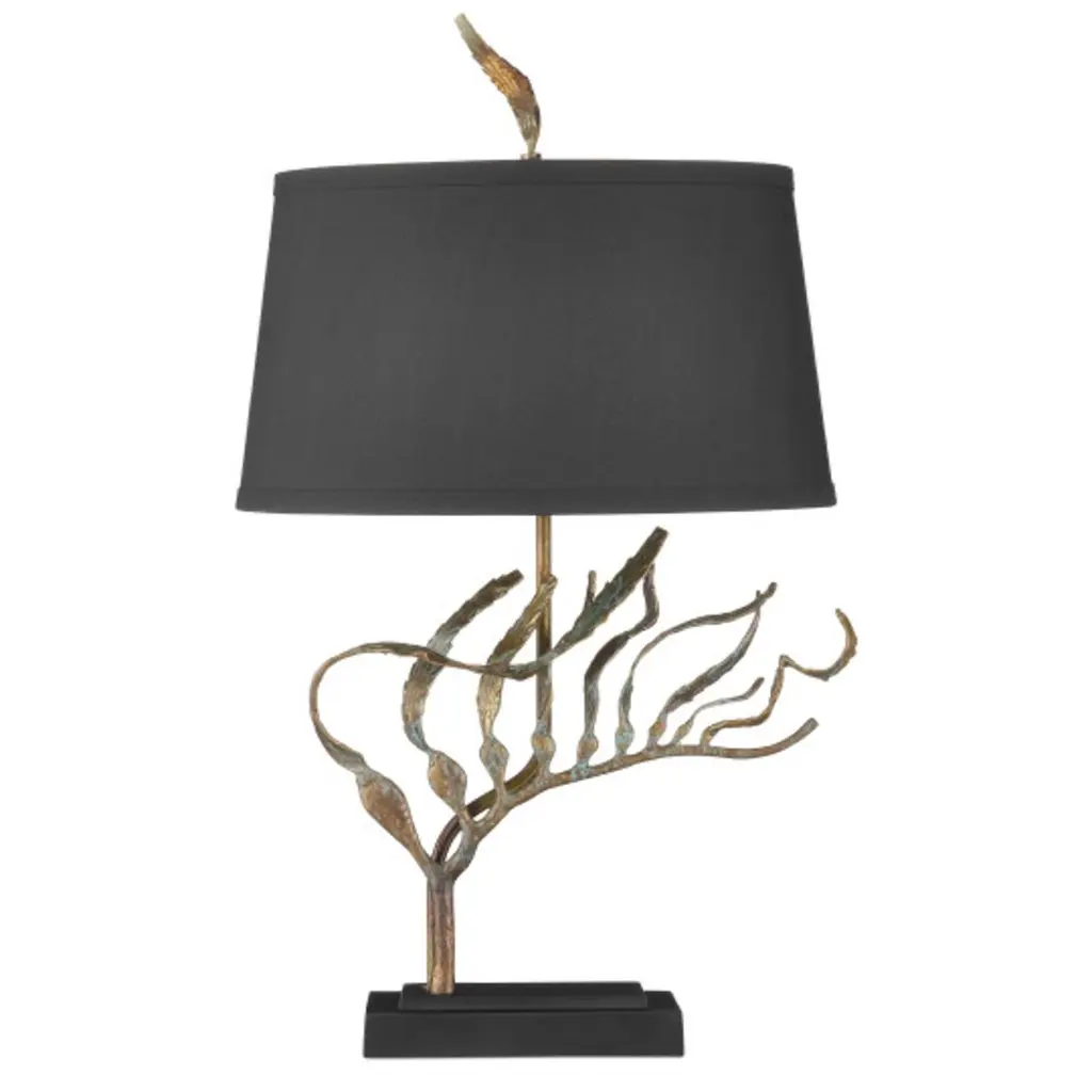 The Latissima Table Lamp is a sculptural design with fluid metal extensions that mimic the movement of kelp swaying beneath the sea, resting on a stacked base. Each piece reflects artisan craftsmanship and organic elegance. A matching kelp-like finial secures the shade, which is lined in fabric to cast a warm, ambient glow.