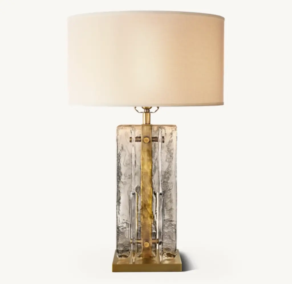 Crafted of solid cast glass, our Lattice collection's interlocking planes recall the geometric precision of the midcentury International Style. A study in repetition and rhythm, the linear form employs open space to lend a weightless feel. Gently rounded corners on the fluid, rippled panes subtly soften the outline, while a linen drum shade diffuses the light within. ALSO AVAILABLE IN SMOKE GLASSSHOP THE ENTIRE COLLECTION