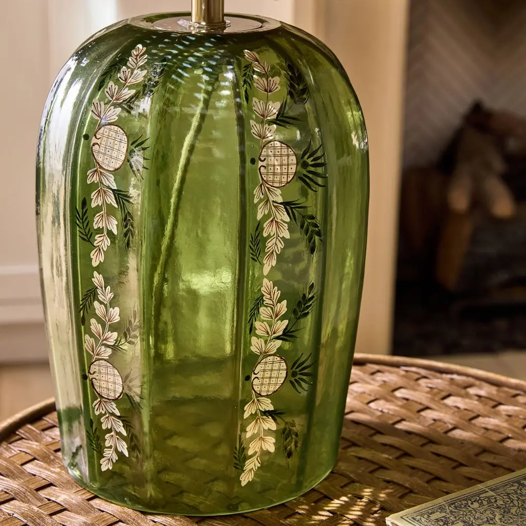 Gilded and glowing. Hand-painted by Indian artisans on soda glass, this lamp’s laurel-and-pineapple motif symbolizes wealth and welcome. Illuminate every day.