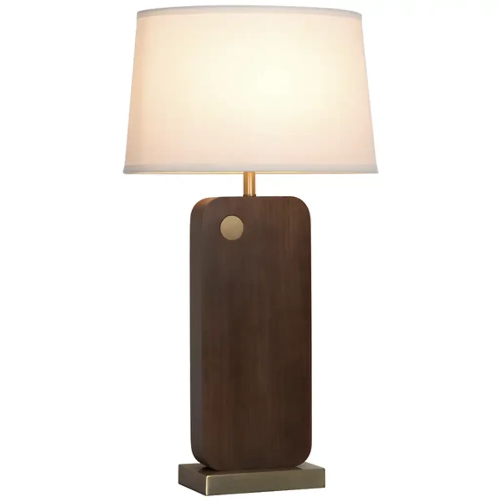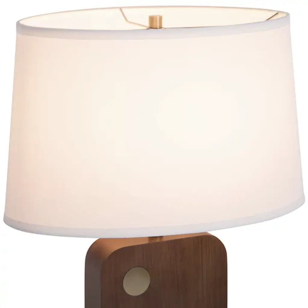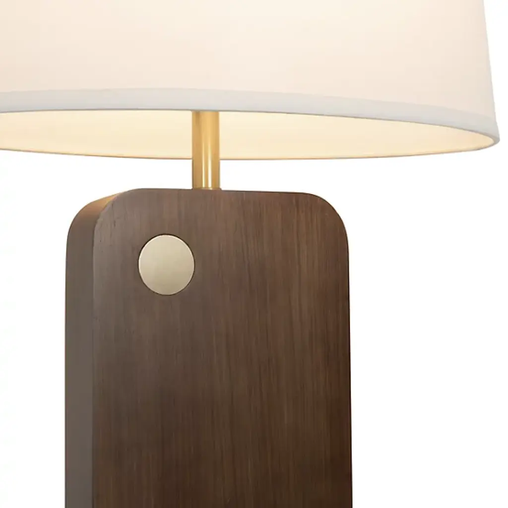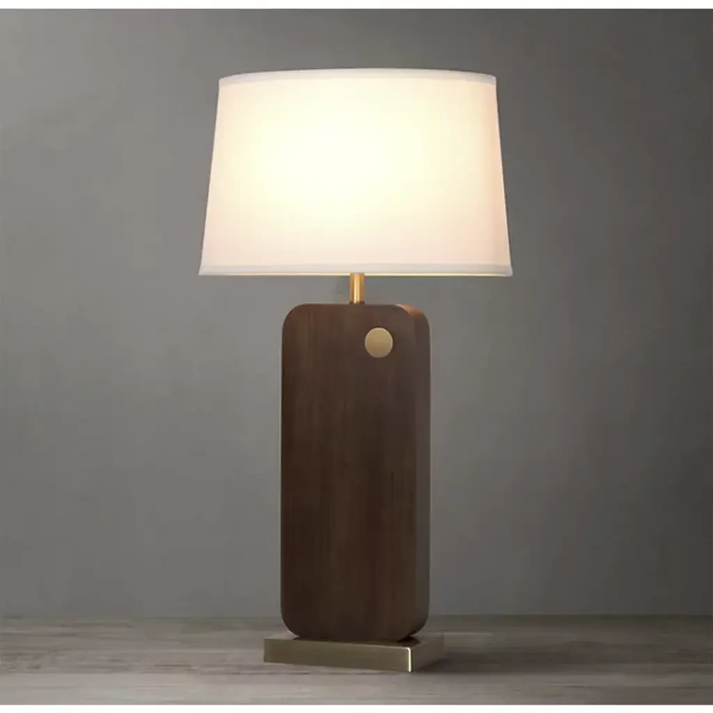 The Laurel Table Lamp from Nova of California introduces an innovative touch-sensitive control system integrated into its circular brass detail. The lamp's wooden body features architectural angles that create intriguing shadow patterns, while the rectangular linen shade provides balanced illumination. Smart technology enables voice control through various home automation platforms, and the lamp's proportions make it perfect for bedside tables and living spaces.