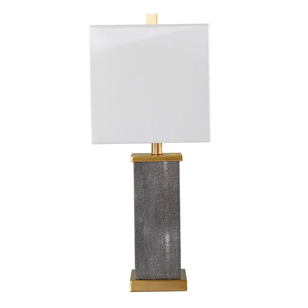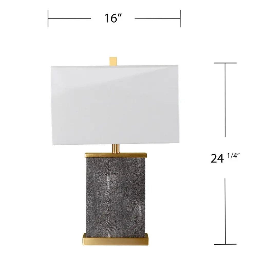 Dress up your decor with this textured table lamp. Black faux shagreen wraps the rectangular frame, while the gold base and hardware add a touch of metallic sparkle to your space. A white linen shade completes the cohesive design,crafting a crisp, classic feel in your family room or formal entryway. Complement your living room design or shine a light on your home office workspace with the transitional appeal of this table lamp.